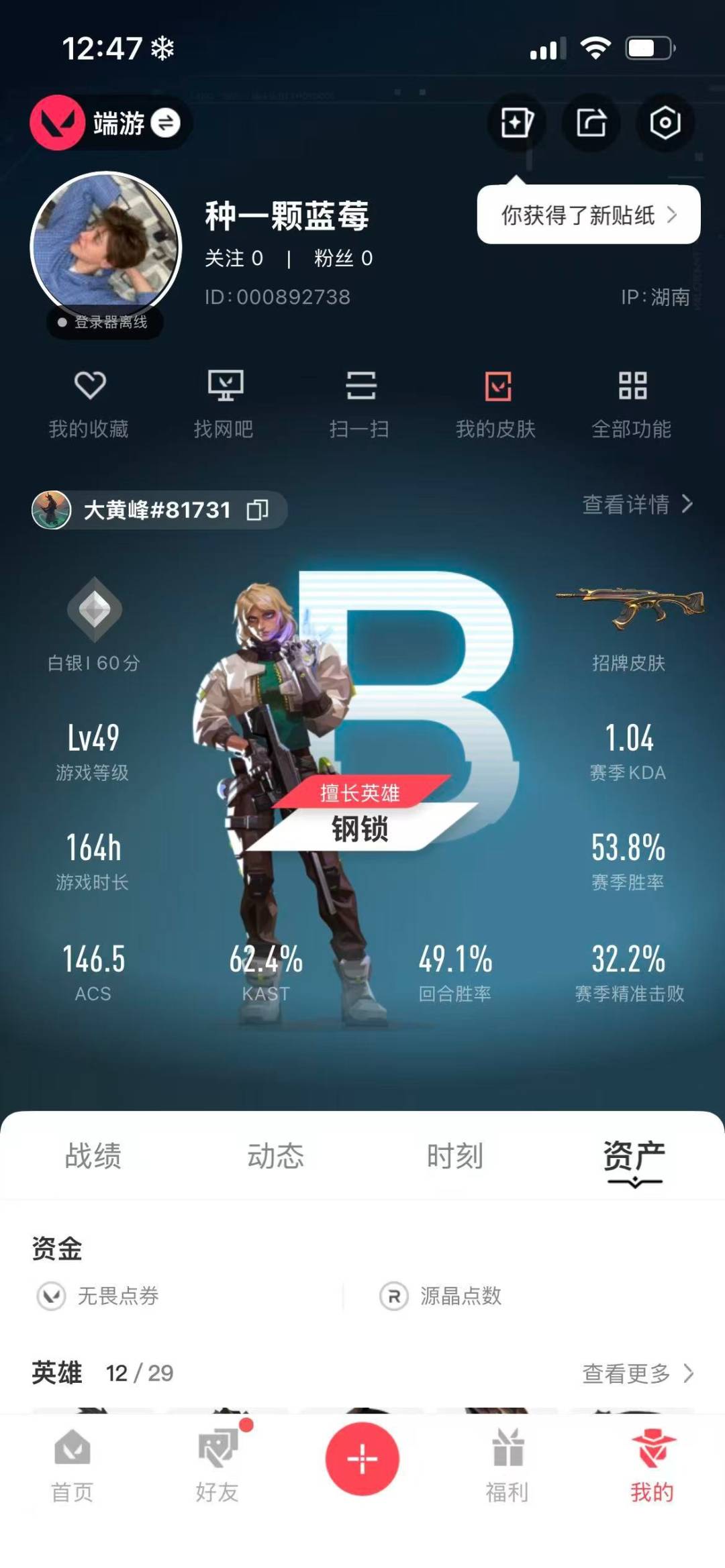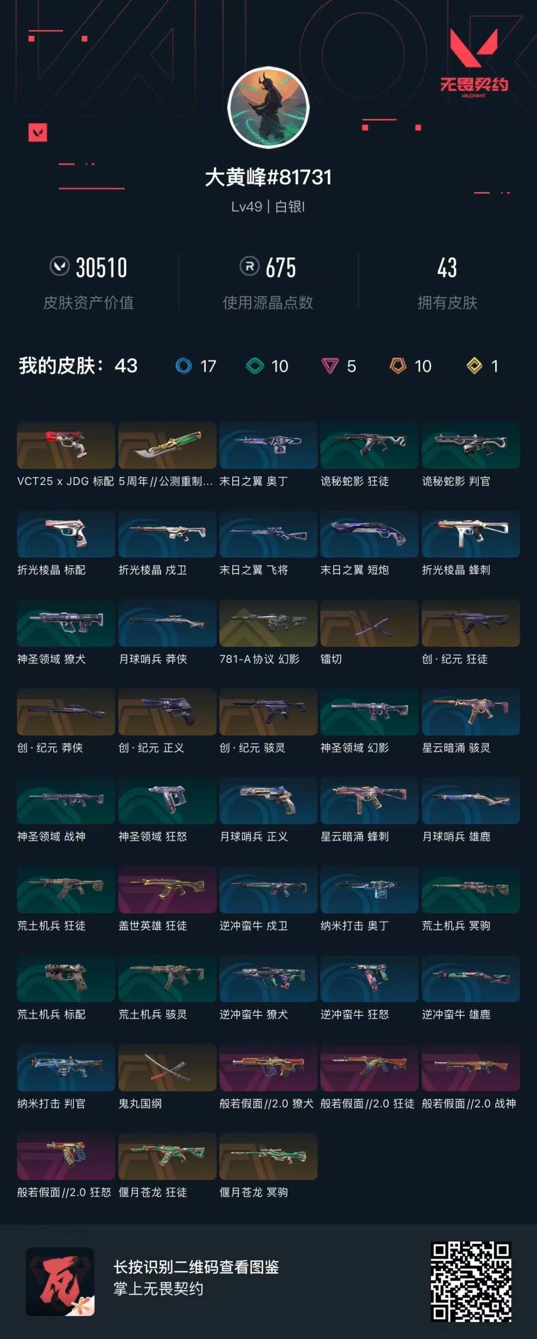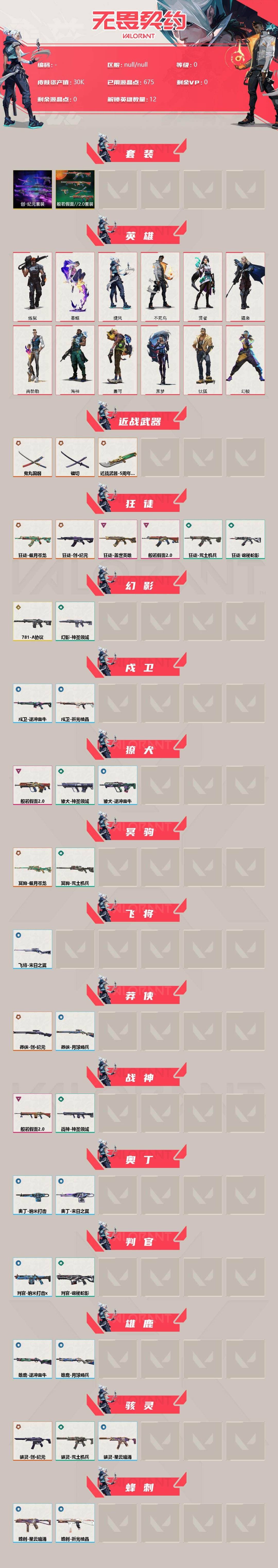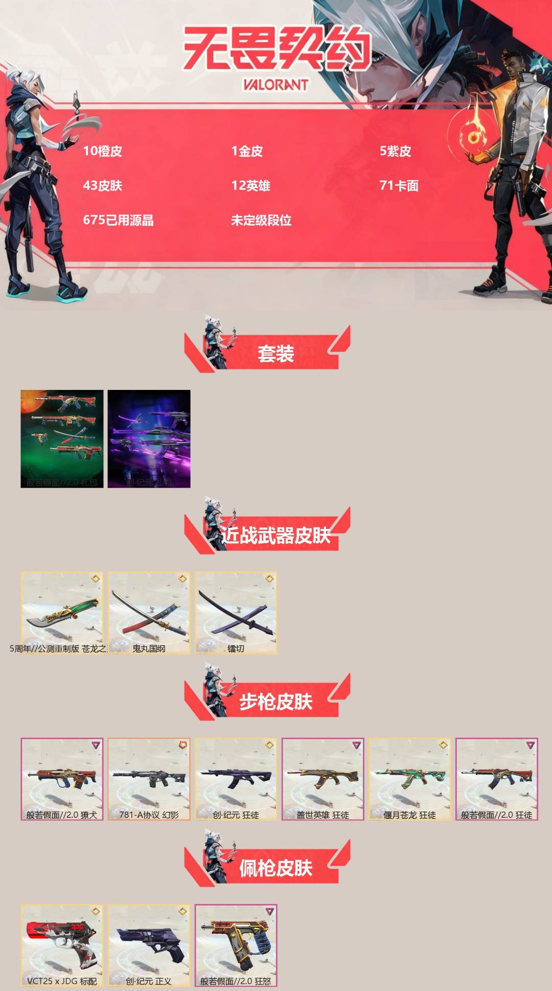 [13788212]10橙皮 1金皮 5紫皮 43皮肤 12英雄 71卡面 675已用源晶 未定级段位 【套装】:般若假面//2.0套装创·纪元套装 【近战武器皮肤】:镭切鬼丸国纲苍龙之刃 【佩呛皮肤】:标配-vct25xjdg狂怒-般若假面//2.0正义-创·纪元 【冲锋呛皮肤】:骇灵