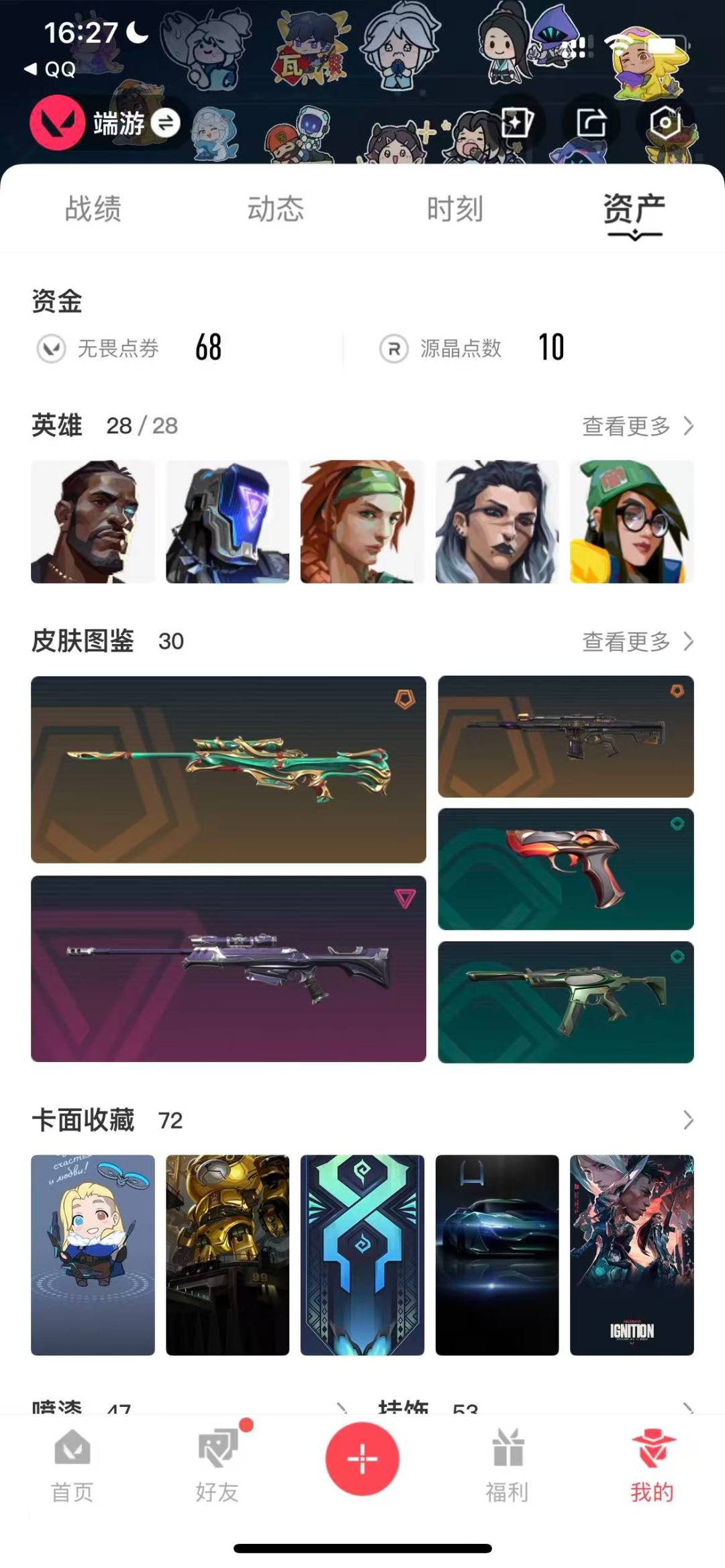 10橙皮 4紫皮 30皮肤 28英雄 72卡面 665已用源晶 未定级段位 【套装】:西部未来 【近战武器皮肤】:未来开拓者诡秘蛇影鬼丸国纲魔术火花 【佩呛皮肤】:正义-西部未来鬼魅-盖亚的复仇 【步呛皮肤】:幻影-西部未来狂徒-离子武器2.0幻影-混沌序曲2.0狂徒-冰点凝冻 【狙