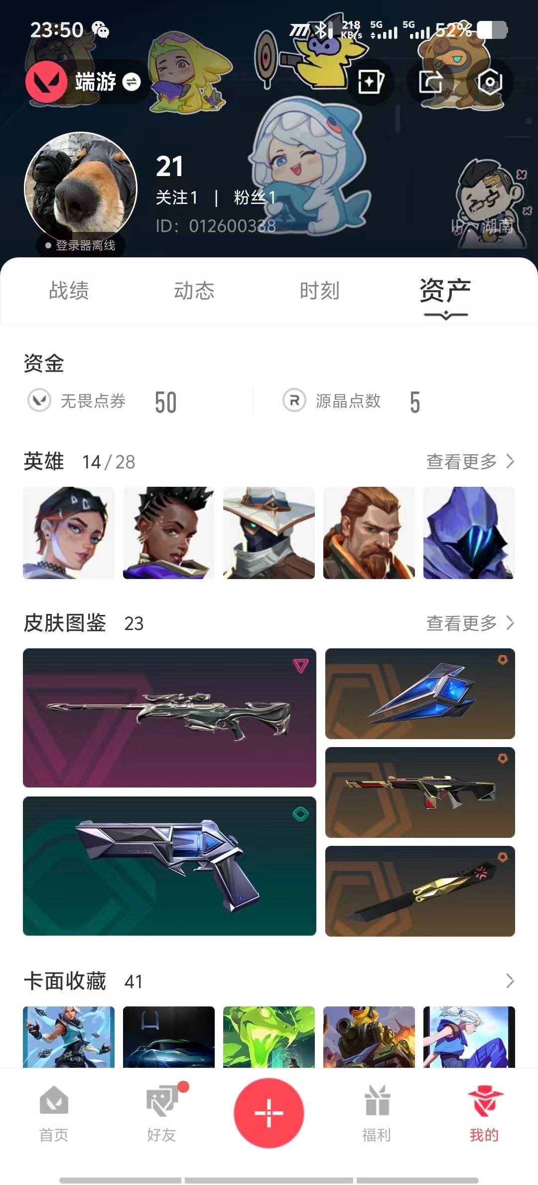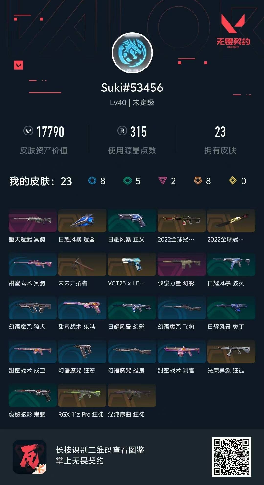 8橙皮 2紫皮 23皮肤 14英雄 41卡面 315已用源晶 未定级段位 【亮点皮肤】:幻影-2022全球冠军赛蝴蝶刀-2022全球冠军赛 【套装】:2022全球冠军赛 【近战武器皮肤】:未来开拓者 【佩呛皮肤】:标配-vct25xlev 【步呛皮肤】:狂徒-混沌序曲狂徒-光荣异象狂徒-rg