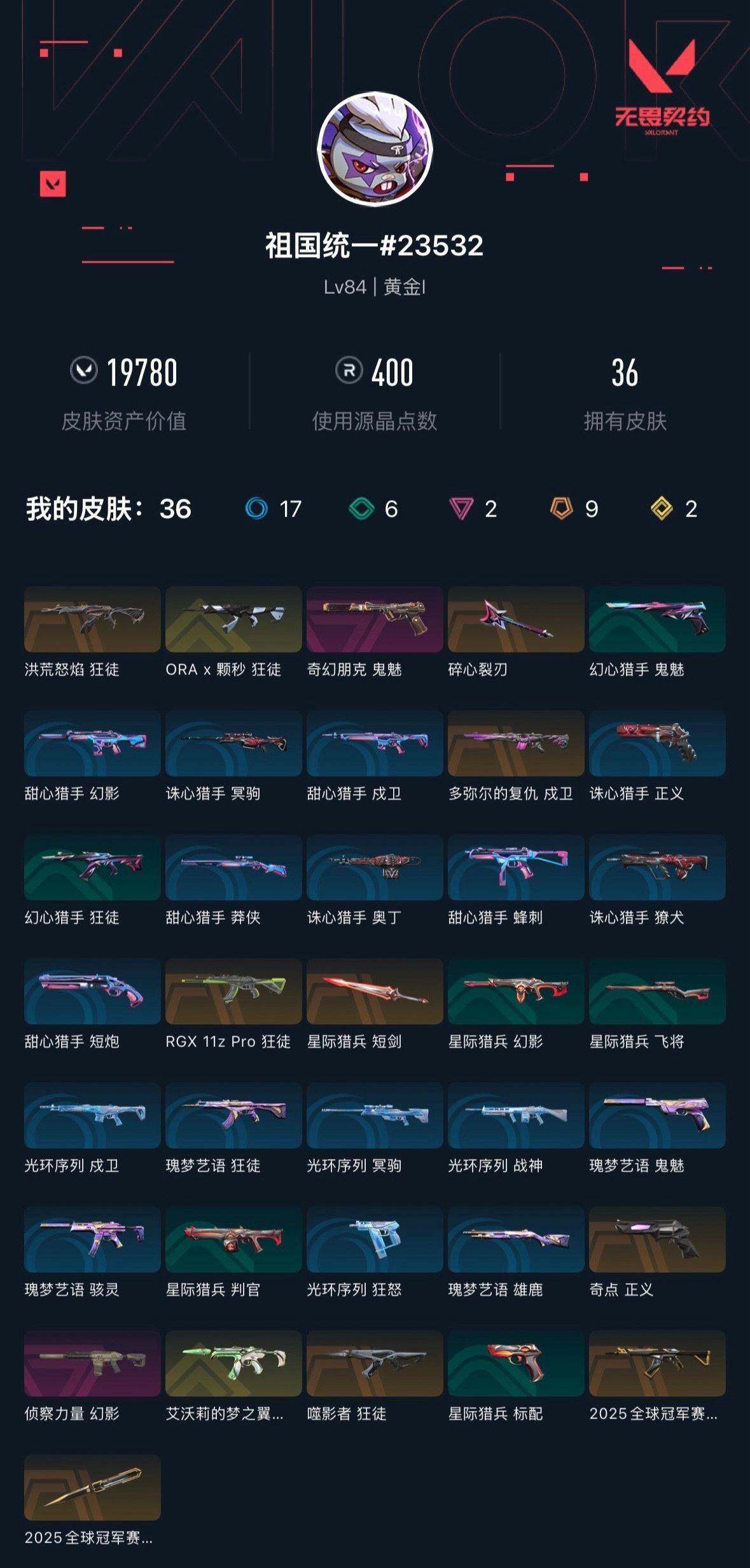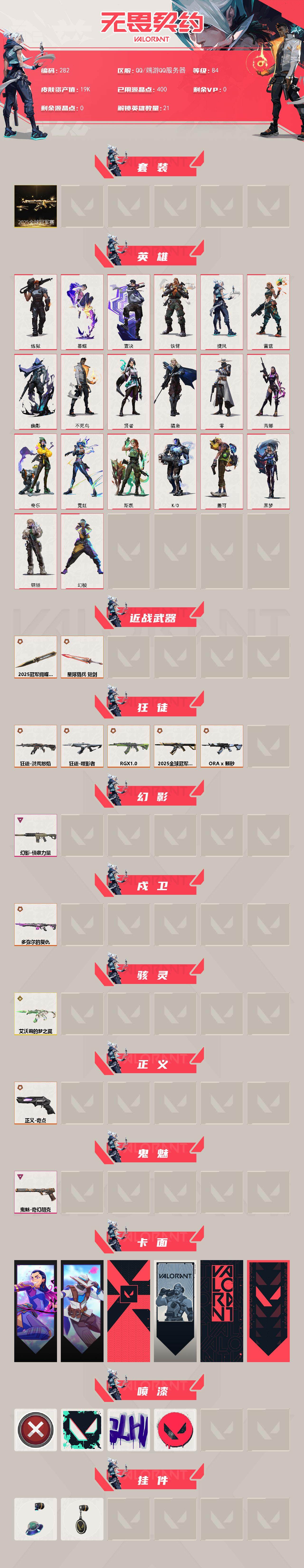 [14066158]【套装】:2025全球冠军赛套装 【英雄】:幻棱,炼狱,暮蝶,壹决,铁臂,捷风,雷兹,幽影,不死鸟,贤者,猎枭,零,芮娜,奇乐,霓虹,斯凯,k/o,盖可,黑梦,钢锁 【近战 武器】:近战武器-2025全球冠军赛 蝴蝶刀,近战武器-星际猎兵 短剑 【狂徒】:狂徒-2025全球冠军赛,狂徒-洪荒怒焰,狂徒-噬影者,狂徒-rgx 11z pro,狂徒-a x 颗秒 【幻影】:幻影-侦察力量 【戍卫】:戍卫-多弥尔的复仇 【骇灵】:骇灵-艾沃莉的梦之翼 【正义】:正义-奇点 【鬼魅】:鬼魅-奇幻朋克 【卡面】:无畏契约go!第一卷:芮娜 卡面,无畏契约go!第一卷:零 卡面,代号红色 卡面,新兵报到 卡面,v契约 卡面,无畏契约 卡面 【喷漆】:买装还是存钱 喷漆,胜利属于无畏契约 喷漆,glhf 喷漆,无畏契约 喷漆 【挂饰】:天外飞客 挂饰,无畏契约 纪念币 挂饰