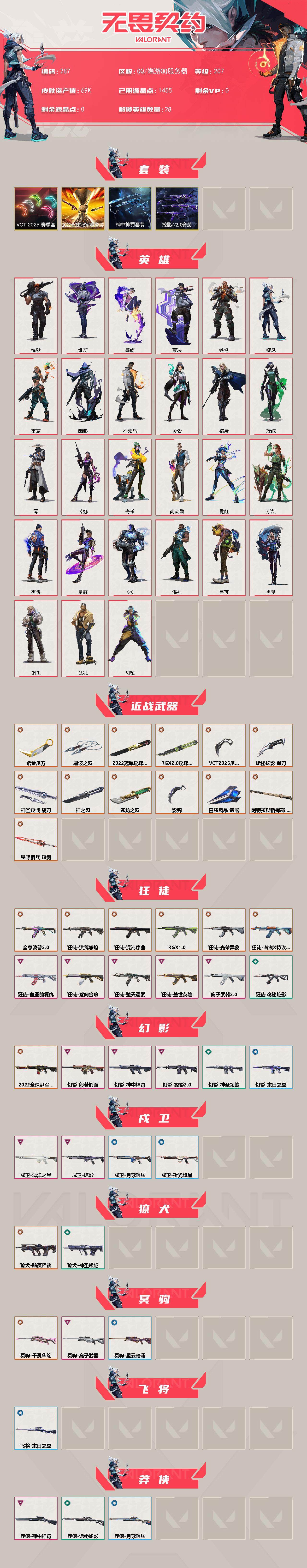 [14066790]【套装】:2022全球冠军赛套装,vct 2025 赛季套装,神中神罚套装,掠影//2.0套装 【英雄】:幻棱,炼狱,维斯,暮蝶,钛狐,壹决,铁臂,捷风,雷兹,幽影,不死鸟,贤者,猎枭,蝰蛇,零,芮娜,奇乐,尚勃勒,霓虹,斯凯,夜露,星礈,k/o,海神,盖可,黑梦,钢锁 【近战 武器】:近战武器-2022全球冠军赛 蝴蝶刀,近战武器-影钩,近战武器-5周年//公测重制版 苍龙之刃,近战武器-神之刃,近战武器-rgx 11z pro//2.0 蝴蝶刀,近战武器-vct 2025 爪刀,近战武器-紫金爪刀,近战武器-黑波之刃,近战武器-诡秘蛇影 军刀,近战武器-神圣领域 战刀,近战武器-日耀风暴 遗器,近战武器-阿特拉斯指挥部 甩棍,近战武器-星际猎兵 短剑 【狂徒】:狂徒-洪荒怒焰,狂徒-混沌序曲,狂徒-全息波普//2.0,狂徒-rgx 11z pro,狂徒-光荣异象,狂徒-滋滋x特攻队,狂徒-堕天遗武,狂徒-盖世英雄,狂徒-盖亚的复仇,狂徒-紫阙金琅,狂徒-离子武器//2.0,狂徒-诡秘蛇影 【幻影】:幻影-2022全球冠军赛,幻影-般若假面,幻影-神中神罚,幻影-掠影//2.0,幻影-神圣领域,幻影-末日之翼 【戍卫】:戍卫-掠影,戍卫-海洋之星,戍卫-月球哨兵,戍卫-折光棱晶 【獠犬】:獠犬-黯夜怪谈,獠犬-神圣领域 【冥驹】:冥驹-千灵华绽,冥驹-离子武器,冥驹-星云暗涌 【飞将】:飞将-末日之翼 【莽侠】:莽侠-神中神罚,莽侠-诡秘蛇影,莽侠-月球哨兵 【战神】:战神-离子武器//2.0,战神-神圣领域 【奥丁】:奥丁-掠影//2.0,奥丁-末日之翼 【判官】:判官-诡秘蛇影 【雄鹿】:雄鹿-月球哨兵 【骇灵】:骇灵-神中神罚,骇灵-掠影//2.0,骇灵-星云暗涌 【蜂刺】:蜂刺-星云暗涌,蜂刺-折光棱晶 【标配】:标配-浪漫雪国,标配-折光棱晶 【vct手呛】:标配-vct25 x 100t 【正义】:正义-西部未来,正义-月球哨兵 【鬼魅】:鬼魅-天界神兵,鬼魅-掠影//2.0,鬼魅-诡秘蛇影,鬼魅-星云暗涌 【狂怒】:狂怒-神中神罚,狂怒-神圣领域 【短炮】:短炮-末日之翼 【卡面】:纳米打击 卡面,瓦娃脸雪糕 p2 卡面,南瓜盛典 卡面,热舞环节 卡面,红鳞松叶 卡面,clutch 卡面,采蜜小蜂队 卡面,流星兵团 卡面,沙雕爆能器 卡面,无畏契约