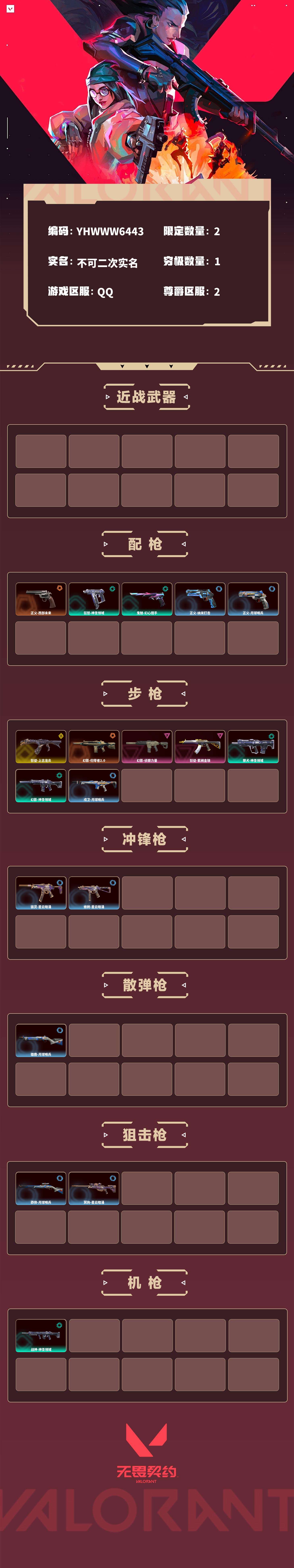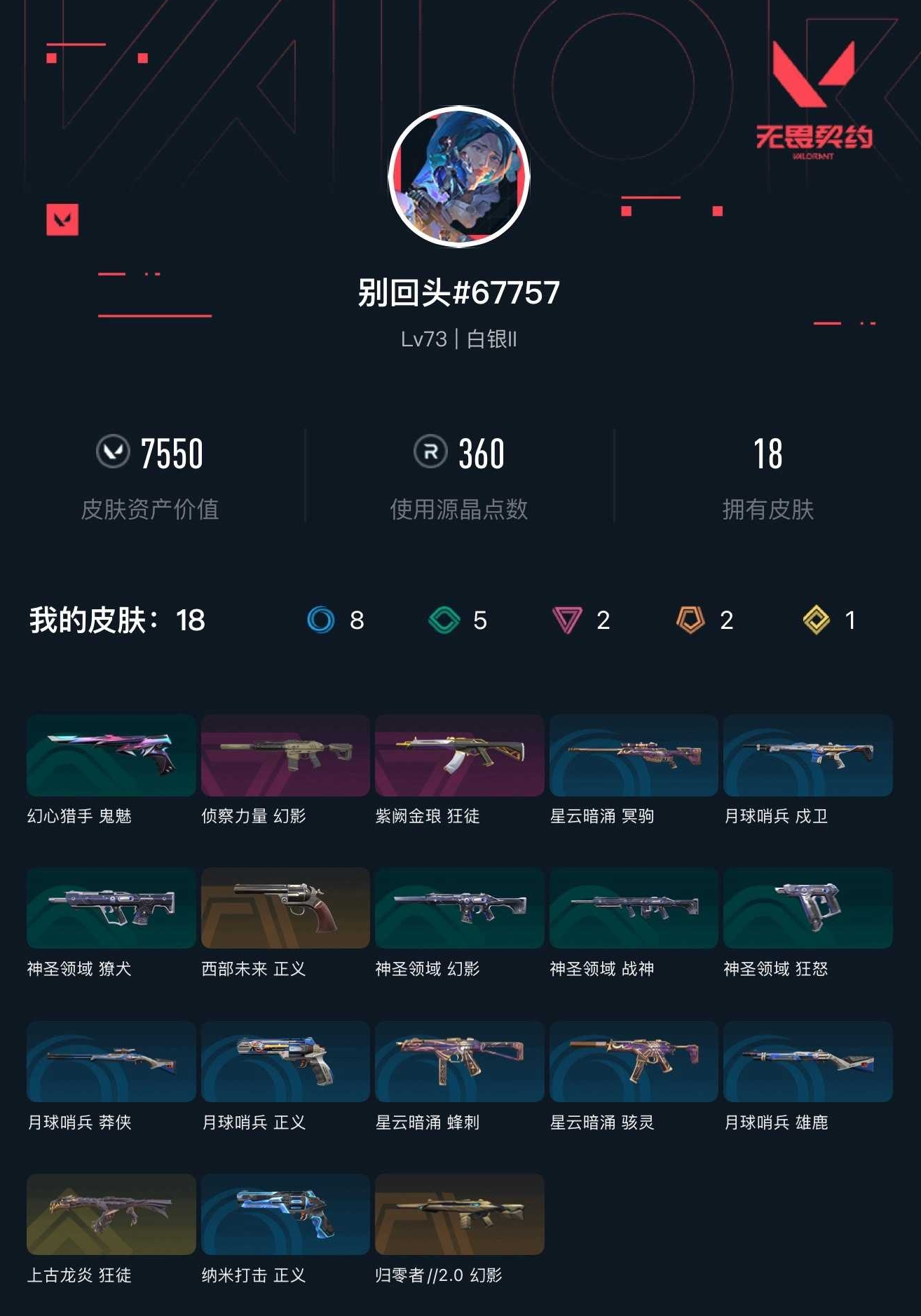 【无畏契约】【yhwww6443】等级:73,已用无畏点7550,已用源晶点360,紫皮:幻影-侦察力量|狂徒-紫阙金琅__段位:白银__蓝皮:正义-纳米打击|骇灵-星云暗涌|正义-月球哨兵|莽侠-月球哨兵|戍卫-月球哨兵|雄鹿-月球哨兵|冥驹-星云暗涌|蜂刺-星云暗涌__橙皮:幻影-归零者2.0|正义-西部未来__金皮:狂徒-上古龙炎__绿皮:獠犬-神圣领域|狂怒-神圣领域|战神-神圣领域|幻影-神圣领域|鬼魅-幻心猎手__英雄:尚勃勒|黑梦|斯凯|暮蝶|盖可|壹决|k/o|幽影|夜露|钢锁|海神|奇乐|炼狱|铁臂|贤者|猎枭|钛狐|芮娜|捷风|蝰蛇|不死鸟|幻棱|雷兹|禁灭