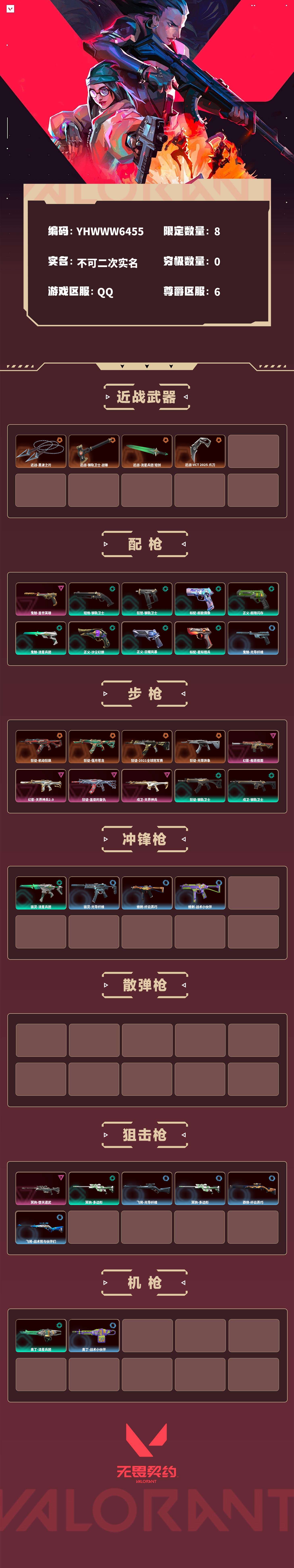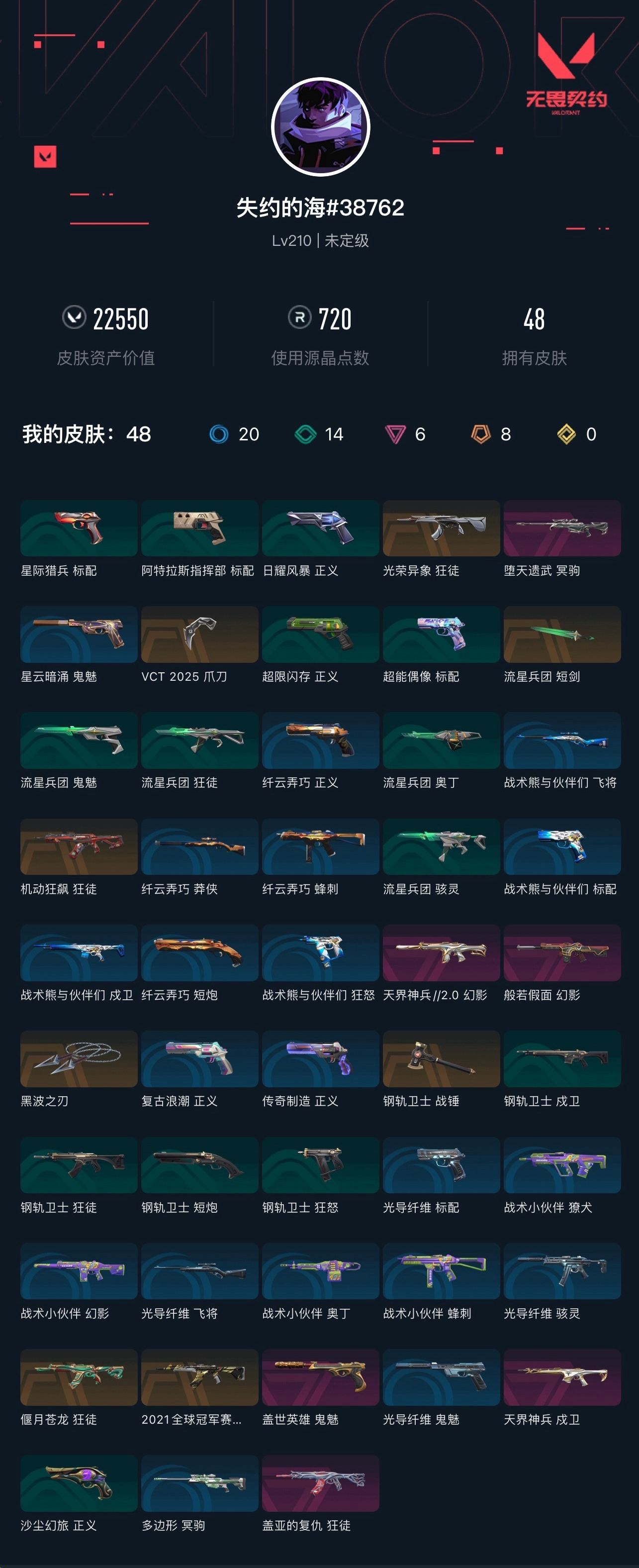 【无畏契约】【yhwww6455】等级:210,已用无畏点22550,已用源晶点720,橙皮:近战-黑波之刃|近战-钢轨卫士 战锤|近战-流星兵团 短剑|狂徒-机动狂飙|狂徒-偃月苍龙|狂徒-2021全球冠军赛|近战-vct 2025 爪刀|狂徒-光荣异象__紫皮:鬼魅-盖世英雄|幻影-般若假面|幻影-天界神兵2.0|狂徒-盖亚的复仇|冥驹-堕天遗武|戍卫-天界神兵__绿皮:短炮-钢轨卫士|狂怒-钢轨卫士|冥驹-多边形|狂徒-钢轨卫士|戍卫-钢轨卫士|标配-超能偶像|正义-超限闪存|骇灵-流星兵团|鬼魅-流星兵团|狂徒-流星兵团|奥丁-流星兵团|正义-沙尘幻旅|正义-日耀风暴|标配-星际猎兵__蓝皮:鬼魅-光导纤维|飞将-光导纤维|标配-光导纤维|骇灵-光导纤维|正义-复古浪潮|鬼魅-星云暗涌|正义-传奇制造|冥驹-多边形|莽侠-纤云弄巧|正义-纤云弄巧|短炮-纤云弄巧|蜂刺-纤云弄巧|蜂刺-战术小伙伴|幻影-战术小伙伴|獠犬-战术小伙伴|奥丁-战术小伙伴|飞将-战术熊与伙伴们|狂怒-战术熊与伙伴们|戍卫-战术熊与伙伴们|标配-战术熊与伙伴们|标配-阿特拉斯指挥部__段位:未定级__英雄:尚勃勒|维斯|黑梦|斯凯|暮蝶|盖可|霓虹|壹决|星礈|k/o|幽影|夜露|钢锁|海神|奇乐|炼狱|铁臂|贤者|猎枭|钛狐|芮娜|零|捷风|蝰蛇|不死鸟|幻棱|雷兹|禁灭
