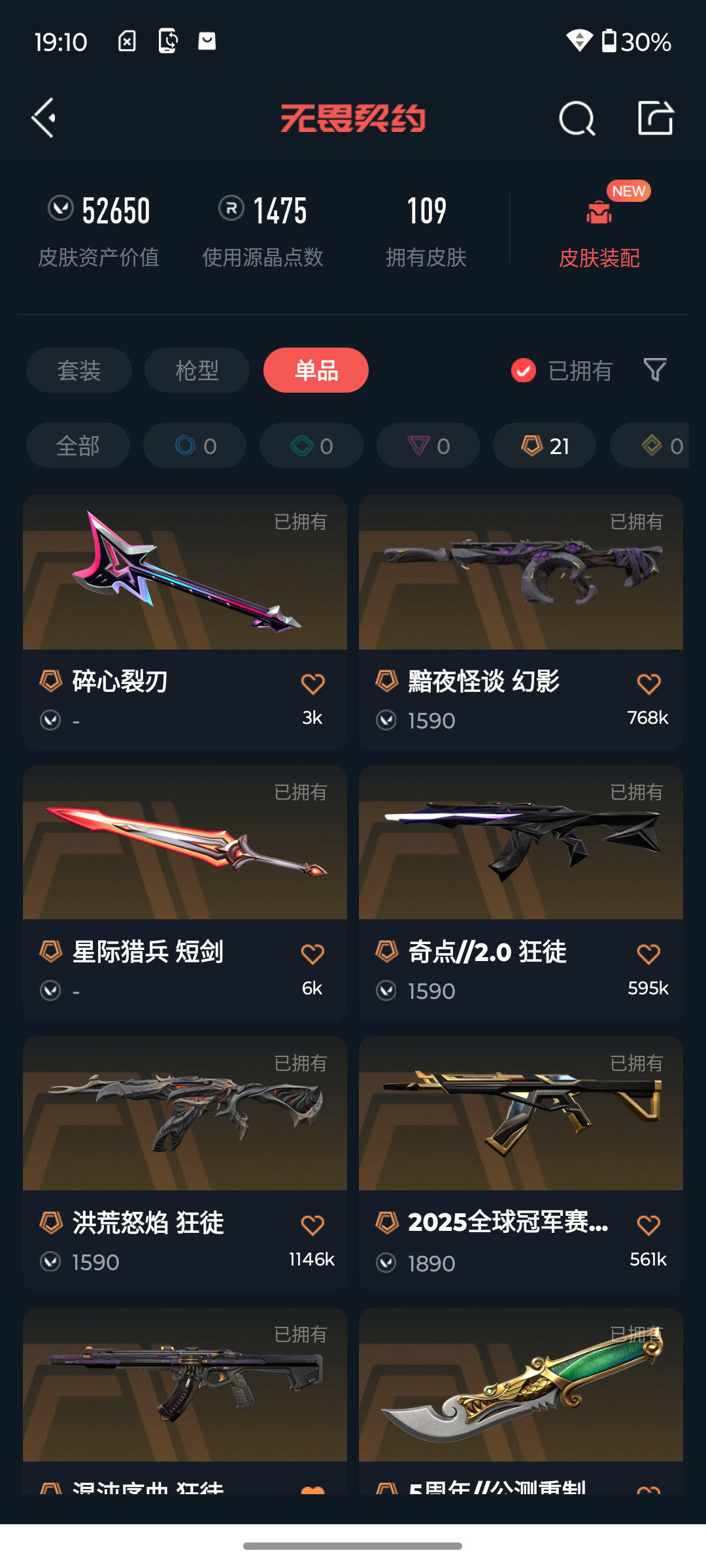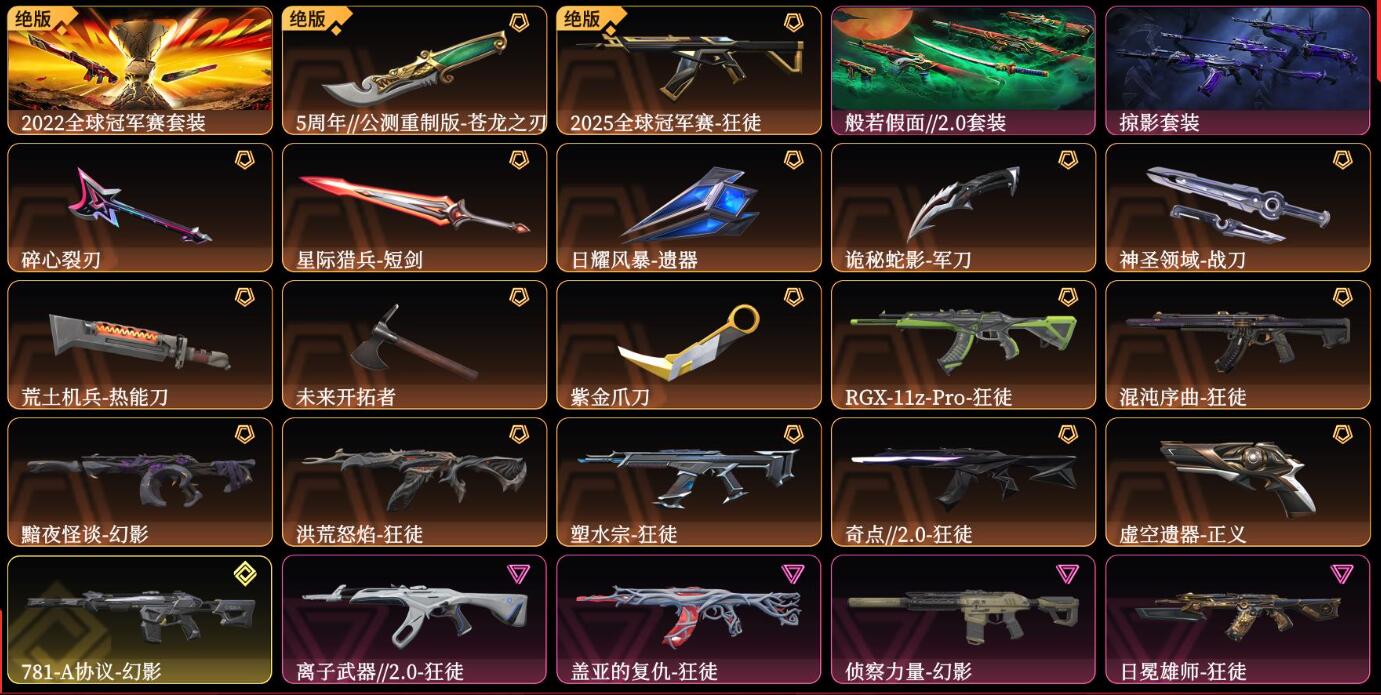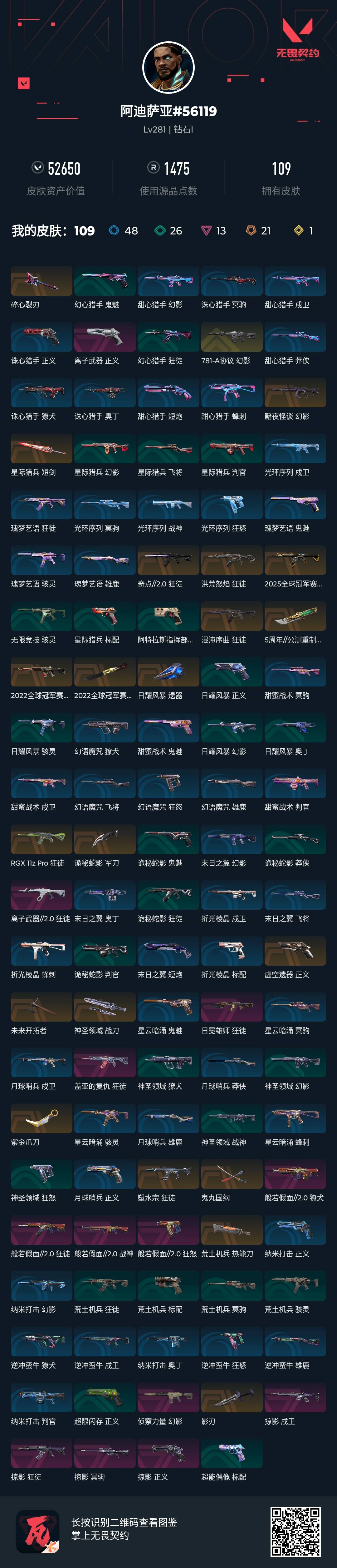 [14081128]l192082 (2022全球冠军赛套装/般若假面2.0套装/掠影套装)无畏契约/281级/钻石i/28英雄/109皮肤/资产52650/已使用r点1475/剩余r点30/2022全球冠军赛-幻影,2022全球冠军赛-蝴蝶刀,般若假面//2.0-狂徒,般若假面//2.0-獠犬,般若假面//2.0-战神,般若假面//2.0-狂怒,鬼丸国纲,掠影-狂徒,掠影-冥驹,掠影-戍卫,掠影-正义,影刃,碎心裂刃,星际猎兵-短剑,5周年//公测重制版-苍龙之刃,日耀风暴-遗器,诡秘蛇影-军刀,神圣领域-战刀,荒土机兵-热能刀,未来开拓者,紫金爪刀,rgx-11z-pro-狂徒,混沌序曲-狂徒,黯夜怪谈-幻影,洪荒怒焰-狂徒,塑水宗-狂徒,奇点//2.0-狂徒,2025全球冠军赛-狂徒,781-a协议-幻影,离子武器//2.0-狂徒,盖亚的复仇-狂徒,侦察力量-幻影,日冕雄师-狂徒,虚空遗器-正义,离子武器-正义