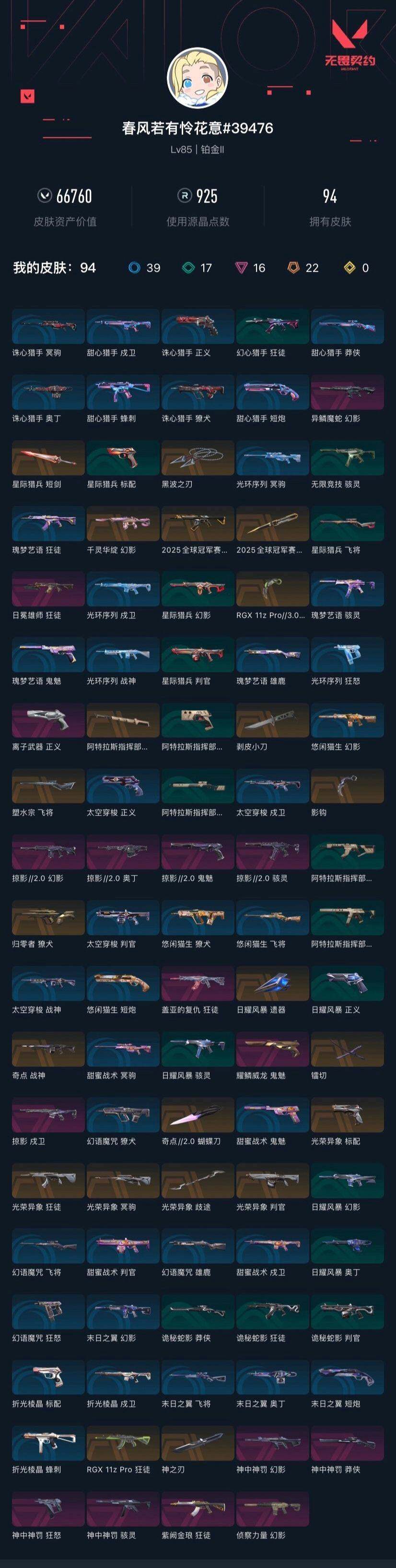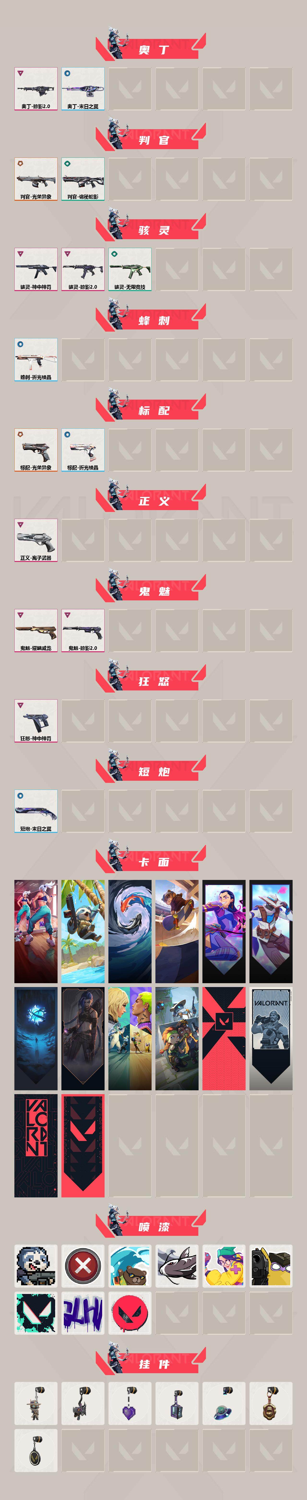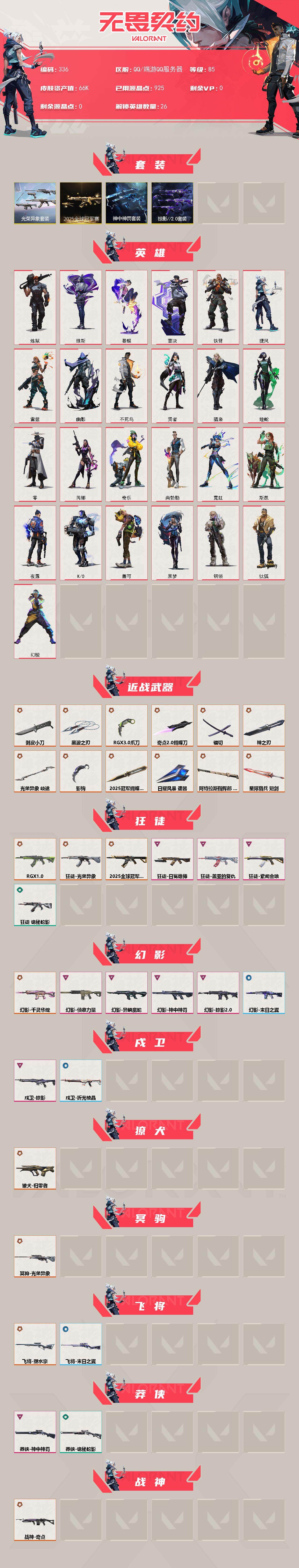 [14109509]【套装】:2025全球冠军赛套装,光荣异象套装,神中神罚套装,掠影//2.0套装 【英雄】:幻棱,炼狱,维斯,暮蝶,钛狐,壹决,铁臂,捷风,雷兹,幽影,不死鸟,贤者,猎枭,蝰蛇,零,芮娜,奇乐,尚勃勒,霓虹,斯凯,夜露,k/o,盖可,黑梦,钢锁 【近战 武器】:近战武器-2025全球冠军赛 蝴蝶刀,近战武器-影钩,近战武器-光荣异象 歧途,近战武器-神之刃,近战武器-剥皮小刀,近战武器-奇点//2.0 蝴蝶刀,近战武器-rgx 11z pro//3.0 爪刀,近战武器-黑波之刃,近战武器-镭切,近战武器-日耀风暴 遗器,近战武器-阿特拉斯指挥部 甩棍,近战武器-星际猎兵 短剑 【狂徒】:狂徒-2025全球冠军赛,狂徒-rgx 11z pro,狂徒-光荣异象,狂徒-盖亚的复仇,狂徒-日冕雄师,狂徒-紫阙金琅,狂徒-诡秘蛇影 【幻影】:幻影-千灵华绽,幻影-侦察力量,幻影-异鳞魔蛇,幻影-神中神罚,幻影-掠影//2.0,幻影-末日之翼 【戍卫】:戍卫-掠影,戍卫-折光棱晶 【獠犬】:獠犬-归零者 【冥驹】:冥驹-光荣异象 【飞将】:飞将-塑水宗,飞将-末日之翼 【莽侠】:莽侠-神中神罚,莽侠-诡秘蛇影 【战神】:战神-奇点 【奥丁】:奥丁-掠影//2.0,奥丁-末日之翼 【判官】:判官-光荣异象,判官-诡秘蛇影 【骇灵】:骇灵-神中神罚,骇灵-掠影//2.0,骇灵-无限竞技 【蜂刺】:蜂刺-折光棱晶 【标配】:标配-光荣异象,标配-折光棱晶 【正义】:正义-离子武器 【鬼魅】:鬼魅-耀鳞威龙,鬼魅-掠影//2.0 【狂怒】:狂怒-神中神罚 【短炮】:短炮-末日之翼 【卡面】:热舞环节 卡面,树懒大作战 卡面,红鳞松叶 卡面,clutch 卡面,无畏契约go!第一卷:芮娜 卡面,无畏契约go!第一卷:零 卡面,无垠星环 卡面,《双城之战》金克丝 卡面,钢锁vs盖可 卡面,别冒尖 卡面,代号红色 卡面,新兵报到 卡面,v契约 卡面,无畏契约 卡面 【喷漆】:审判之爪 喷漆,买装还是存钱 喷漆,酷熊冲浪 喷漆,松叶 喷漆,无畏契约go!第一卷:奇乐 喷漆,放下武器 喷漆,胜利属于无畏契约 喷漆,glhf 喷漆,无畏契约 喷漆 【挂饰】:无畏契约go!第一卷 零 挂饰,鱼骨头 挂饰,薰衣草之心 挂饰,动力机箱 挂饰,天外飞客 挂饰,海豹的认可 挂饰,无畏契约 纪念币 挂饰