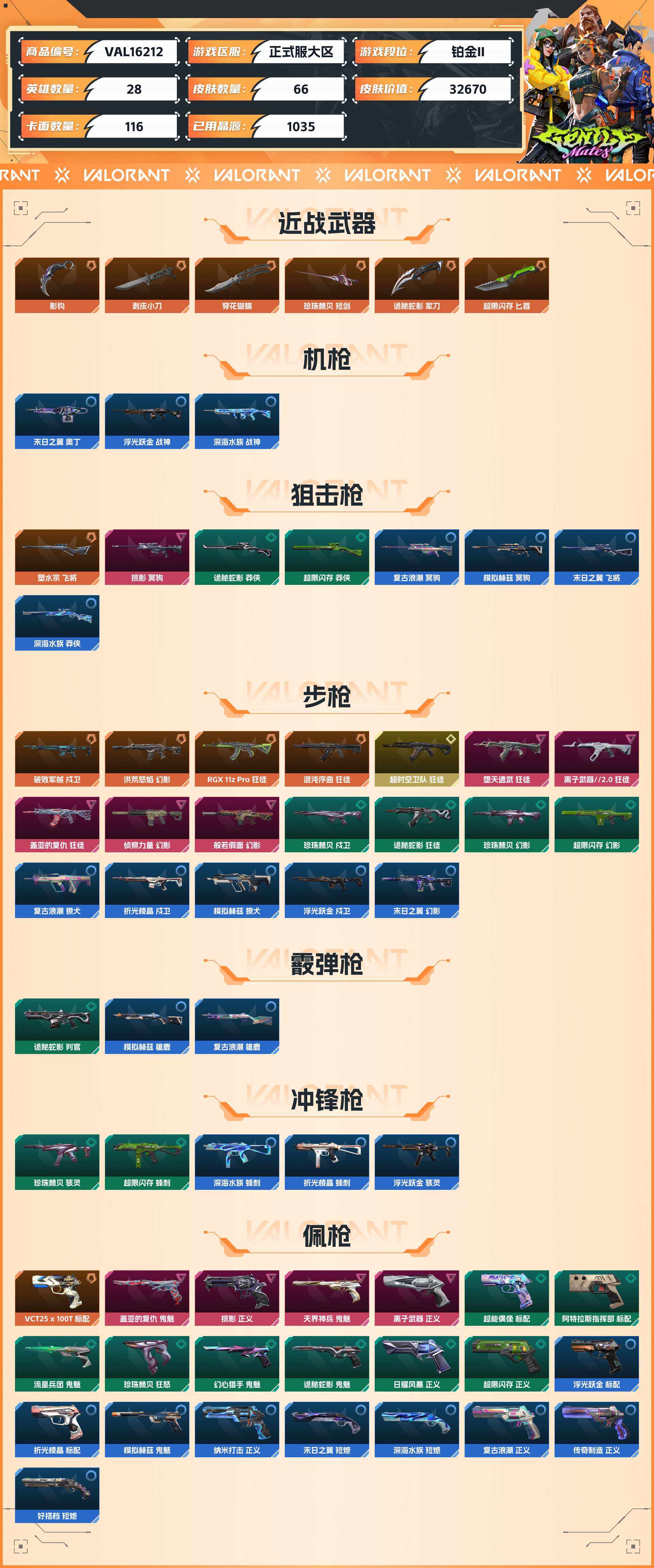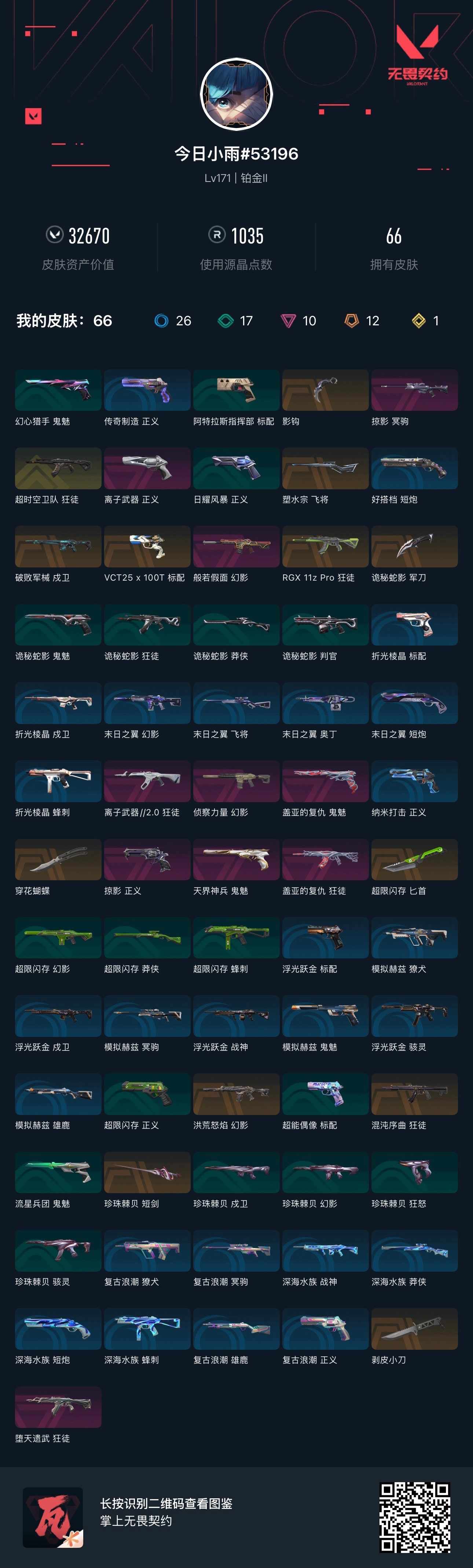 val16212|铂金ii 皮肤价值32670 已用晶源1035 皮肤数量66 终极1 限定12 卓越10 奢华17 精选26【拥有皮肤】影钩剥皮小刀穿花蝴蝶珍珠棘贝 短剑诡秘蛇影 军刀超限闪存 匕首塑水宗