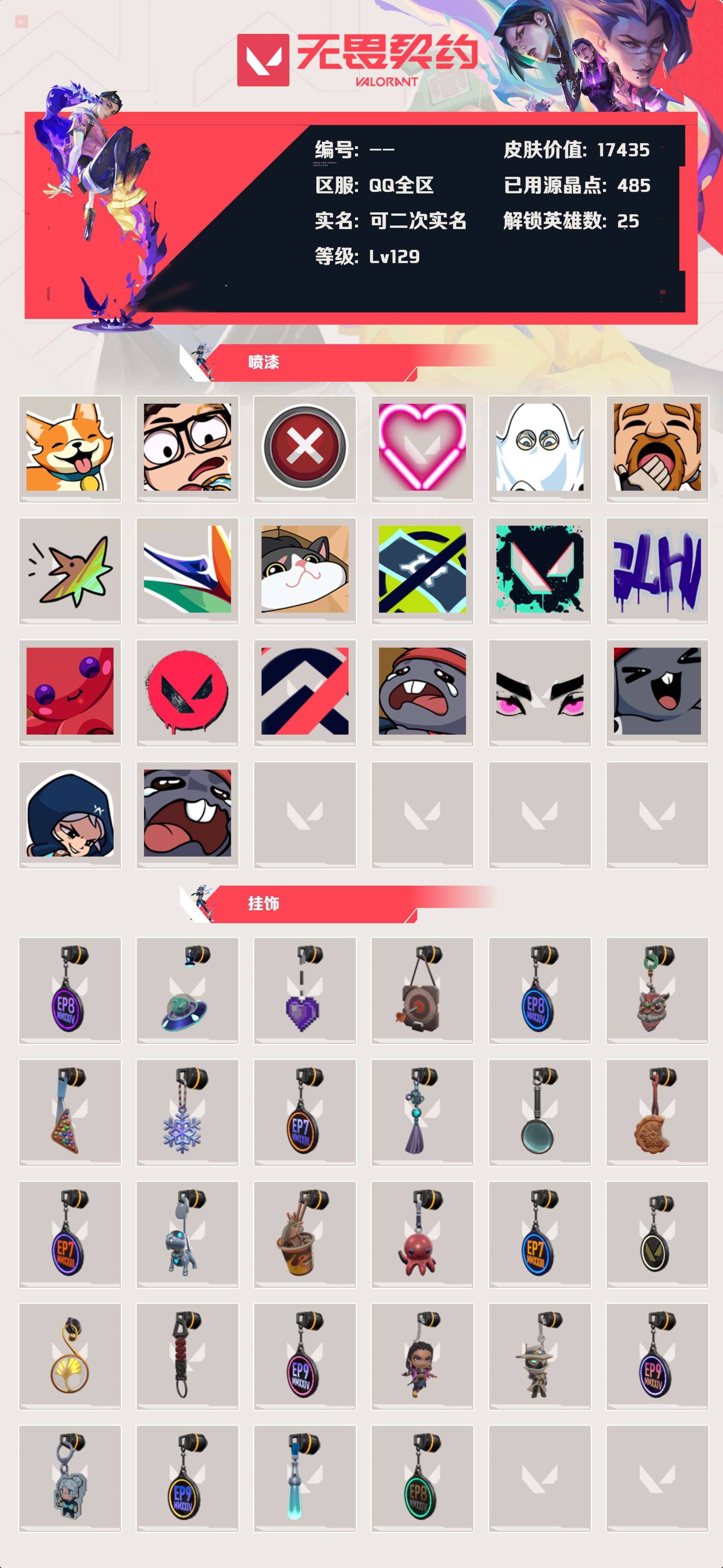 [14116324]等级:lv129 | 铂金iii/ 已用源晶点:485/ 皮肤价值:17435/ 英雄数:25/ 【英雄】 铁臂 捷风 雷兹 幽影 炼狱 不死鸟 贤者 猎枭 蝰蛇 零 芮娜 奇乐 斯凯 夜露 星礈 k/o 尚勃勒 霓虹 盖可 钢锁 壹决 暮蝶 维斯 幻棱 【套装】 紫阙金琅套装(紫阙金琅狂徒) 天界神兵套装(天界神兵戍卫) 无畏启程套装(超能冲撞标配) 塑水宗套装(塑水宗狂徒) 堕天遗武套装(堕天遗武冥驹) 异形猎人(剥皮小刀) 天界神兵//2.0(天界神兵//2.0幻影) 英雄之选 礼包(天界神兵戍卫堕天遗武冥驹紫阙金琅狂徒) 离子武器(离子武器正义) 光明哨兵//2.0(光明哨兵//2.0幻影) 混沌序曲 礼包(混沌序曲蜂刺) 2022全球冠军赛套装(2022全球冠军赛幻影) rgx 11z pro 礼包(rgx11zpro狂徒) 【近战武器】 近战武器-剥皮小刀 【佩呛 鬼魅】 鬼魅-幻心猎手 鬼魅-数码咒术 【佩呛 正义】 正义-离子武器 【佩呛 标配】 标配-阿特拉斯指挥部 标配-星际猎兵 标配-超能冲撞 标配-超能冲撞 【冲锋呛 蜂刺】 蜂刺-混沌序曲 【步呛 戍卫】 戍卫-天界神兵 戍卫-天界神兵 【步呛 幻影】 幻影-2022全球冠军赛 幻影-天界神兵//2.0 幻影-光明哨兵//2.0 【步呛 狂徒】 狂徒-rgx 11z pro 狂徒-紫阙金琅 狂徒-紫阙金琅 狂徒-塑水宗 【狙击呛 冥驹】 冥驹-堕天遗武 【卡面】 我眼中的世界 精灵大战 南瓜盛典 正义的化身 无畏契约:芮娜 时间到 最高舞台 梦幻奶茶 源能反应 零点嗅探设计图 逮到一个 清除名单 无畏契约go!第一卷:芮娜 无畏契约go!第一卷:零 《双城之战》金克丝 红鳞松叶 完美调谐 暗呛 "luie" 夯实根基 铁臂设计图 军团 手臂摔跤 幽影行者 友军火力 纳米炸弹 冰淇淋店 战术过马路 当心坠落 代号红色 冠军小队 爆弹机器人设计图 新兵报到 v契约 无畏契约 【喷漆】 布鲁诺的快乐舞 新潮流 买装还是存钱 蕊形灯 凌空惊吓 老铁困了 简笔画小队 纸鹤花 纸箱小猫 没有资金 胜利属于无畏契约 glhf 章鱼小弟 无畏契约 控场勿近 熊抱 睥睨 超级粉丝 捷风差距 我的刀呢? 【挂饰】 第八季//第二幕 天外飞客 薰衣草之心 瞄这里 第八季//第一幕 好运之舞 彩糖面包 冬日絮语 第七季//第三幕 幸运中国结 案件调查 中秋月饼 第七季//第二幕 机器伙伴 嗦面 章鱼小弟 第七季:第一幕 无畏契约 公测银杏 伞绳 第九季//第三幕 无畏契约go!第一卷 无畏契约go!第一卷 第九季//第二幕 袖珍捷风 第九季//第一幕 荧光棒 第八季//第三幕