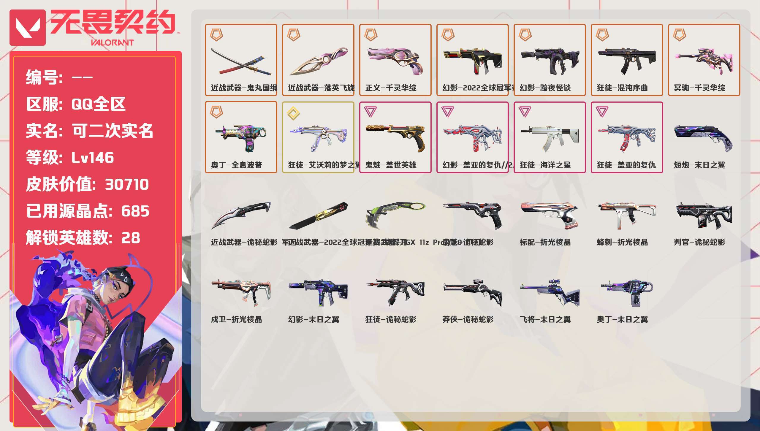[14116660]等级:lv146 | 黄金iii/ 已用源晶点:685/ 皮肤价值:30710/ 英雄数:28/ 【英雄】 铁臂 捷风 雷兹 幽影 炼狱 不死鸟 贤者 猎枭 蝰蛇 零 芮娜 奇乐 斯凯 夜露 星礈 k/o 尚勃勒 霓虹 黑梦 海神 盖可 钢锁 壹决 暮蝶 维斯 钛狐 幻棱 【套装】 盖亚的复仇套装(盖亚的复仇狂徒) 盖世英雄套装(盖世英雄鬼魅) 全息波普套装(全息波普奥丁) 般若假面//2.0 礼包(鬼丸国纲) 盖亚的复仇//2.0(盖亚的复仇//2.0幻影) rgx 11z pro//3.0(rgx11zpro//3.0爪刀) 海洋之星(海洋之星狂徒) 艾沃莉的梦之翼(艾沃莉的梦之翼狂徒) 千灵华绽套装(千灵华绽正义千灵华绽冥驹落英飞旋) 黯夜怪谈 礼包(黯夜怪谈幻影) 混沌序曲 礼包(混沌序曲狂徒) 2022全球冠军赛套装(2022全球冠军赛蝴蝶刀2022全球冠军赛幻影) 【步呛 獠犬】 獠犬-幻语魔咒 獠犬-悠闲猫生 【佩呛 短炮】 短炮-悠闲猫生 短炮-末日之翼 【近战武器】 近战武器-鬼丸国纲 近战武器-诡秘蛇影 军刀 近战武器-2022全球冠军赛 蝴蝶刀 近战武器-阿特拉斯指挥部 甩棍 近战武器-星际猎兵 短剑 近战武器-日耀风暴 遗器 近战武器-rgx 11z pro//3.0 爪刀 近战武器-落英飞旋 【佩呛 狂怒】 狂怒-光环序列 狂怒-幻语魔咒 【佩呛 鬼魅】 鬼魅-诡秘蛇影 鬼魅-瑰梦艺语 鬼魅-甜蜜战术 鬼魅-盖世英雄 【佩呛 正义】 正义-日耀风暴 正义-太空穿梭 正义-千灵华绽 【佩呛 标配】 标配-阿特拉斯指挥部 标配-星际猎兵 标配-折光棱晶 【冲锋呛 蜂刺】 蜂刺-折光棱晶 【冲锋呛 骇灵】 骇灵-日耀风暴 骇灵-阿特拉斯指挥部 骇灵-瑰梦艺语 【霰弹呛 雄鹿】 雄鹿-幻语魔咒 雄鹿-瑰梦艺语 【霰弹呛 判官】 判官-星际猎兵 判官-太空穿梭 判官-甜蜜战术 判官-诡秘蛇影 【步呛 戍卫】 戍卫-甜蜜战术 戍卫-太空穿梭 戍卫-光环序列 戍卫-折光棱晶
