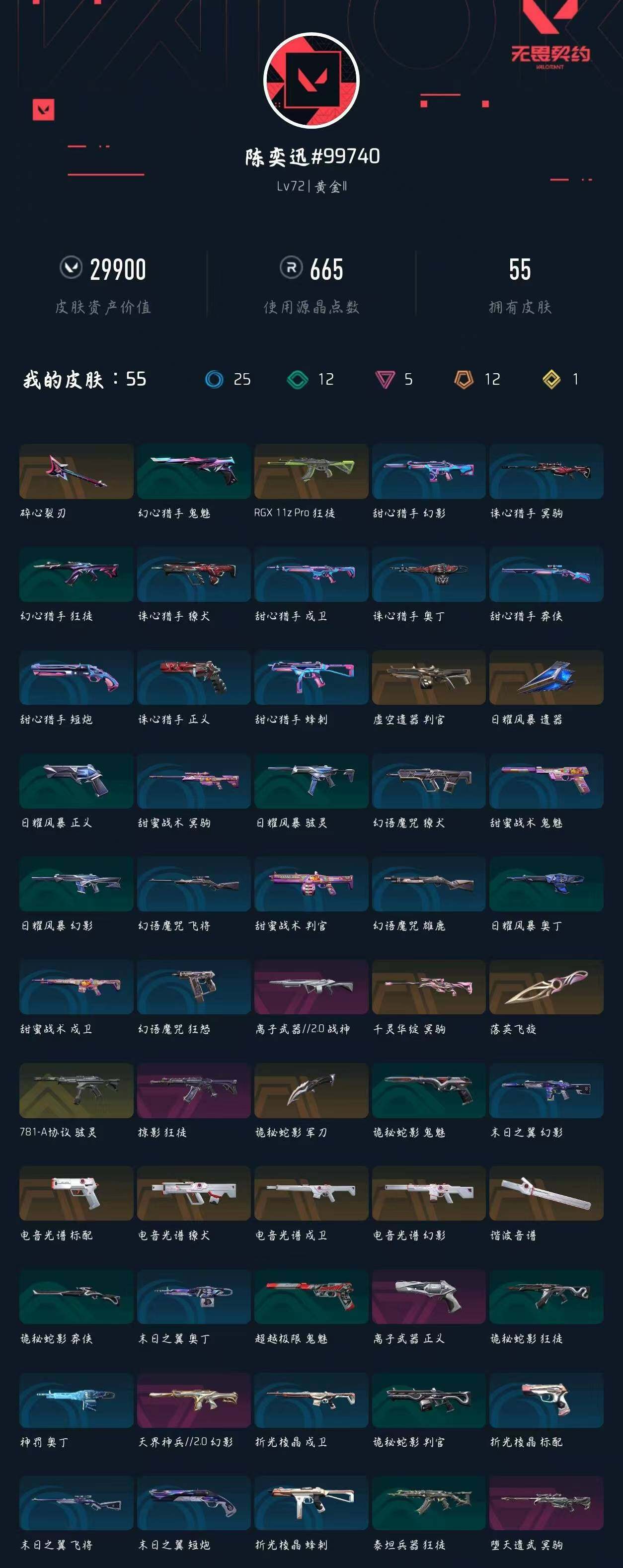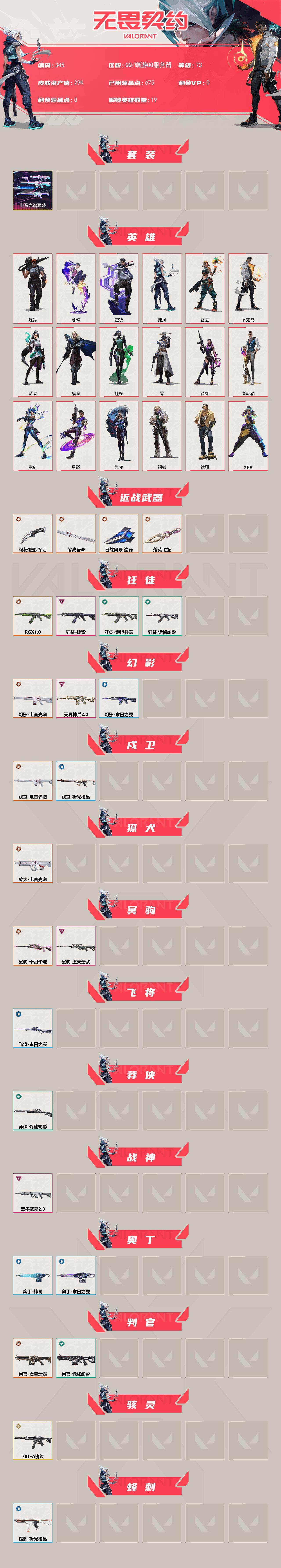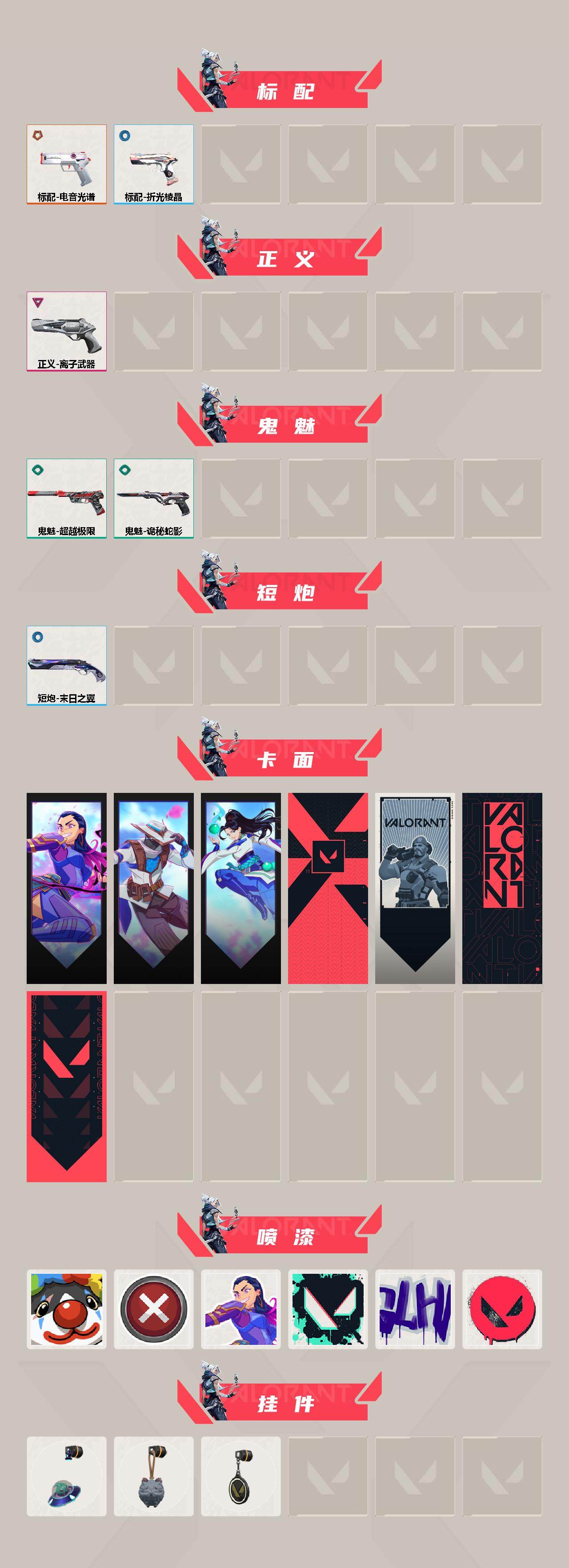 [14125056]【套装】:电音光谱套装 【英雄】:幻棱,炼狱,暮蝶,钛狐,壹决,捷风,雷兹,不死鸟,贤者,猎枭,蝰蛇,零,芮娜,尚勃勒,霓虹,星礈,黑梦,钢锁 【近战 武器】:近战武器-谐波音谱,近战武器-落英飞旋,近战武器-诡秘蛇影 军刀,近战武器-日耀风暴 遗器 【狂徒】:狂徒-rgx 11z pro,狂徒-掠影,狂徒-泰坦兵器,狂徒-诡秘蛇影 【幻影】:幻影-电音光谱,幻影-天界神兵//2.0,幻影-末日之翼,幻影-电音光谱 【戍卫】:戍卫-电音光谱,戍卫-折光棱晶,戍卫-电音光谱 【獠犬】:獠犬-电音光谱,獠犬-电音光谱 【冥驹】:冥驹-千灵华绽,冥驹-堕天遗武 【飞将】:飞将-末日之翼 【莽侠】:莽侠-诡秘蛇影 【战神】:战神-离子武器//2.0 【奥丁】:奥丁-神罚,奥丁-末日之翼 【判官】:判官-虚空遗器,判官-诡秘蛇影 【骇灵】:骇灵-781-a协议 【蜂刺】:蜂刺-折光棱晶 【标配】:标配-电音光谱,标配-折光棱晶,标配-电音光谱 【正义】:正义-离子武器 【鬼魅】:鬼魅-超越极限,鬼魅-诡秘蛇影 【短炮】:短炮-末日之翼 【卡面】:无畏契约go!第一卷:芮娜 卡面,无畏契约go!第一卷:零 卡面,无畏契约go!第一卷:贤者 卡面,代号红色 卡面,新兵报到 卡面,v契约 卡面,无畏契约 卡面 【喷漆】:小丑猫 喷漆,买装还是存钱 喷漆,无畏契约go!第一卷:芮娜 喷漆,胜利属于无畏契约 喷漆,glhf 喷漆,无畏契约 喷漆 【挂饰】:天外飞客 挂饰,《双城之战》魄罗 挂饰,无畏契约 纪念币 挂饰