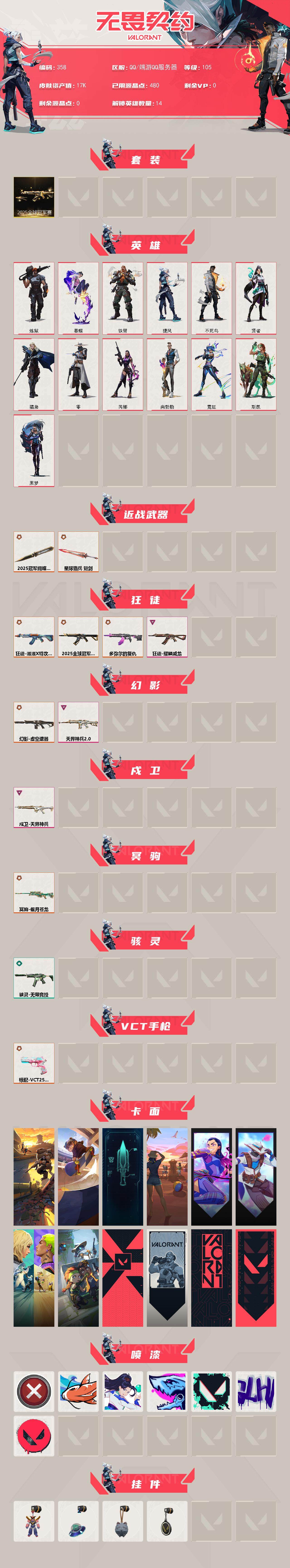 [14127725]【套装】:2025全球冠军赛套装 【英雄】:炼狱,暮蝶,铁臂,捷风,不死鸟,贤者,猎枭,零,芮娜,尚勃勒,霓虹,斯凯,黑梦 【近战 武器】:近战武器-2025全球冠军赛 蝴蝶刀,近战武器-星际猎兵 短剑 【狂徒】:狂徒-2025全球冠军赛,狂徒-滋滋x特攻队,狂徒-多弥尔的复仇,狂徒-耀鳞威龙 【幻影】:幻影-虚空遗器,幻影-天界神兵//2.0 【戍卫】:戍卫-天界神兵 【冥驹】:冥驹-偃月苍龙 【骇灵】:骇灵-无限竞技 【vct手呛】:标配-vct25 x blg 【卡面】:荒土机兵 卡面,clutch 卡面,零点嗅探设计图 卡面,沙雕爆能器 卡面,无畏契约go!第一卷:芮娜 卡面,无畏契约go!第一卷:零 卡面,钢锁vs盖可 卡面,别冒尖 卡面,代号红色 卡面,新兵报到 卡面,v契约 卡面,无畏契约 卡面 【喷漆】:买装还是存钱 喷漆,红鳞 喷漆,无畏契约go!第一卷:贤者 喷漆,暴走萝莉 喷漆,胜利属于无畏契约 喷漆,glhf 喷漆,无畏契约 喷漆 【挂饰】:迷你机甲 挂饰,天外飞客 挂饰,《双城之战》魄罗 挂饰,无畏契约 纪念币 挂饰
