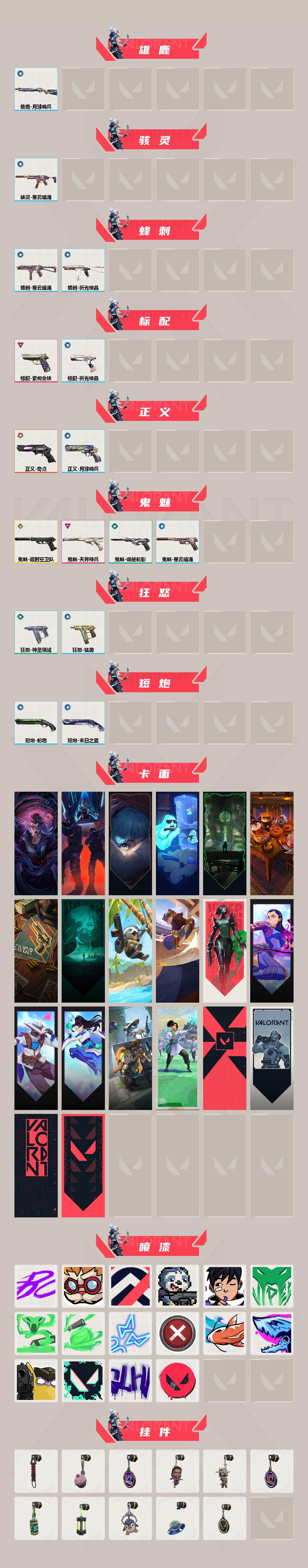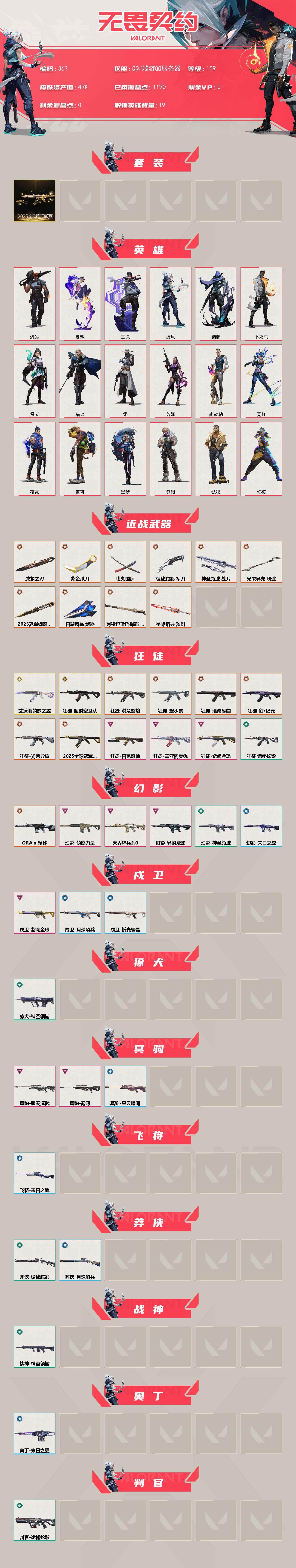 [14128731]【套装】:2025全球冠军赛套装 【英雄】:幻棱,炼狱,暮蝶,钛狐,壹决,捷风,幽影,不死鸟,贤者,猎枭,零,芮娜,尚勃勒,霓虹,夜露,盖可,黑梦,钢锁 【近战 武器】:近战武器-2025全球冠军赛 蝴蝶刀,近战武器-光荣异象 歧途,近战武器-紫金爪刀,近战武器-威龙之刃,近战武器-鬼丸国纲,近战武器-诡秘蛇影 军刀,近战武器-神圣领域 战刀,近战武器-日耀风暴 遗器,近战武器-阿特拉斯指挥部 甩棍,近战武器-星际猎兵 短剑 【狂徒】:狂徒-艾沃莉的梦之翼,狂徒-超时空卫队,狂徒-2025全球冠军赛,狂徒-洪荒怒焰,狂徒-混沌序曲,狂徒-塑水宗,狂徒-创·纪元,狂徒-光荣异象,狂徒-盖亚的复仇,狂徒-日冕雄师,狂徒-紫阙金琅,狂徒-诡秘蛇影 【幻影】:幻影-a x 颗秒,幻影-天界神兵//2.0,幻影-侦察力量,幻影-异鳞魔蛇,幻影-神圣领域,幻影-末日之翼 【戍卫】:戍卫-紫阙金琅,戍卫-月球哨兵,戍卫-折光棱晶 【獠犬】:獠犬-神圣领域 【冥驹】:冥驹-堕天遗武,冥驹-起源,冥驹-星云暗涌 【飞将】:飞将-末日之翼 【莽侠】:莽侠-诡秘蛇影,莽侠-月球哨兵 【战神】:战神-神圣领域 【奥丁】:奥丁-末日之翼 【判官】:判官-诡秘蛇影 【雄鹿】:雄鹿-月球哨兵 【骇灵】:骇灵-星云暗涌 【蜂刺】:蜂刺-星云暗涌,蜂刺-折光棱晶 【标配】:标配-紫阙金琅,标配-折光棱晶 【正义】:正义-奇点,正义-月球哨兵 【鬼魅】:鬼魅-超时空卫队,鬼魅-天界神兵,鬼魅-诡秘蛇影,鬼魅-星云暗涌 【狂怒】:狂怒-神圣领域,狂怒-猛袭 【短炮】:短炮-蛇吻,短炮-末日之翼 【卡面】:分崩离析 卡面,纳米打击 卡面,《双城之战》拥抱 卡面,精灵大战 卡面,欢迎来到底城 卡面,南瓜盛典 卡面,正义的化身 卡面,至黑之夜 卡面,树懒大作战 卡面,clutch 卡面,无畏契约:蝰蛇 卡面,无畏契约go!第一卷:芮娜 卡面,无畏契约go!第一卷:零 卡面,无畏契约go!第一卷:贤者 卡面,别冒尖 卡面,夯实根基 卡面,代号红色 卡面,新兵报到 卡面,v契约 卡面,无畏契约 卡面 【喷漆】:嘭! 喷漆,都算到了 喷漆,控场勿近 喷漆,审判之爪 喷漆,吸一口快乐 喷漆,蝰蛇 喷漆,致命毒素 喷漆,喜欢哪种毒? 喷漆,霓光四射 喷漆,买装还是存钱 喷漆,红鳞 喷漆,暴走萝莉 喷漆,放下武器