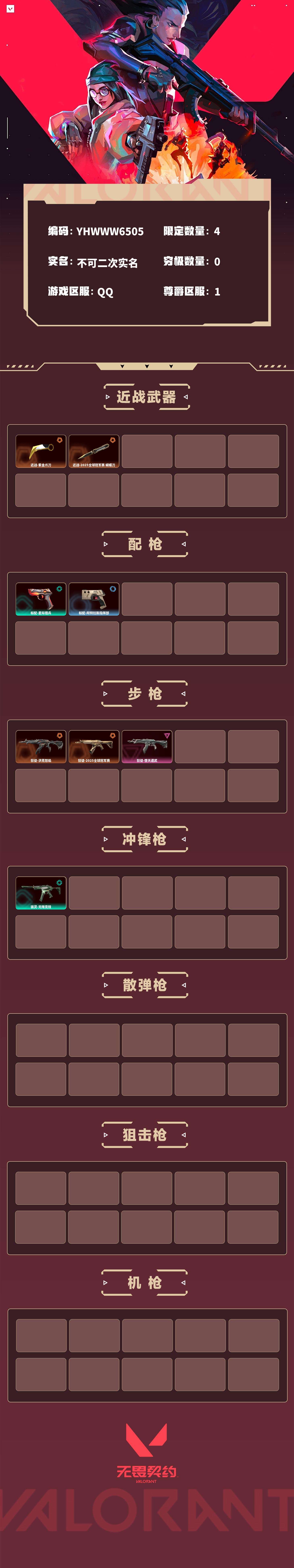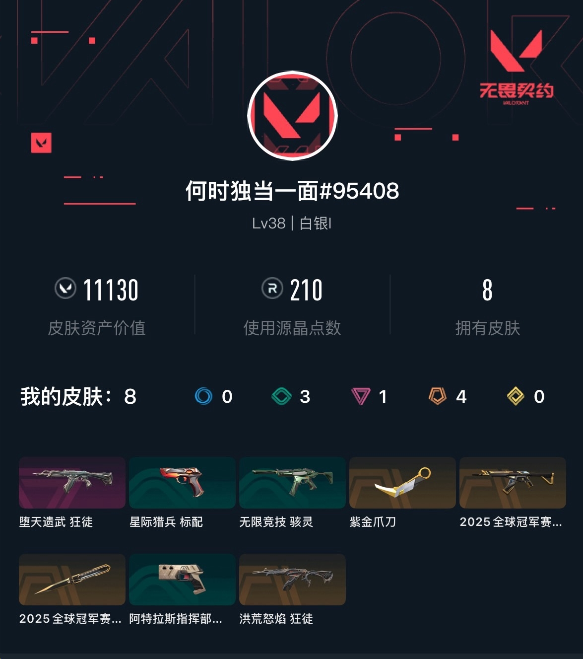 【无畏契约】【yhwww6505】等级:38,已用无畏点11130,已用源晶点210,橙皮:近战-紫金爪刀|狂徒-洪荒怒焰|狂徒-2025全球冠军赛|近战-2025全球冠军赛 蝴蝶刀__紫皮:狂徒-堕天遗武__段位:白银__绿皮:骇灵-无限竞技|标配-星际猎兵__蓝皮:标配-阿特拉斯指挥部__英雄:尚勃勒|维斯|暮蝶|盖可|壹决|炼狱|铁臂|贤者|猎枭|芮娜|捷风|不死鸟