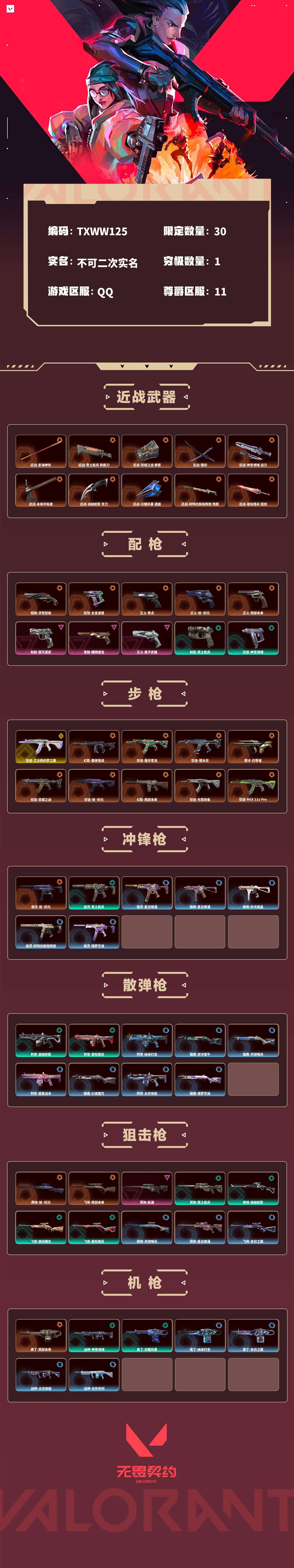 【无畏契约】【txww125】等级:174,已用无畏点64090,已用源晶点1255,金皮:狂徒-艾沃莉的梦之翼__橙皮:短炮-洪荒怒焰|幻影-黯夜怪谈|近战-定海神珍|狂徒-偃月苍龙|狂徒-塑水宗|狂怒-全息波普|獠犬-归零者|正义-奇点|近战-荒土机兵 热能刀|狂徒-双城之战|近战-双城之战 拳套|近战-镭切|骇灵-创·纪元|莽侠-创·纪元|狂徒-创·纪元|正义-创·纪元|近战-神圣领域 战刀|飞将-西部未来|正义-西部未来|奥丁-西部未来|幻影-西部未来|近战-未来开拓者|近战-诡秘蛇影 军刀|狂徒-光荣异象|近战-日耀风暴 遗器|狂徒-rgx 11z pro|近战-阿特拉斯指挥部 甩棍|近战-星际猎兵 短剑|狂徒-2025全球冠军赛|近战-2025全球冠军赛 蝴蝶刀__紫皮:标配-堕天遗武|鬼魅-耀鳞威龙|幻影-般若假面|幻影-天界神兵2.0|幻影-侦察力量|狂徒-堕天遗武|冥驹-起源|正义-离子武器|狂徒-掠影|戍卫-掠影|幻影-掠影2.0__段位:铂金__蓝皮:判官-纳米打击|正义-纳米打击|奥丁-纳米打击|幻影-纳米打击|雄鹿-逆冲蛮牛|狂怒-逆冲蛮牛|戍卫-逆冲蛮牛|獠犬-逆冲蛮牛|鬼魅-星云暗涌|骇灵-星云暗涌|正义-月球哨兵|莽侠-月球哨兵|戍卫-月球哨兵|雄鹿-月球哨兵|冥驹-星云暗涌|蜂刺-星云暗涌|蜂刺-折光棱晶|戍卫-折光棱晶|标配-折光棱晶|飞将-末日之翼|幻影-末日之翼|短炮-末日之翼|奥丁-末日之翼|鬼魅-甜蜜战术|判官-甜蜜战术|戍卫-甜蜜战术|雄鹿-幻语魔咒|獠犬-幻语魔咒|飞将-幻语魔咒|狂怒-幻语魔咒|正义-太空穿梭|战神-太空穿梭|判官-太空穿梭|戍卫-太空穿梭|骇灵-阿特拉斯指挥部|莽侠-阿特拉斯指挥部|标配-阿特拉斯指挥部|狂徒-阿特拉斯指挥部|狂怒-光环序列|戍卫-光环序列|冥驹-光环序列|战神-光环序列|狂徒-瑰梦艺语|鬼魅-瑰梦艺语|骇灵-瑰梦艺语|雄鹿-瑰梦艺语__绿皮:狂徒-荒土机兵|标配-荒土机兵|骇灵-荒土机兵|冥驹-荒土机兵|獠犬-神圣领域|狂怒-神圣领域|战神-神圣领域|幻影-神圣领域|判官-诡秘蛇影|鬼魅-诡秘蛇影|莽侠-诡秘蛇影|狂徒-诡秘蛇影|正义-日耀风暴|幻影-日耀风暴|奥丁-日耀风暴|短炮-悠闲猫生|飞将-悠闲猫生|幻影-悠闲猫生|獠犬-悠闲猫生|判官-星际猎兵|飞将-星际猎兵|标配-星际猎兵__英雄:尚勃勒|维斯|黑梦|斯凯|暮蝶|盖可|霓虹|壹决|星礈|k/o|幽影|夜露|钢锁|海神|奇乐|炼狱|铁臂|贤者|猎枭|钛狐|芮娜|零|捷风|蝰蛇|不死鸟|幻棱|雷兹|禁灭64090库存 25冠军套丨西部未来套丨创纪元套丨艾沃利显卡光荣塑水宗弃王爆爆狂徒丨黯夜般若幻影