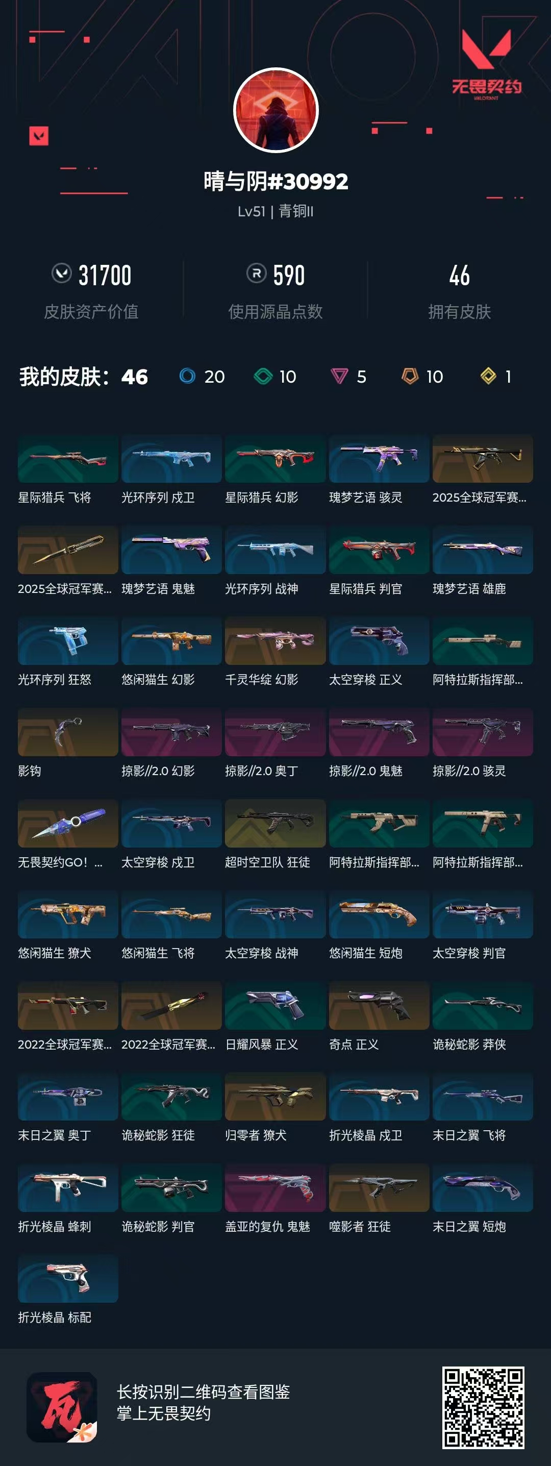 [14048173]s192113 (2022全球冠军赛套装/2025全球冠军赛套装/掠影//2.0套装)无畏契约/51等级/青铜段位/14英雄/46皮肤/资产31700/已使用r点590/剩余r点0/ 2022全球冠军赛-幻影2022全球冠军赛-蝴蝶刀,2025全球冠军赛-狂徒2025全球冠军赛-蝴蝶刀,掠影//2.0-幻影掠影//2.0-奥丁掠影//2.0-骇灵掠影//2.0-鬼魅影钩,噬影者-狂徒,千灵华绽-幻影,归零者-獠犬,超时空卫队-狂徒,无畏契约go第一卷-苦无,奇点-正义,盖亚的复仇-鬼魅