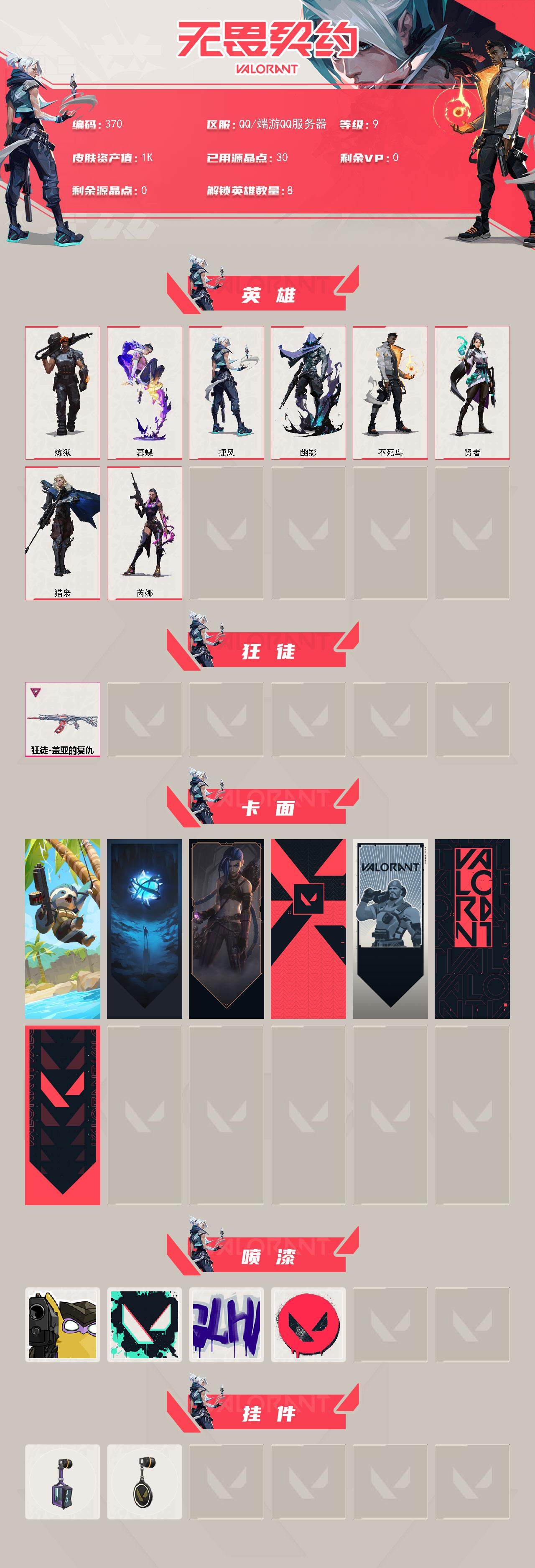 [14137967]【英雄】:炼狱,暮蝶,捷风,幽影,不死鸟,贤者,猎枭,芮娜 【狂徒】:狂徒-盖亚的复仇 【卡面】:树懒大作战 卡面,无垠星环 卡面,《双城之战》金克丝 卡面,代号红色 卡面,新兵报到 卡面,v契约 卡面,无畏契约 卡面 【喷漆】:放下武器 喷漆,胜利属于无畏契约 喷漆,glhf 喷漆,无畏契约 喷漆 【挂饰】:动力机箱 挂饰,无畏契约 纪念币 挂饰