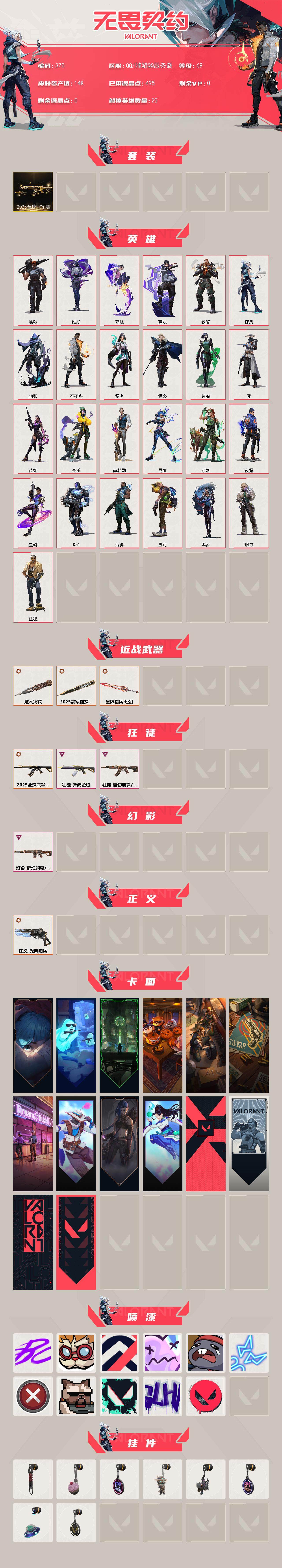 [14140775]【套装】:2025全球冠军赛套装 【英雄】:炼狱,维斯,暮蝶,钛狐,壹决,铁臂,捷风,幽影,不死鸟,贤者,猎枭,蝰蛇,零,芮娜,奇乐,尚勃勒,霓虹,斯凯,夜露,星礈,k/o,海神,盖可,黑梦,钢锁 【近战 武器】:近战武器-2025全球冠军赛 蝴蝶刀,近战武器-魔术火花,近战武器-星际猎兵 短剑,近战武器-魔术火花 【狂徒】:狂徒-2025全球冠军赛,狂徒-紫阙金琅,狂徒-奇幻朋克//3.0 【幻影】:幻影-奇幻朋克//3.0 【正义】:正义-光明哨兵 【卡面】:《双城之战》拥抱 卡面,精灵大战 卡面,欢迎来到底城 卡面,南瓜盛典 卡面,修车达人 卡面,正义的化身 卡面,梦幻奶茶 卡面,无畏契约go!第一卷:零 卡面,《双城之战》金克丝 卡面,无畏契约go!第一卷:贤者 卡面,代号红色 卡面,新兵报到 卡面,v契约 卡面,无畏契约 卡面 【喷漆】:嘭! 喷漆,都算到了 喷漆,控场勿近 喷漆,伤心心 喷漆,熊抱 喷漆,霓光四射 喷漆,买装还是存钱 喷漆,关门放狗 喷漆,胜利属于无畏契约 喷漆,glhf 喷漆,无畏契约 喷漆 【挂饰】:伞绳 挂饰,《双城之战》小蛋糕 挂饰,第九季//第三幕 纪念币 挂饰,无畏契约go!第一卷 零 挂饰,鱼骨头 挂饰,第九季//第二幕 纪念币 挂饰,天外飞客 挂饰,无畏契约 纪念币 挂饰