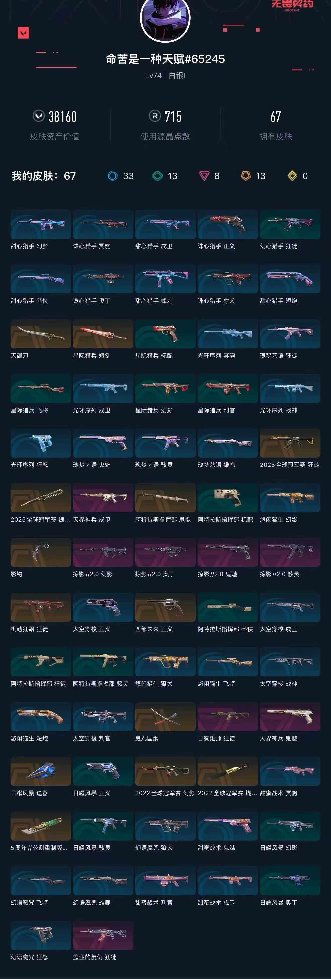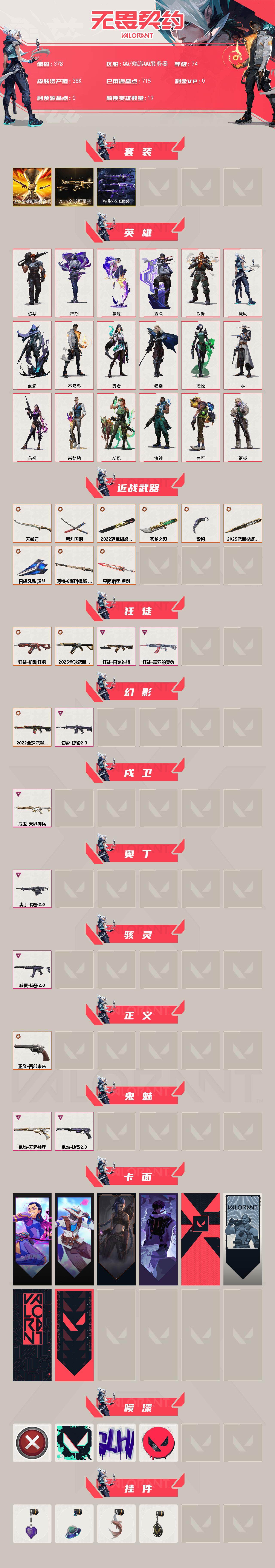 [14141087]【套装】:2025全球冠军赛套装,2022全球冠军赛套装,掠影//2.0套装 【英雄】:炼狱,维斯,暮蝶,壹决,铁臂,捷风,幽影,不死鸟,贤者,猎枭,蝰蛇,零,芮娜,尚勃勒,斯凯,海神,盖可,钢锁 【近战 武器】:近战武器-2025全球冠军赛 蝴蝶刀,近战武器-2022全球冠军赛 蝴蝶刀,近战武器-影钩,近战武器-5周年//公测重制版 苍龙之刃,近战武器-鬼丸国纲,近战武器-天御刀,近战武器-日耀风暴 遗器,近战武器-阿特拉斯指挥部 甩棍,近战武器-星际猎兵 短剑 【狂徒】:狂徒-2025全球冠军赛,狂徒-机动狂飙,狂徒-盖亚的复仇,狂徒-日冕雄师 【幻影】:幻影-2022全球冠军赛,幻影-掠影//2.0 【戍卫】:戍卫-天界神兵 【奥丁】:奥丁-掠影//2.0 【骇灵】:骇灵-掠影//2.0 【正义】:正义-西部未来 【鬼魅】:鬼魅-天界神兵,鬼魅-掠影//2.0 【卡面】:无畏契约go!第一卷:芮娜 卡面,无畏契约go!第一卷:零 卡面,《双城之战》金克丝 卡面,逆向独行 卡面 ,代号红色 卡面,新兵报到 卡面,v契约 卡面,无畏契约 卡面 【喷漆】:买装还是存钱 喷漆,胜利属于无畏契约 喷漆,glhf 喷漆,无畏契约 喷漆 【挂饰】:薰衣草之心 挂饰,天外飞客 挂饰,红鳞松叶 挂饰,无畏契约 纪念币 挂饰