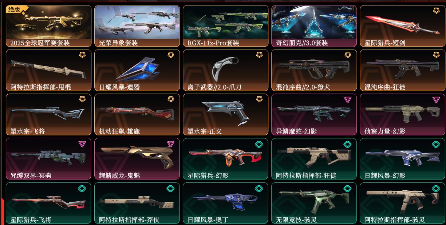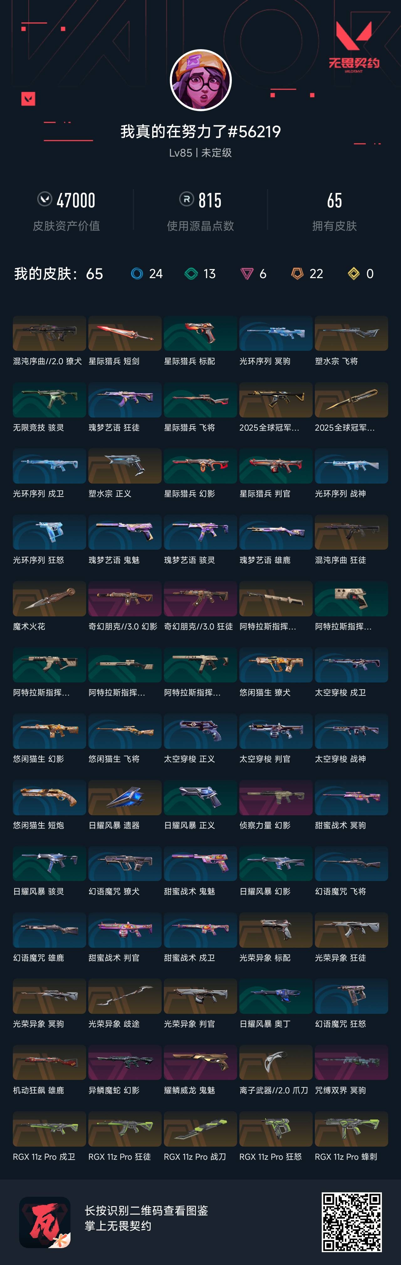 [14141362]s191711 (光荣异象套装/rgx-11z-pro套装/2025全球冠军赛套装/奇幻朋克3.0套装)无畏契约/等级85/段位未定级/英雄26/皮肤65/资产47000/已使用r点815/剩余r点0/光荣异象-狂徒光荣异象-冥驹光荣异象-判官光荣异象-标配光荣异象-歧途,rgx-11z-pro-狂徒rgx-11z-pro-戍卫rgx-11z-pro-蜂刺rgx-11z-pro-狂怒rgx-11z-pro-战刀,2025全球冠军赛-狂徒2025全球冠军赛-蝴蝶刀,奇幻朋克//3.0-狂徒奇幻朋克//3.0-幻影魔术火花,星际猎兵-短剑,阿特拉斯指挥部-甩棍,日耀风暴-遗器,离子武器//2.0-爪刀,混沌序曲//2.0-獠犬,混沌序曲-狂徒,异鳞魔蛇-幻影,侦察力量-幻影,塑水宗-飞将,咒缚双界-冥驹,机动狂飙-雄鹿,塑水宗-正义,耀鳞威龙-鬼魅