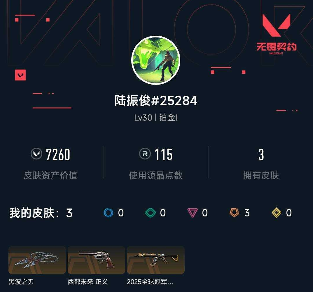 【无畏契约】【yhwww5769】等级:32,橙皮:近战-黑波之刃|正义-西部未来|狂徒-2025全球冠军赛__段位:铂金__英雄:尚勃勒|暮蝶|盖可|幽影|钢锁|奇乐|炼狱|铁臂|贤者|猎枭|芮娜|捷风|不死鸟|禁灭