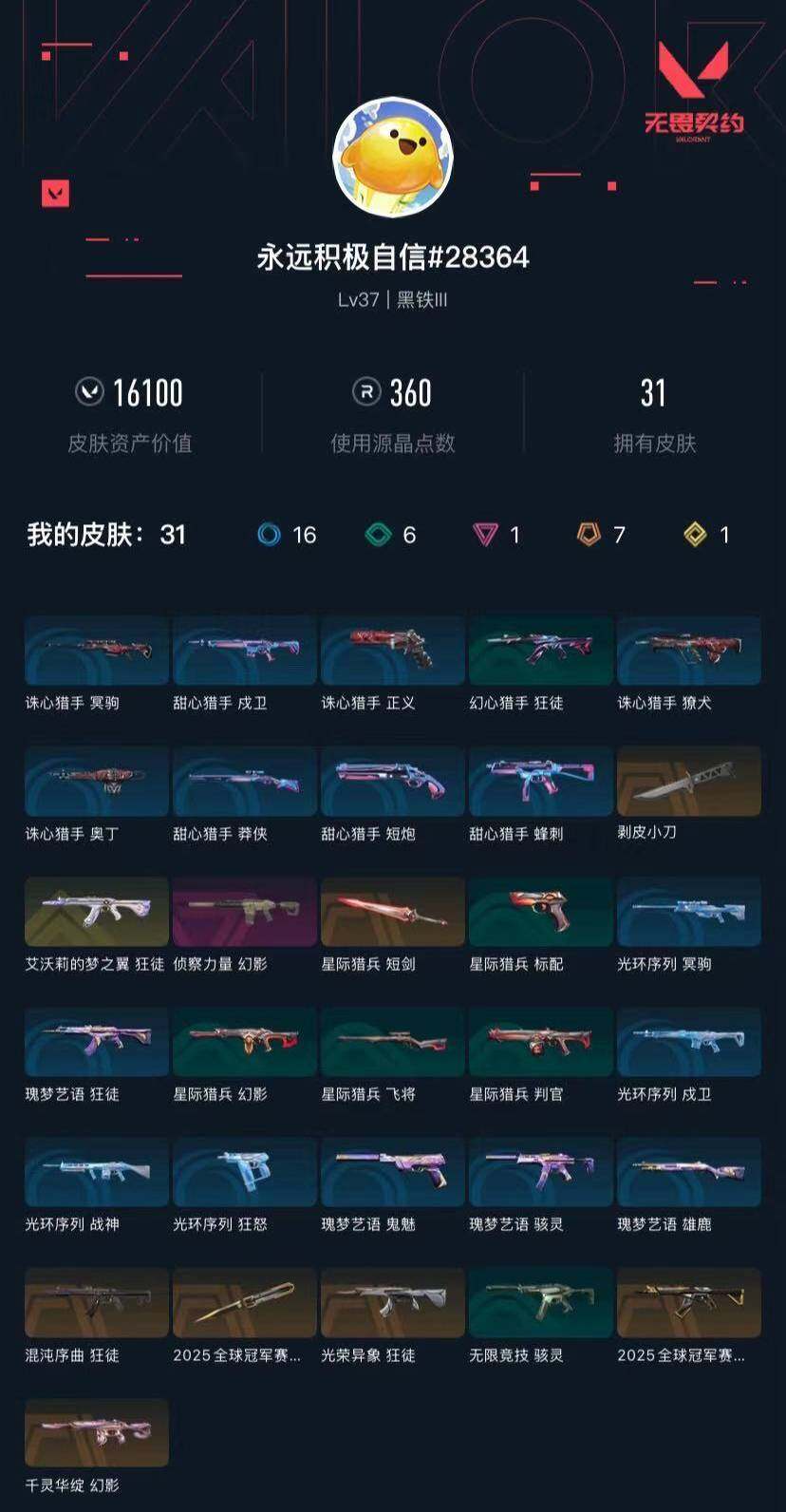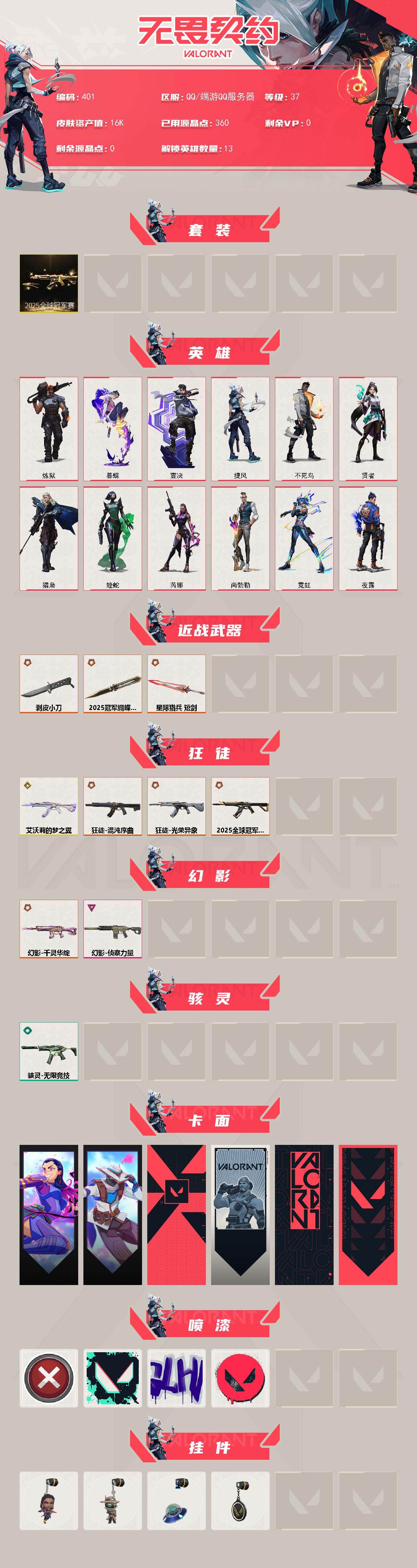 [14168128]【套装】:2025全球冠军赛套装 【英雄】:炼狱,暮蝶,壹决,捷风,不死鸟,贤者,猎枭,蝰蛇,芮娜,尚勃勒,霓虹,夜露 【近战 武器】:近战武器-2025全球冠军赛 蝴蝶刀,近战武器-剥皮小刀,近战武器-星际猎兵 短剑 【狂徒】:狂徒-艾沃莉的梦之翼,狂徒-2025全球冠军赛,狂徒-混沌序曲,狂徒-光荣异象 【幻影】:幻影-千灵华绽,幻影-侦察力量 【骇灵】:骇灵-无限竞技 【卡面】:无畏契约go!第一卷:芮娜 卡面,无畏契约go!第一卷:零 卡面,代号红色 卡面,新兵报到 卡面,v契约 卡面,无畏契约 卡面 【喷漆】:买装还是存钱 喷漆,胜利属于无畏契约 喷漆,glhf 喷漆,无畏契约 喷漆 【挂饰】:无畏契约go!第一卷 芮娜 挂饰,无畏契约go!第一卷 零 挂饰,天外飞客 挂饰,无畏契约 纪念币 挂饰