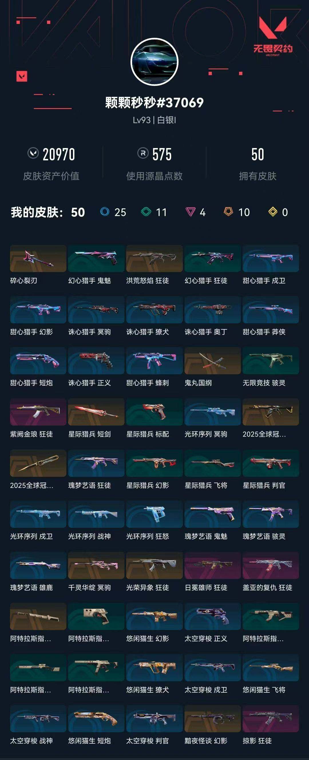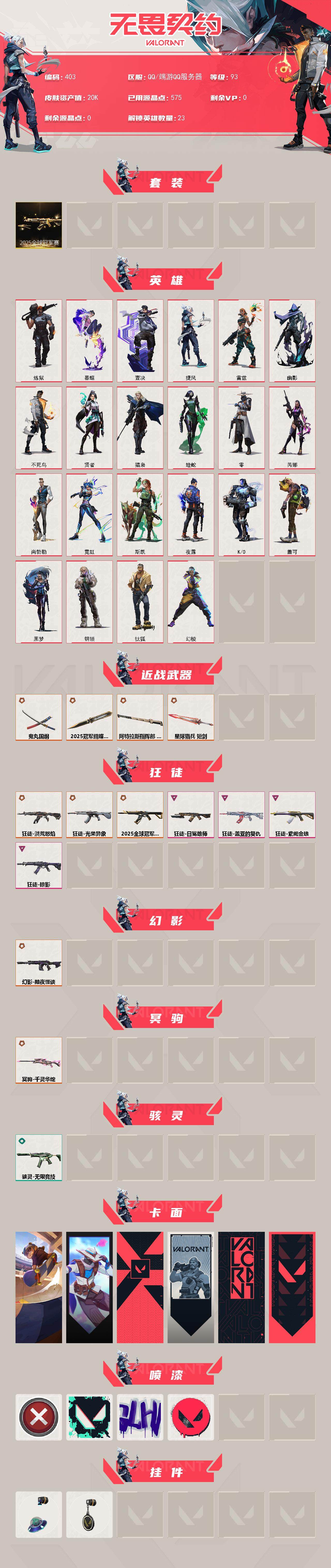 [14171849]【套装】:2025全球冠军赛套装 【英雄】:幻棱,炼狱,暮蝶,钛狐,壹决,捷风,雷兹,幽影,不死鸟,贤者,猎枭,蝰蛇,零,芮娜,尚勃勒,霓虹,斯凯,夜露,k/o,盖可,黑梦,钢锁 【近战 武器】:近战武器-2025全球冠军赛 蝴蝶刀,近战武器-鬼丸国纲,近战武器-阿特拉斯指挥部 甩棍,近战武器-星际猎兵 短剑 【狂徒】:狂徒-2025全球冠军赛,狂徒-洪荒怒焰,狂徒-光荣异象,狂徒-掠影,狂徒-盖亚的复仇,狂徒-日冕雄师,狂徒-紫阙金琅 【幻影】:幻影-黯夜怪谈 【冥驹】:冥驹-千灵华绽 【骇灵】:骇灵-无限竞技 【卡面】:clutch 卡面,无畏契约go!第一卷:零 卡面,代号红色 卡面,新兵报到 卡面,v契约 卡面,无畏契约 卡面 【喷漆】:买装还是存钱 喷漆,胜利属于无畏契约 喷漆,glhf 喷漆,无畏契约 喷漆 【挂饰】:天外飞客 挂饰,无畏契约 纪念币 挂饰