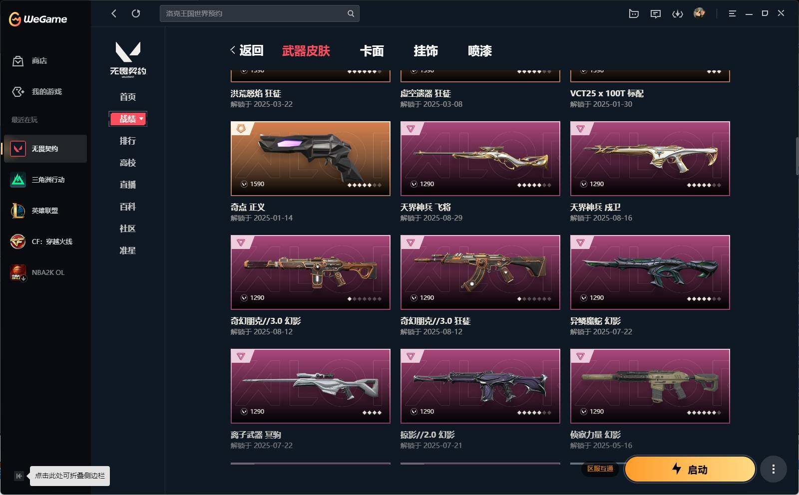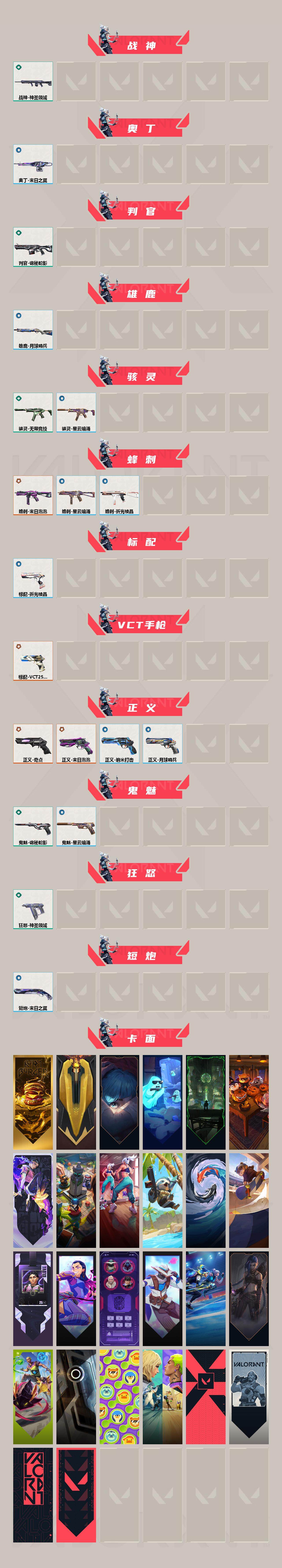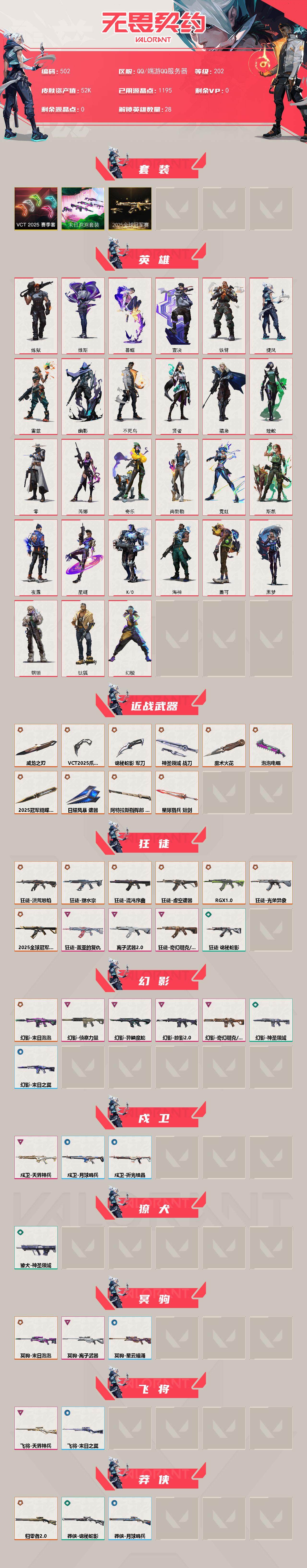 【502】xq21286 【套装】:2025全球冠军赛套装,末日泡泡套装,vct 2025 赛季套装 【英雄】:幻棱,炼狱,维斯,暮蝶,钛狐,壹决,铁臂,捷风,雷兹,幽影,不死鸟,贤者,猎枭,蝰蛇,零,芮娜,奇乐,尚勃勒,霓虹,斯凯,夜露,星礈,k/o,海神,盖可,黑梦,钢锁 【近战 武器】:近战武器-2025全球冠军赛 蝴蝶刀,近战武器-泡泡电锯,近战武器-魔术火花,近战武器-vct 2025 爪刀,近战武器-威龙之刃,近战武器-诡秘蛇影 军刀,近战武器-神圣领域 战刀,近战武器-日耀风暴 遗器,近战武器-阿特拉斯指挥部 甩棍,近战武器-星际猎兵 短剑,近战武器-魔术火花 【狂徒】:狂徒-2025全球冠军赛,狂徒-洪荒怒焰,狂徒-混沌序曲,狂徒-塑水宗,狂徒-虚空遗器,狂徒-rgx 11z pro,狂徒-光荣异象,狂徒-盖亚的复仇,狂徒-离子武器//2.0,狂徒-奇幻朋克//3.0,狂徒-诡秘蛇影 【幻影】:幻影-末日泡泡,幻影-侦察力量,幻影-异鳞魔蛇,幻影-掠影//2.0,幻影-奇幻朋克//3.0,幻影-神圣领域,幻影-末日之翼 【戍卫】:戍卫-天界神兵,戍卫-月球哨兵,戍卫-折光棱晶 【獠犬】:獠犬-神圣领域 【冥驹】:冥驹-末日泡泡,冥驹-离子武器,冥驹-星云暗涌 【飞将】:飞将-天界神兵,飞将-末日之翼 【莽侠】:莽侠-归零者//2.0,莽侠-诡秘蛇影,莽侠-月球哨兵 【战神】:战神-神圣领域 【奥丁】:奥丁-末日之翼 【判官】:判官-诡秘蛇影 【雄鹿】:雄鹿-月球哨兵 【骇灵】:骇灵-无限竞技,骇灵-星云暗涌 【蜂刺】:蜂刺-末日泡泡,蜂刺-星云暗涌,蜂刺-折光棱晶 【标配】:标配-折光棱晶 【vct手呛】:标配-vct25 x 100t 【正义】:正义-奇点,正义-末日泡泡,正义-纳米打击,正义-月球哨兵 【鬼魅】:鬼魅-诡秘蛇影,鬼魅-星云暗涌 【狂怒】:狂怒-神圣领域 【短炮】:短炮-末日之翼 【卡面】:终章:激斗汉堡 卡面,进入射程 卡面,《双城之战》拥抱 卡面,精灵大战 卡面,欢迎来到底城 卡面,南瓜盛典 卡面,无畏契约:暮蝶 卡面,战术桌游 卡面,热舞环节 卡面,树懒大作战 卡面,红鳞松叶 卡面,clutch 卡面,暮蝶工牌 卡面,无畏契约go!第一卷:芮娜 卡面,清除名单 卡面,无畏契约go!第一卷:零 卡面,比比看谁快? 卡面,《双城之战》金克丝 卡面,势不可挡//盖可 卡面,光导纤维 卡面,战术小伙伴 卡面,钢锁vs盖可 卡面,代号红色 卡面,新兵报到 卡面,v契约 卡面,无畏契约 卡面 【喷漆】:嗨宝南瓜灯 喷漆,嘭! 喷漆,都算到了 喷漆,控场勿近 喷漆,伤心心 喷漆,审判之爪 喷漆,皮蛋萌舞 喷漆,霓光四射 喷漆,买装还是存钱 喷漆,酷熊冲浪 喷漆,无畏契约go!第一卷:零 喷漆,无畏契约go!第一卷:贤者 喷漆,放下武器 喷漆,再吃最后一口 喷漆,胜利属于无畏契约 喷漆,glhf 喷漆,无畏契约 喷漆 【挂饰】:v25第三幕:超凡 挂饰,终章:猫猫木乃伊 挂饰,悠闲鸡块 挂饰,伞绳 挂饰,《双城之战》小蛋糕 挂饰,第九季//第三幕 纪念币 挂饰,无畏契约go!第一卷 芮娜 挂饰,无畏契约go!第一卷 零 挂饰,薰衣草之心 挂饰,天外飞客 挂饰,红鳞松叶 挂饰,《双城之战》魄罗 挂饰,海豹的认可 挂饰,无畏契约 纪念币 挂饰