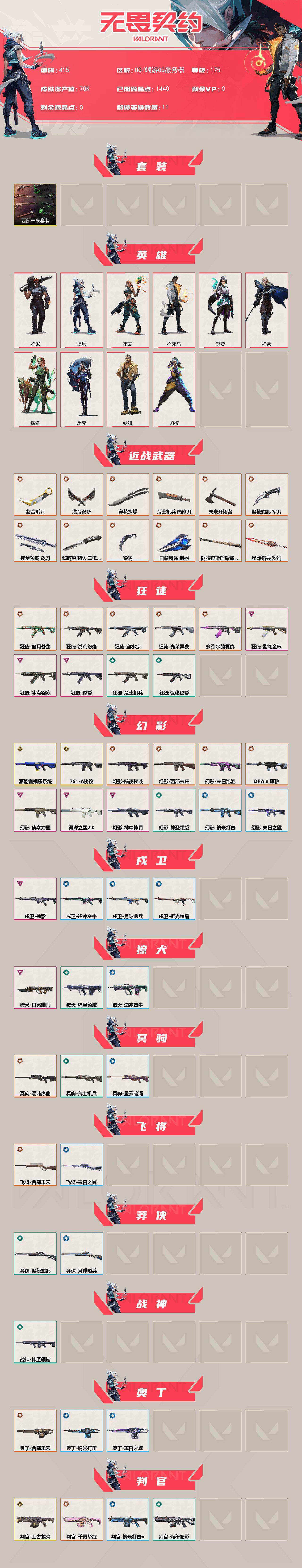 [14188015]【套装】:西部未来套装 【英雄】:幻棱,炼狱,钛狐,捷风,雷兹,不死鸟,贤者,猎枭,斯凯,黑梦 【近战 武器】:近战武器-影钩,近战武器-超时空卫队 三棱军刺,近战武器-穿花蝴蝶,近战武器-紫金爪刀,近战武器-未来开拓者,近战武器-洪荒双斩,近战武器-荒土机兵 热能刀,近战武器-诡秘蛇影 军刀,近战武器-神圣领域 战刀,近战武器-日耀风暴 遗器,近战武器-阿特拉斯指挥部 甩棍,近战武器-星际猎兵 短剑 【狂徒】:狂徒-洪荒怒焰,狂徒-塑水宗,狂徒-偃月苍龙,狂徒-光荣异象,狂徒-多弥尔的复仇,狂徒-冰点凝冻,狂徒-掠影,狂徒-紫阙金琅,狂徒-荒土机兵,狂徒-诡秘蛇影 【幻影】:幻影-781-a协议,幻影-源能者娱乐系统,幻影-黯夜怪谈,幻影-西部未来,幻影-末日泡泡,幻影-a x 颗秒,幻影-侦察力量,幻影-海洋之星//2.0,幻影-神中神罚,幻影-神圣领域,幻影-纳米打击,幻影-末日之翼,幻影-西部未来 【戍卫】:戍卫-掠影,戍卫-逆冲蛮牛,戍卫-月球哨兵,戍卫-折光棱晶 【獠犬】:獠犬-日冕雄师,獠犬-神圣领域,獠犬-逆冲蛮牛 【冥驹】:冥驹-混沌序曲,冥驹-荒土机兵,冥驹-星云暗涌 【飞将】:飞将-西部未来,飞将-末日之翼 【莽侠】:莽侠-诡秘蛇影,莽侠-月球哨兵 【战神】:战神-神圣领域 【奥丁】:奥丁-西部未来,奥丁-纳米打击,奥丁-末日之翼 【判官】:判官-上古龙炎,判官-千灵华绽,判官-诡秘蛇影,判官-纳米打击x 【雄鹿】:雄鹿-逆冲蛮牛,雄鹿-月球哨兵 【骇灵】:骇灵-海洋之星,骇灵-荒土机兵,骇灵-星云暗涌 【蜂刺】:蜂刺-星云暗涌,蜂刺-折光棱晶 【标配】:标配-黯夜怪谈,标配-荒土机兵,标配-折光棱晶 【正义】:正义-西部未来,正义-混沌序曲//2.0,正义-离子武器,正义-纳米打击,正义-月球哨兵 【鬼魅】:鬼魅-超时空卫队,鬼魅-奇点//2.0,鬼魅-噬影者,鬼魅-侦察力量,鬼魅-诡秘蛇影,鬼魅-星云暗涌 【狂怒】:狂怒-上古龙炎,狂怒-神圣领域,狂怒-逆冲蛮牛 【短炮】:短炮-末日之翼 【卡面】:终章:激斗汉堡 卡面,进入射程 卡面,分崩离析 卡面,纳米打击 卡面,抑制技术 卡面,激斗汉堡 卡面,瓦娃脸雪糕 p2 卡面,从黄昏到黎明 卡面,荒土机兵 卡面,银弹猎手 卡面,逆冲蛮牛 卡面,《双城之战》拥抱 卡面,精灵大战 卡面,欢迎来