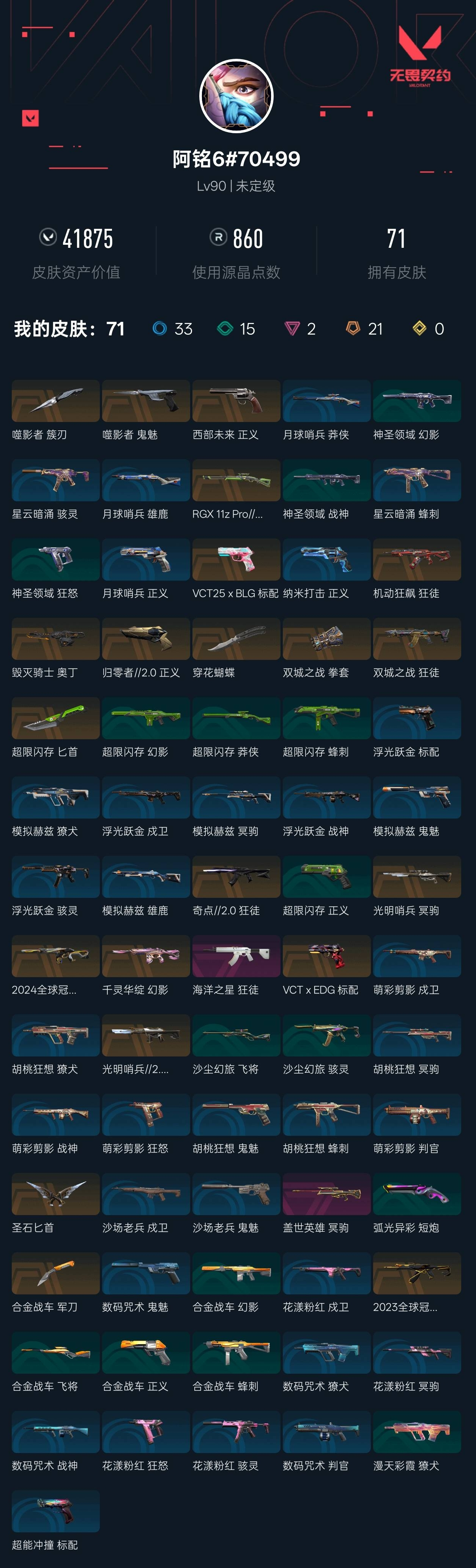 【无畏契约】【yhwww6559】等级:90,已用无畏点41875,已用源晶点860,橙皮:标配-vct x edg|幻影-2024全球冠军赛|幻影-千灵华绽|幻影-光明哨兵2.0|近战-超限闪存 匕首|近战-圣石匕首|狂徒-机动狂飙|莽侠-rgx 11z pro3.0|狂徒-2023全球冠军赛|冥驹-光明哨兵|近战-合金战车 军刀|狂徒-奇点2.0|奥丁-毁灭骑士|狂徒-双城之战|近战-双城之战 拳套|近战-穿花蝴蝶|正义-归零者2.0|标配-vct25 x blg|正义-西部未来|近战-噬影者 簇刃|鬼魅-噬影者__紫皮:狂徒-海洋之星|冥驹-盖世英雄__段位:未定级__蓝皮:标配-超能冲撞|狂怒-花漾粉红|骇灵-花漾粉红|戍卫-花漾粉红|冥驹-花漾粉红|战神-数码咒术|獠犬-数码咒术|判官-数码咒术|鬼魅-数码咒术|正义-纳米打击|骇灵-星云暗涌|正义-月球哨兵|莽侠-月球哨兵|雄鹿-月球哨兵|戍卫-沙场老兵|鬼魅-沙场老兵|骇灵-浮光跃金|标配-浮光跃金|戍卫-浮光跃金|战神-浮光跃金|鬼魅-胡桃狂想|獠犬-胡桃狂想|蜂刺-胡桃狂想|冥驹-胡桃狂想|戍卫-萌彩剪影|战神-萌彩剪影|狂怒-萌彩剪影|判官-萌彩剪影|鬼魅-模拟赫兹|獠犬-模拟赫兹|冥驹-模拟赫兹|雄鹿-模拟赫兹|蜂刺-星云暗涌__绿皮:蜂刺-合金战车|正义-合金战车|幻影-合金战车|飞将-合金战车|狂怒-神圣领域|战神-神圣领域|幻影-神圣领域|正义-超限闪存|莽侠-超限闪存|幻影-超限闪存|蜂刺-超限闪存|短炮-弧光异彩|獠犬-漫天彩霞|飞将-沙尘幻旅|骇灵-沙尘幻旅__英雄:尚勃勒|维斯|黑梦|斯凯|暮蝶|盖可|霓虹|壹决|星礈|k/o|幽影|夜露|钢锁|海神|奇乐|炼狱|铁臂|贤者|猎枭|钛狐|芮娜|零|捷风|蝰蛇|不死鸟|幻棱|雷兹