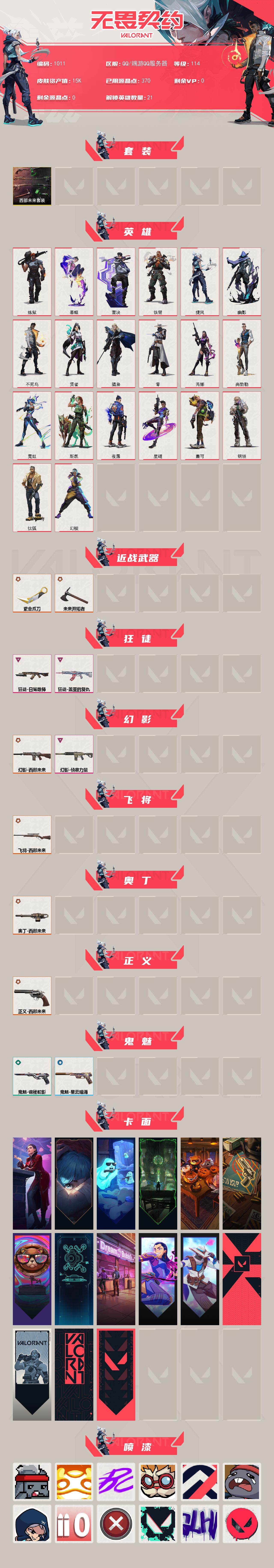 【1011】xq19676【套装】:西部未来套装 【英雄】:幻棱,炼狱,暮蝶,钛狐,壹决,铁臂,捷风,幽影,不死鸟,贤者,猎枭,零,芮娜,尚勃勒,霓虹,斯凯,夜露,星礈,盖可,钢锁 【近战 武器】:近战武器-紫金爪刀,近战武器-未来开拓者 【狂徒】:狂徒-盖亚的复仇,狂徒-日冕雄师 【幻影】:幻影-西部未来,幻影-侦察力量,幻影-西部未来 【飞将】:飞将-西部未来 【奥丁】:奥丁-西部未来 【正义】:正义-西部未来 【鬼魅】:鬼魅-诡秘蛇影,鬼魅-星云暗涌 【卡面】:从黄昏到黎明 卡面,《双城之战》拥抱 卡面,精灵大战 卡面,欢迎来到底城 卡面,南瓜盛典 卡面,正义的化身 卡面,音熊登场 卡面,声感陷阱设计图 卡面,梦幻奶茶 卡面,无畏契约go!第一卷:芮娜 卡面,无畏契约go!第一卷:零 卡面,代号红色 卡面,新兵报到 卡面,v契约 卡面,无畏契约 卡面 【喷漆】:战“素”兔 喷漆,嗨宝南瓜灯 喷漆,嘭! 喷漆,都算到了 喷漆,控场勿近 喷漆,熊抱 喷漆,捷风差距 喷漆,拼一呛 喷漆,买装还是存钱 喷漆,胜利属于无畏契约 喷漆,glhf 喷漆,无畏契约 喷漆 【挂饰】:伞绳 挂饰,《双城之战》小蛋糕 挂饰,第九季//第三幕 纪念币 挂饰,拳击战术熊 挂饰,第九季//第二幕 纪念币 挂饰,第九季//第一幕 纪念币 挂饰,天外飞客 挂饰,无畏契约 纪念币 挂饰
