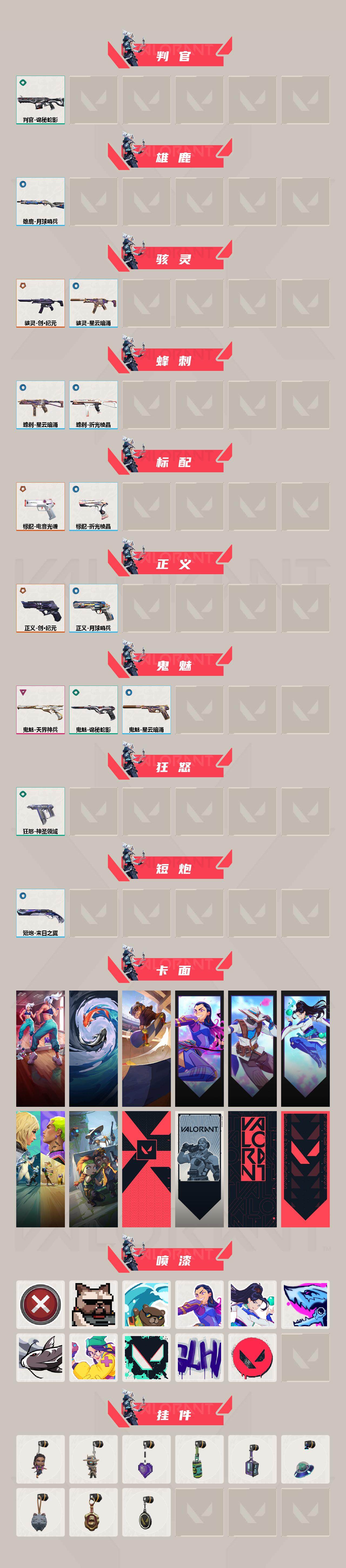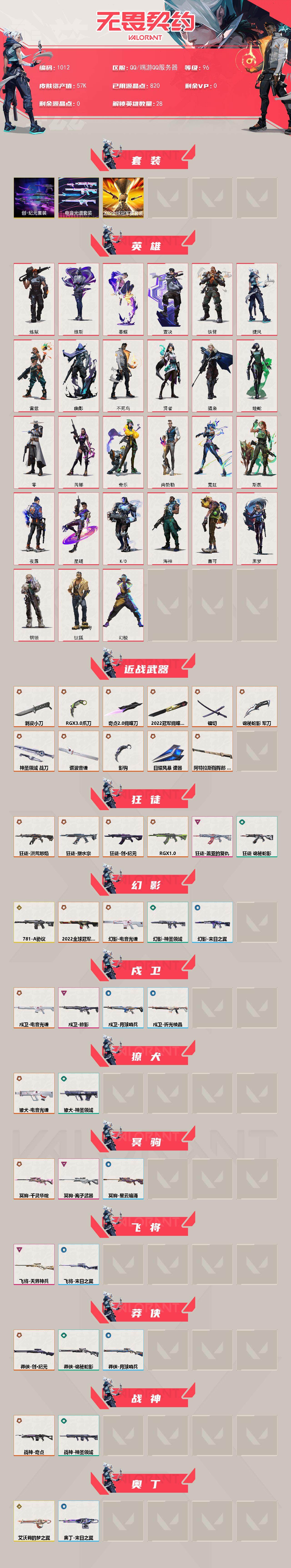 【1012】xq13305 【套装】:2022全球冠军赛套装,电音光谱套装,创·纪元套装 【英雄】:幻棱,炼狱,维斯,暮蝶,钛狐,壹决,铁臂,捷风,雷兹,幽影,不死鸟,贤者,猎枭,蝰蛇,零,芮娜,奇乐,尚勃勒,霓虹,斯凯,夜露,星礈,k/o,海神,盖可,黑梦,钢锁 【近战 武器】:近战武器-2022全球冠军赛 蝴蝶刀,近战武器-影钩,近战武器-谐波音谱,近战武器-剥皮小刀,近战武器-奇点//2.0 蝴蝶刀,近战武器-rgx 11z pro//3.0 爪刀,近战武器-镭切,近战武器-诡秘蛇影 军刀,近战武器-神圣领域 战刀,近战武器-日耀风暴 遗器,近战武器-阿特拉斯指挥部 甩棍 【狂徒】:狂徒-洪荒怒焰,狂徒-塑水宗,狂徒-创·纪元,狂徒-rgx 11z pro,狂徒-盖亚的复仇,狂徒-诡秘蛇影 【幻影】:幻影-781-a协议,幻影-2022全球冠军赛,幻影-电音光谱,幻影-神圣领域,幻影-末日之翼,幻影-电音光谱 【戍卫】:戍卫-电音光谱,戍卫-掠影,戍卫-月球哨兵,戍卫-折光棱晶,戍卫-电音光谱 【獠犬】:獠犬-电音光谱,獠犬-神圣领域,獠犬-电音光谱 【冥驹】:冥驹-千灵华绽,冥驹-离子武器,冥驹-星云暗涌 【飞将】:飞将-天界神兵,飞将-末日之翼 【莽侠】:莽侠-创·纪元,莽侠-诡秘蛇影,莽侠-月球哨兵 【战神】:战神-奇点,战神-神圣领域 【奥丁】:奥丁-艾沃莉的梦之翼,奥丁-末日之翼 【判官】:判官-诡秘蛇影 【雄鹿】:雄鹿-月球哨兵 【骇灵】:骇灵-创·纪元,骇灵-星云暗涌 【蜂刺】:蜂刺-星云暗涌,蜂刺-折光棱晶 【标配】:标配-电音光谱,标配-折光棱晶,标配-电音光谱 【正义】:正义-创·纪元,正义-月球哨兵 【鬼魅】:鬼魅-天界神兵,鬼魅-诡秘蛇影,鬼魅-星云暗涌 【狂怒】:狂怒-神圣领域 【短炮】:短炮-末日之翼 【卡面】:热舞环节 卡面,红鳞松叶 卡面,clutch 卡面,无畏契约go!第一卷:芮娜 卡面,无畏契约go!第一卷:零 卡面,无畏契约go!第一卷:贤者 卡面,钢锁vs盖可 卡面,别冒尖 卡面,代号红色 卡面,新兵报到 卡面,v契约 卡面,无畏契约 卡面 【喷漆】:买装还是存钱 喷漆,关门放狗 喷漆,酷熊冲浪 喷漆,无畏契约go!第一卷:芮娜 喷漆,无畏契约go!第一卷:贤者 喷漆,暴走萝莉 喷漆,松叶 喷漆,无畏契约go!第一卷:奇乐 喷漆,胜利属于无畏契约 喷漆,glhf 喷漆,无畏契约 喷漆 【挂饰】:无畏契约go!第一卷 芮娜 挂饰,无畏契约go!第一卷 零 挂饰,薰衣草之心 挂饰,z世代特饮 挂饰,动力机箱 挂饰,天外飞客 挂饰,《双城之战》魄罗 挂饰,海豹的认可 挂饰,无畏契约 纪念币 挂饰