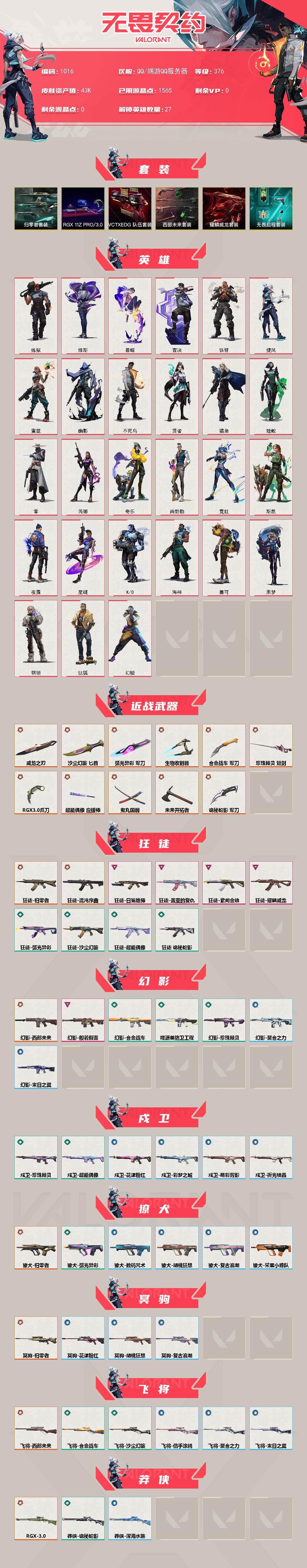 【1016】xq23852【套装】:西部未来套装,rgx 11z pro//3.0套装,归零者套装,vctxedg 队伍套装,耀鳞威龙套装,无畏启程套装 【英雄】:幻棱,炼狱,维斯,暮蝶,钛狐,壹决,铁臂,捷风,雷兹,幽影,不死鸟,贤者,猎枭,蝰蛇,零,芮娜,奇乐,尚勃勒,霓虹,斯凯,夜露,星礈,k/o,海神,盖可,黑梦,钢锁 【近战 武器】:近战武器-rgx 11z pro//3.0 爪刀,近战武器-威龙之刃,近战武器-鬼丸国纲,近战武器-未来开拓者,近战武器-珍珠棘贝 短剑,近战武器-超能偶像 应援棒,近战武器-合金战车 军刀,近战武器-弧光异彩 军刀,近战武器-沙尘幻旅 匕首,近战武器-生物收割器,近战武器-诡秘蛇影 军刀 【狂徒】:狂徒-归零者,狂徒-混沌序曲,狂徒-盖亚的复仇,狂徒-日冕雄师,狂徒-耀鳞威龙,狂徒-紫阙金琅,狂徒-超能偶像,狂徒-弧光异彩,狂徒-沙尘幻旅,狂徒-诡秘蛇影 【幻影】:幻影-西部未来,幻影-般若假面,幻影-合金战车,幻影-噬源兽防卫工程,幻影-珍珠棘贝,幻影-聚合之力,幻影-末日之翼,幻影-西部未来 【戍卫】:戍卫-超能偶像,戍卫-珍珠棘贝,戍卫-彩梦之城,戍卫-花漾粉红,戍卫-萌彩剪影,戍卫-折光棱晶 【獠犬】:獠犬-归零者,獠犬-弧光异彩,獠犬-采蜜小蜂队,獠犬-复古浪潮,獠犬-胡桃狂想,獠犬-数码咒术 【冥驹】:冥驹-归零者,冥驹-复古浪潮,冥驹-胡桃狂想,冥驹-花漾粉红 【飞将】:飞将-西部未来,飞将-合金战车,飞将-沙尘幻旅,飞将-聚合之力,飞将-信手涂鸦,飞将-末日之翼 【莽侠】:莽侠-rgx 11z pro//3.0,莽侠-诡秘蛇影,莽侠-深海水族 【战神】:战神-采蜜小蜂队,战神-萌彩剪影,战神-深海水族,战神-数码咒术 【奥丁】:奥丁-西部未来,奥丁-信手涂鸦,奥丁-末日之翼 【判官】:判官-超能偶像,判官-诡秘蛇影,判官-采蜜小蜂队,判官-萌彩剪影,判官-数码咒术 【雄鹿】:雄鹿-彩梦之城,雄鹿-复古浪潮 【骇灵】:骇灵-沙尘幻旅,骇灵-珍珠棘贝,骇灵-花漾粉红,骇灵-信手涂鸦 【蜂刺】:蜂刺-合金战车,蜂刺-弧光异彩,蜂刺-胡桃狂想,蜂刺-聚合之力,蜂刺-深海水族,蜂刺-折光棱晶 【标配】:标配-超能偶像,标配-彩梦之城,标配-超能冲撞,标配-折光棱晶 【vct手呛】:标配-vct x edg 【正义】:正义-rgx 11z pro//3.0,正义-西部未来,正义-超限闪存,正义-合金战车,正义-沙尘幻旅,正义-复古浪潮,正义-纳米打击 【鬼魅】:鬼魅-耀鳞威龙,鬼魅-流星兵团,鬼魅-诡秘蛇影,鬼魅-采蜜小蜂队,鬼魅-光导纤维,鬼魅-胡桃狂想,鬼魅-数码咒术,鬼魅-信手涂鸦,鬼魅-星云暗涌 【狂怒】:狂怒-珍珠棘贝,狂怒-花漾粉红,狂怒-聚合之力,狂怒-萌彩剪影 【短炮】:短炮-归零者,短炮-弧光异彩,短炮-深海水族,短炮-末日之翼 【卡面】:终章:激斗汉堡 卡面,进入射程 卡面,《双城之战》拥抱 卡面,精灵大战 卡面,欢迎来到底城 卡面,南瓜盛典 卡面,无畏契约:暮蝶 卡面,修车达人 卡面,正义的化身 卡面,终章:生意人麦宝 卡面,铁之华 卡面,失而复得 卡面,时间到 卡面,最高舞台 卡面,复活专家 卡面,归乡 // 蝰蛇 卡面,rgx 11z pro//3.0 卡面,超能偶像 卡面,生意人麦宝 卡面,声感陷阱设计图 卡面,钢锁工牌 卡面,战术小伙伴的夏日 卡面,采蜜小蜂队 卡面,聚合之力 卡面,梦幻奶茶 卡面,终章:打造专属狂徒 卡面,趁热吃 卡面,源能反应 卡面,零点嗅探设计图 卡面,终章:瓦娃脸雪糕 卡面,表象之下 卡面,虹吸式咖啡壶 卡面,源能者美容 卡面,脚踝终结者 卡面 ,夜班 卡面,瓦娃脸雪糕 卡面 ,沙雕爆能器 卡面,无畏契约go!第一卷:芮娜 卡面,深海水族 卡面,珍珠棘贝 卡面,复古浪潮 卡面,盖可工牌 卡面,清除名单 卡面,无畏契约go!第一卷:零 卡面,终章:同步耍酷 卡面,龍记 卡面,化茧成蝶 卡面,《双城之战》金克丝 卡面,完美调谐 卡面 ,暗呛 卡面,终章:黑影先生的咖啡! 卡面,铁臂vs雷兹 卡面,纪念照 p2 卡面,一击全倒 卡面,黑影先生的咖啡! 卡面,天台狂欢 卡面,胡桃狂想 卡面,沙尘幻旅 卡面,壹决工牌 卡面,萌彩剪影 卡面,势不可挡//k/o 卡面,夯实根基 卡面,"luie" 卡面,热烈欢迎 卡面,铁臂设计图 卡面,代号红色 卡面,冰淇淋店 卡面,新兵报到 卡面,友军火力 卡面,v契约 卡面,无畏契约 卡面 【喷漆】:嗨宝南瓜灯 喷漆,嘭! 喷漆,都算到了 喷漆,控场勿近 喷漆,伤心心 喷漆,小丑猫 喷漆,熊抱 喷漆,又被闪了 喷漆,终极羞辱 喷漆,超级粉丝 喷漆,黯兽卖萌 喷漆,捷风差距 喷漆,惊声尖叫 喷漆,2021冠军巡回赛花火 喷漆,五人成星 喷漆,超能偶像 喷漆,rgx 11z pro//3.0 喷漆,放我出去 喷漆,掩护我 喷漆,大佬发呛 喷漆,边缘试探 喷漆,拼一呛 喷漆,聚合之力 喷漆,采蜜小蜂队 喷漆,梦幻小队 喷漆,五个全都齐了 喷漆,我觉得不行 喷漆,我的刀呢? 喷漆,情绪控制 喷漆,哨卫滑步 喷漆,倒吸一口凉气 喷漆,uwu 喷漆,新潮流 喷漆,逮到一个 喷漆,一个人的孤岛 喷漆,双人比心 喷漆,不予置评 喷漆,三熊合一 喷漆,要喝完噢! 喷漆,双击点赞 喷漆,珍珠棘贝 喷漆,深海水族 喷漆,禁止标配 喷漆 ,铁臂尴尬 喷漆,买装还是存钱 喷漆,醒狮贺春 喷漆,无畏契约go!第一卷:芮娜 喷漆,红鳞 喷漆,无畏契约go!第一卷:零 喷漆,无畏契约go!第一卷:捷风 喷漆,无畏契约go!第一卷:贤者 喷漆,暴走萝莉 喷漆,松叶 喷漆,无畏契约go!第一卷:奇乐 喷漆,旅行小熊 喷漆,蕊形灯 喷漆,这招不行了 喷漆,真相只有一个 喷漆,自信满满 喷漆,凌空惊吓 喷漆,再吃最后一口 喷漆,我一个滑铲 喷漆,放手一搏 喷漆,沙尘幻旅 喷漆,萌彩剪影 喷漆,电烫 喷漆,暗中偷瞄 喷漆,胡桃狂想 喷