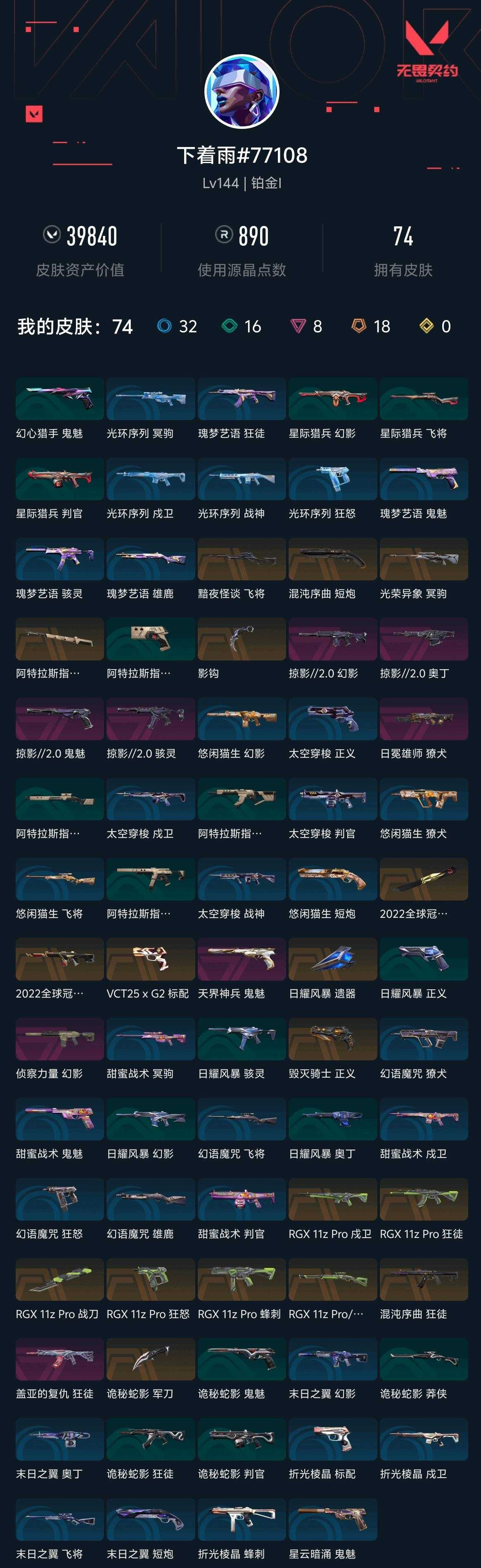 【无畏契约】【yhwww6611】等级:144,已用无畏点39840,已用源晶点890,橙皮:短炮-混沌序曲|飞将-黯夜怪谈|莽侠-rgx 11z pro3.0|狂徒-混沌序曲|正义-毁灭骑士|标配-vct25 x g2|狂怒-rgx 11z pro|近战-诡秘蛇影 军刀|近战-日耀风暴 遗器|狂徒-rgx 11z pro|近战-rgx 11z pro 战刀|戍卫-rgx 11z pro|蜂刺-rgx 11z pro|近战-2022全球冠军赛 蝴蝶刀|幻影-2022全球冠军赛|近战-阿特拉斯指挥部 甩棍|近战-影钩__紫皮:鬼魅-天界神兵|幻影-侦察力量|狂徒-盖亚的复仇|獠犬-日冕雄师|骇灵-掠影2.0|奥丁-掠影2.0|鬼魅-掠影2.0|幻影-掠影2.0__段位:铂金__蓝皮:鬼魅-星云暗涌|蜂刺-折光棱晶|戍卫-折光棱晶|标配-折光棱晶|飞将-末日之翼|幻影-末日之翼|短炮-末日之翼|奥丁-末日之翼|鬼魅-甜蜜战术|判官-甜蜜战术|戍卫-甜蜜战术|雄鹿-幻语魔咒|獠犬-幻语魔咒|飞将-幻语魔咒|狂怒-幻语魔咒|正义-太空穿梭|战神-太空穿梭|判官-太空穿梭|戍卫-太空穿梭|骇灵-阿特拉斯指挥部|莽侠-阿特拉斯指挥部|标配-阿特拉斯指挥部|狂徒-阿特拉斯指挥部|狂怒-光环序列|戍卫-光环序列|冥驹-光环序列|战神-光环序列|狂徒-瑰梦艺语|鬼魅-瑰梦艺语|骇灵-瑰梦艺语|雄鹿-瑰梦艺语__绿皮:判官-诡秘蛇影|鬼魅-诡秘蛇影|莽侠-诡秘蛇影|狂徒-诡秘蛇影|正义-日耀风暴|幻影-日耀风暴|奥丁-日耀风暴|短炮-悠闲猫生|飞将-悠闲猫生|幻影-悠闲猫生|獠犬-悠闲猫生|判官-星际猎兵|飞将-星际猎兵|鬼魅-幻心猎手__英雄:尚勃勒|维斯|黑梦|斯凯|暮蝶|盖可|霓虹|壹决|星礈|k/o|幽影|夜露|钢锁|海神|奇乐|炼狱|铁臂|贤者|猎枭|钛狐|芮娜|零|捷风|蝰蛇|不死鸟|幻棱|雷兹|禁灭