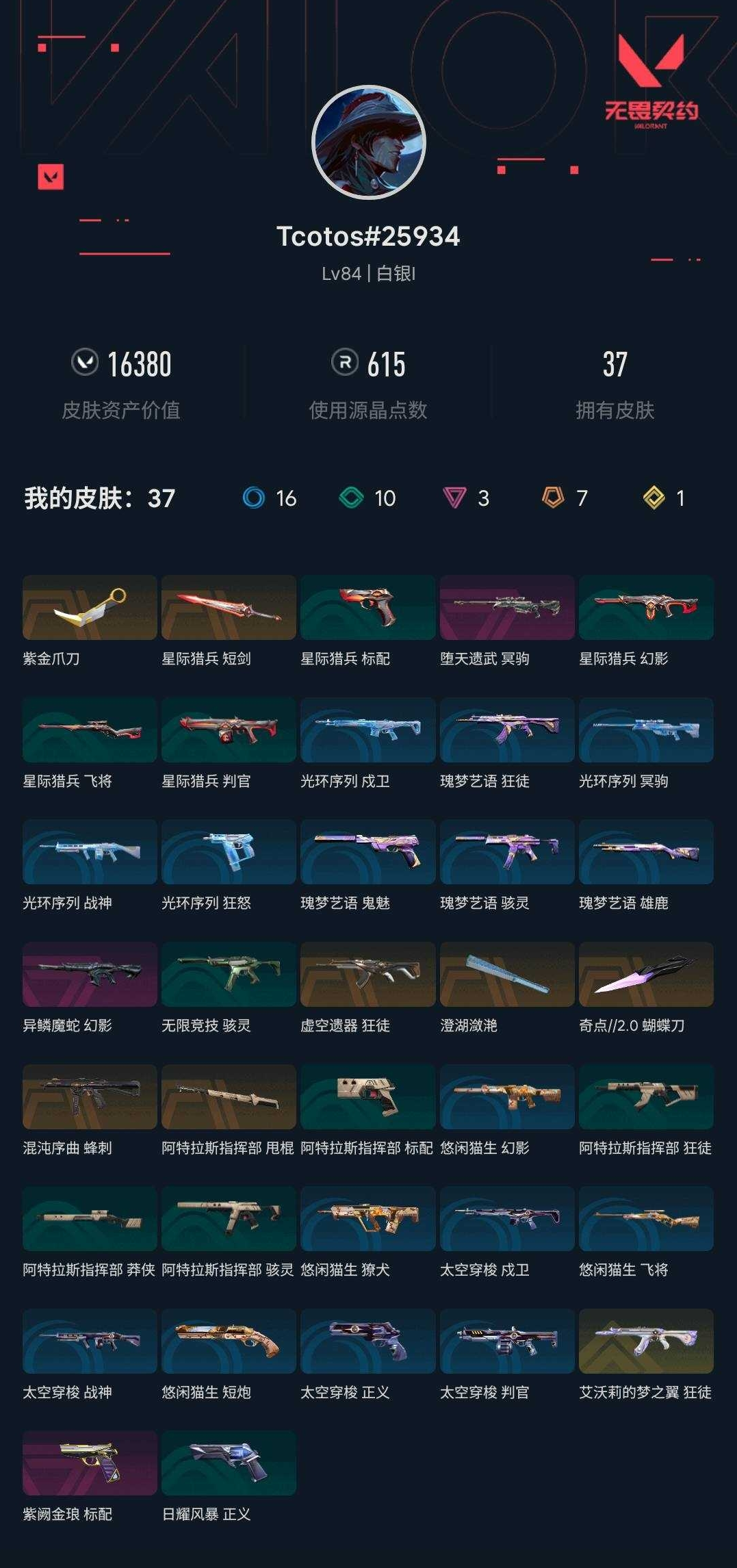 【无畏契约】【yhwww6606】等级:84,已用无畏点16380,已用源晶点615,金皮:狂徒-艾沃莉的梦之翼__橙皮:蜂刺-混沌序曲|近战-澄湖潋滟|近战-紫金爪刀|近战-奇点2.0 蝴蝶刀|狂徒-虚空遗器|近战-阿特拉斯指挥部 甩棍|近战-星际猎兵 短剑__紫皮:标配-紫阙金琅|冥驹-堕天遗武|幻影-异鳞魔蛇__段位:白银__绿皮:骇灵-无限竞技|正义-日耀风暴|短炮-悠闲猫生|飞将-悠闲猫生|幻影-悠闲猫生|獠犬-悠闲猫生|判官-星际猎兵|飞将-星际猎兵|标配-星际猎兵__蓝皮:正义-太空穿梭|战神-太空穿梭|判官-太空穿梭|戍卫-太空穿梭|骇灵-阿特拉斯指挥部|莽侠-阿特拉斯指挥部|标配-阿特拉斯指挥部|狂徒-阿特拉斯指挥部|狂怒-光环序列|戍卫-光环序列|冥驹-光环序列|战神-光环序列|狂徒-瑰梦艺语|鬼魅-瑰梦艺语|骇灵-瑰梦艺语|雄鹿-瑰梦艺语__英雄:尚勃勒|暮蝶|星礈|k/o|钢锁|炼狱|贤者|猎枭|芮娜|捷风|不死鸟|雷兹|禁灭
