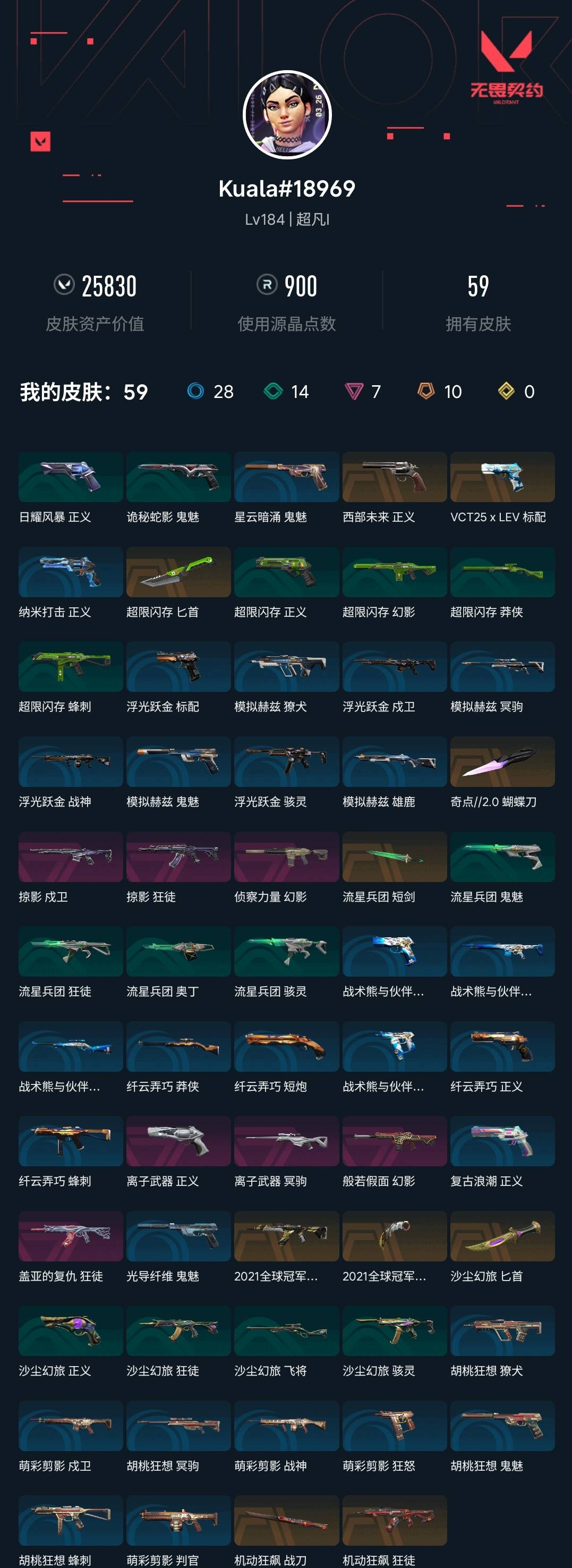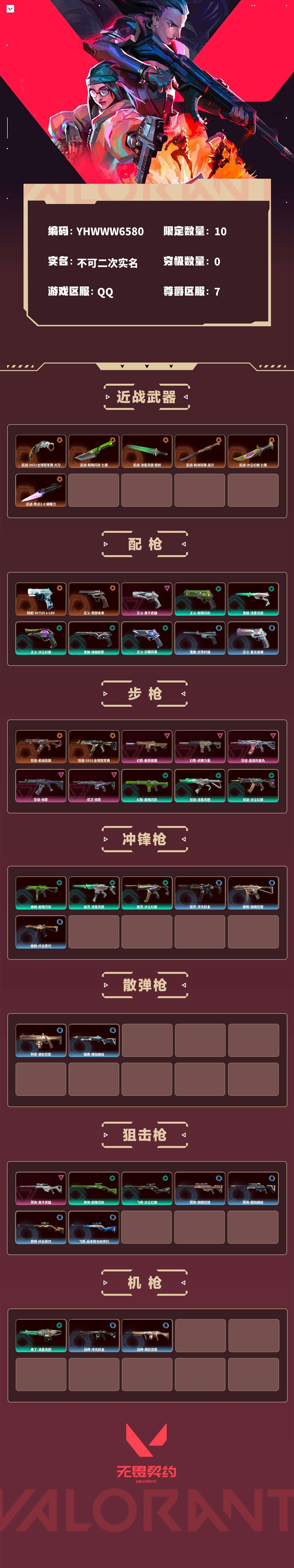 【无畏契约】【yhwww6580】等级:184,已用无畏点25830,已用源晶点900,橙皮:近战-2021全球冠军赛 爪刀|近战-超限闪存 匕首|近战-流星兵团 短剑|近战-机动狂飙 战刀|近战-沙尘幻旅 匕首|狂徒-机动狂飙|狂徒-2021全球冠军赛|近战-奇点2.0 蝴蝶刀|标配-vct25 x lev|正义-西部未来__紫皮:幻影-般若假面|幻影-侦察力量|狂徒-盖亚的复仇|冥驹-离子武器|正义-离子武器|狂徒-掠影|戍卫-掠影__蓝皮:鬼魅-光导纤维|正义-复古浪潮|正义-纳米打击|鬼魅-星云暗涌|骇灵-浮光跃金|标配-浮光跃金|戍卫-浮光跃金|战神-浮光跃金|鬼魅-胡桃狂想|獠犬-胡桃狂想|蜂刺-胡桃狂想|冥驹-胡桃狂想|戍卫-萌彩剪影|战神-萌彩剪影|狂怒-萌彩剪影|判官-萌彩剪影|鬼魅-模拟赫兹|獠犬-模拟赫兹|冥驹-模拟赫兹|雄鹿-模拟赫兹|莽侠-纤云弄巧|正义-纤云弄巧|短炮-纤云弄巧|蜂刺-纤云弄巧|飞将-战术熊与伙伴们|狂怒-战术熊与伙伴们|戍卫-战术熊与伙伴们|标配-战术熊与伙伴们__段位:超凡__绿皮:正义-超限闪存|莽侠-超限闪存|幻影-超限闪存|蜂刺-超限闪存|骇灵-流星兵团|鬼魅-流星兵团|狂徒-流星兵团|奥丁-流星兵团|正义-沙尘幻旅|狂徒-沙尘幻旅|飞将-沙尘幻旅|骇灵-沙尘幻旅|鬼魅-诡秘蛇影|正义-日耀风暴__英雄:尚勃勒|维斯|黑梦|斯凯|暮蝶|盖可|霓虹|壹决|星礈|k/o|幽影|夜露|钢锁|海神|奇乐|炼狱|铁臂|贤者|猎枭|钛狐|芮娜|零|捷风|蝰蛇|不死鸟|幻棱|雷兹