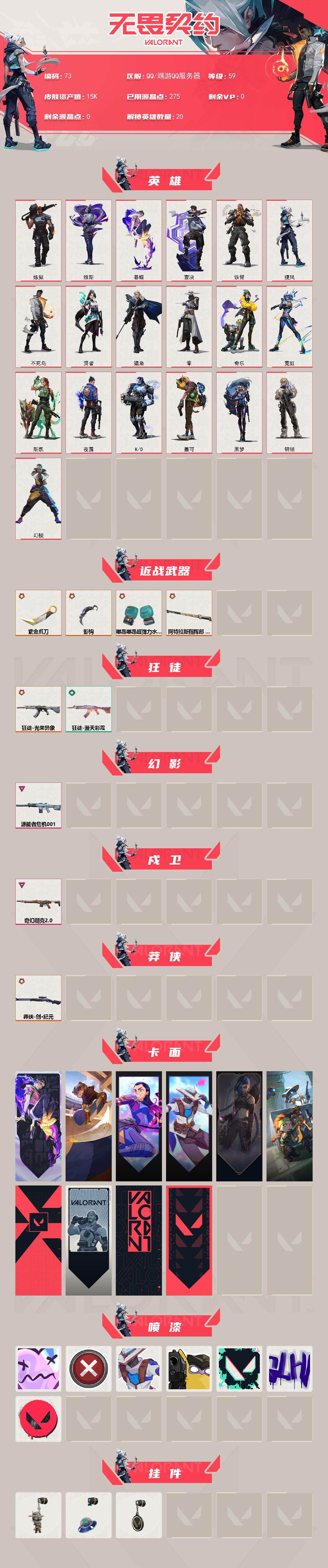 【73】xl38037 【英雄】:幻棱,炼狱,维斯,暮蝶,壹决,铁臂,捷风,不死鸟,贤者,猎枭,零,奇乐,霓虹,斯凯,夜露,k/o,盖可,黑梦,钢锁 【近战 武器】:近战武器-嘟昂嘟昂超弹力水球拳套,近战武器-影钩,近战武器-紫金爪刀,近战武器-阿特拉斯指挥部 甩棍 【狂徒】:狂徒-光荣异象,狂徒-漫天彩霞 【幻影】:幻影-源能者危机001 【戍卫】:戍卫-奇幻朋克//2.0 【莽侠】:莽侠-创·纪元 【卡面】:无畏契约:暮蝶 卡面,clutch 卡面,无畏契约go!第一卷:芮娜 卡面,无畏契约go!第一卷:零 卡面,《双城之战》金克丝 卡面,别冒尖 卡面,代号红色 卡面,新兵报到 卡面,v契约 卡面,无畏契约 卡面 【喷漆】:伤心心 喷漆,买装还是存钱 喷漆,无畏契约go!第一卷:零 喷漆,放下武器 喷漆,胜利属于无畏契约 喷漆,glhf 喷漆,无畏契约 喷漆 【挂饰】:无畏契约go!第一卷 零 挂饰,天外飞客 挂饰,无畏契约 纪念币 挂饰
