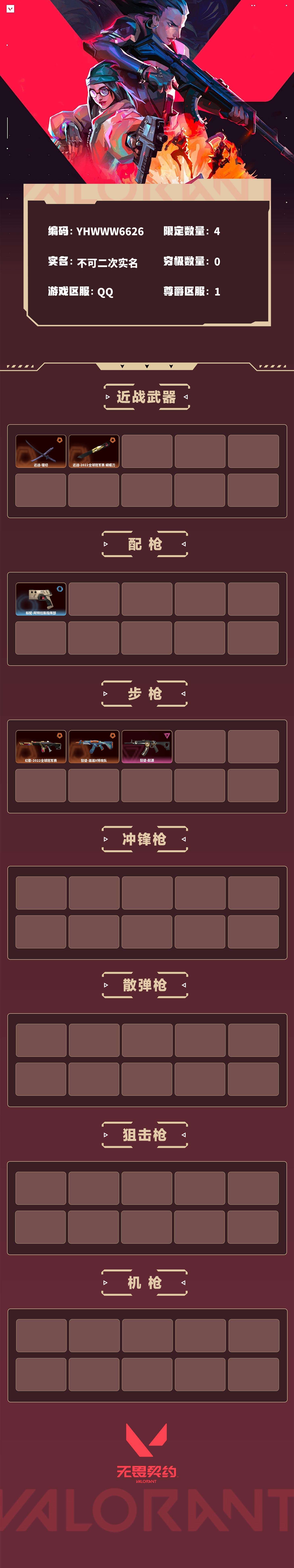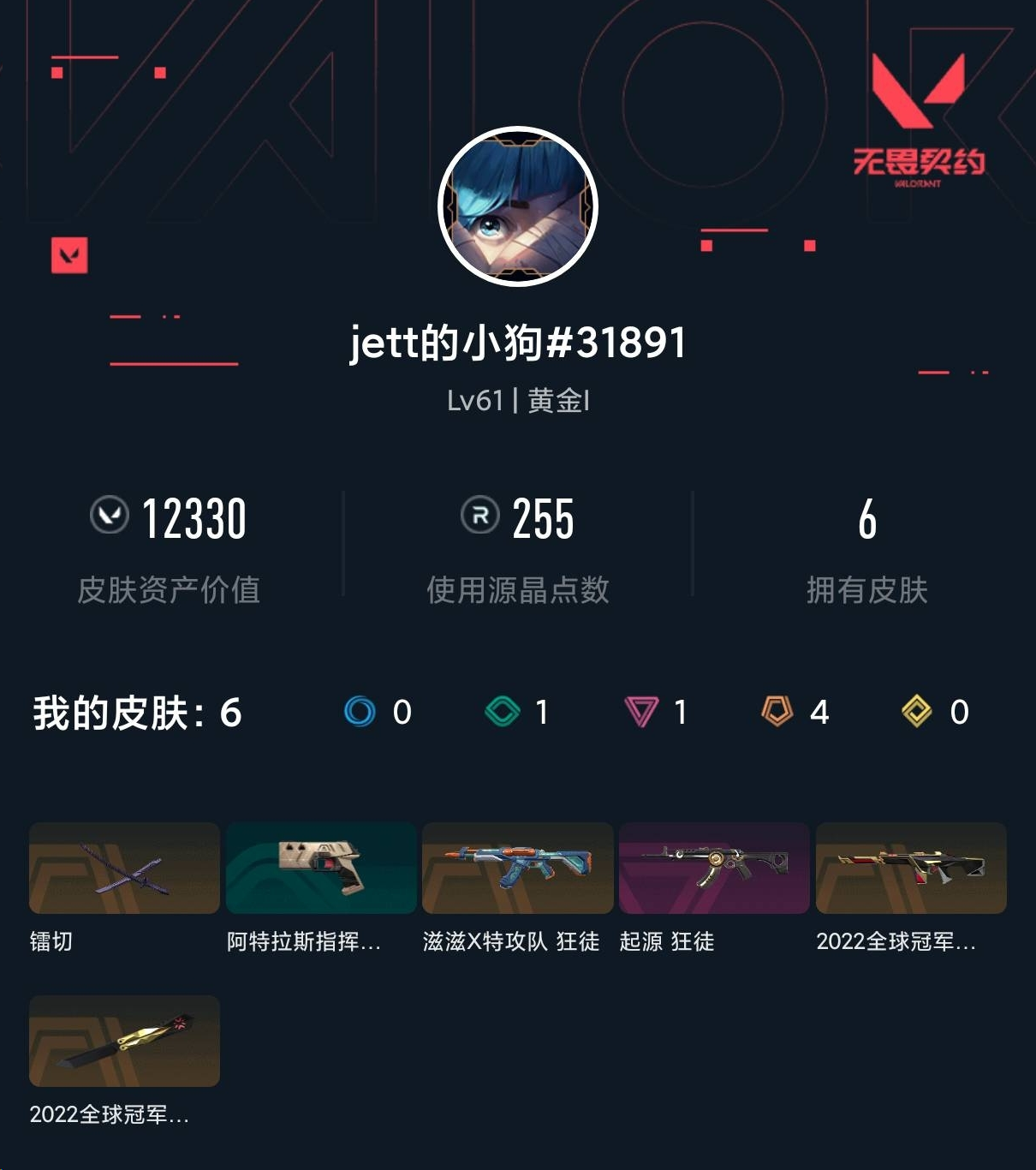 【无畏契约】【yhwww6626】等级:61,已用无畏点12330,已用源晶点255,紫皮:狂徒-起源__段位:黄金__橙皮:近战-镭切|近战-2022全球冠军赛 蝴蝶刀|幻影-2022全球冠军赛|狂徒-滋滋x特攻队__蓝皮:标配-阿特拉斯指挥部__英雄:尚勃勒|黑梦|斯凯|暮蝶|盖可|霓虹|壹决|k/o|幽影|夜露|奇乐|炼狱|贤者|猎枭|钛狐|芮娜|零|捷风|不死鸟