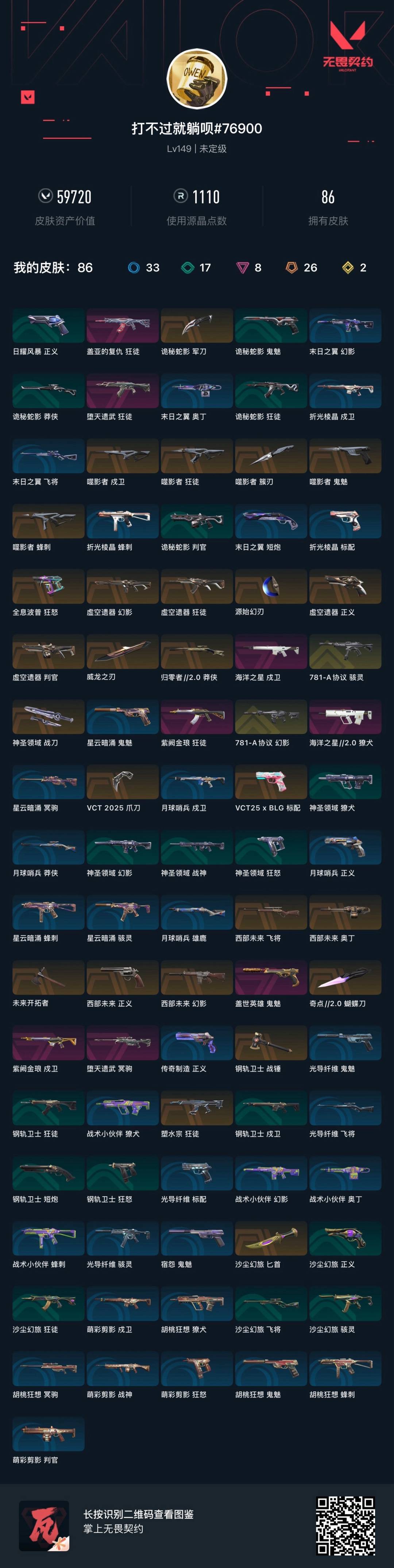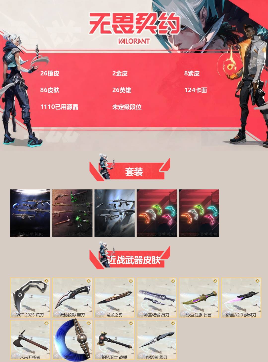 [14233575]26橙皮 2金皮 8紫皮 86皮肤 26英雄 124卡面 1110已用源晶 未定级段位 【套装】:噬影者虚空遗器vct 2025赛季礼包西部未来vcn2025套装 【近战武器皮肤】:源始幻刃神圣领域 战刀未来开拓者vct 2025 爪刀噬影者簇刃诡秘蛇影
