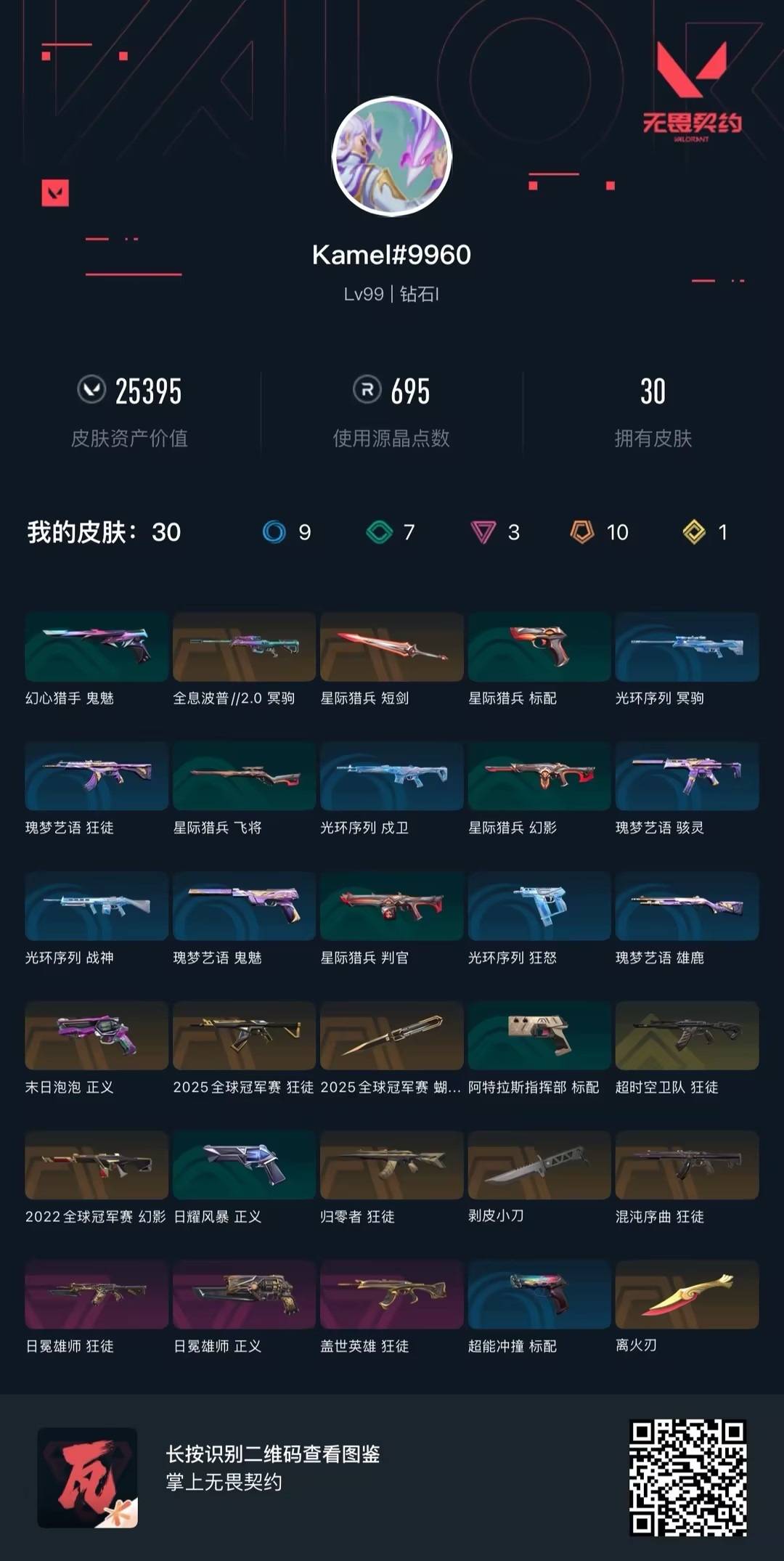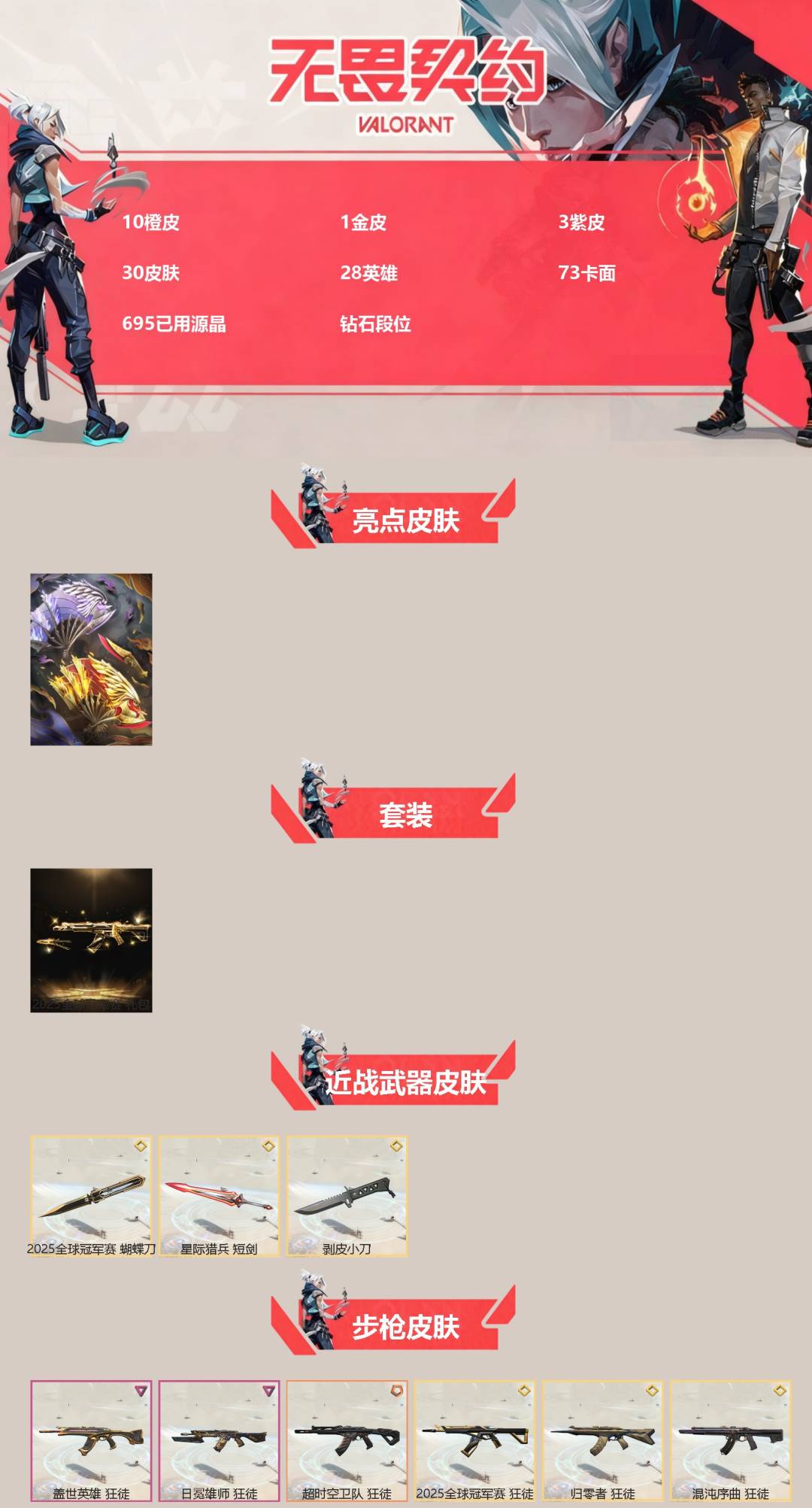 [14234735]10橙皮 1金皮 3紫皮 30皮肤 28英雄 73卡面 695已用源晶 钻石段位 【亮点皮肤】:离火刃 【套装】:2025全球冠军赛 【近战武器皮肤】:星际猎兵 短剑2025全球冠军赛 蝴蝶刀剥皮小刀 【佩呛皮肤】:正义-末日泡泡正义-日冕雄师 【步呛皮肤】:狂徒-混沌序