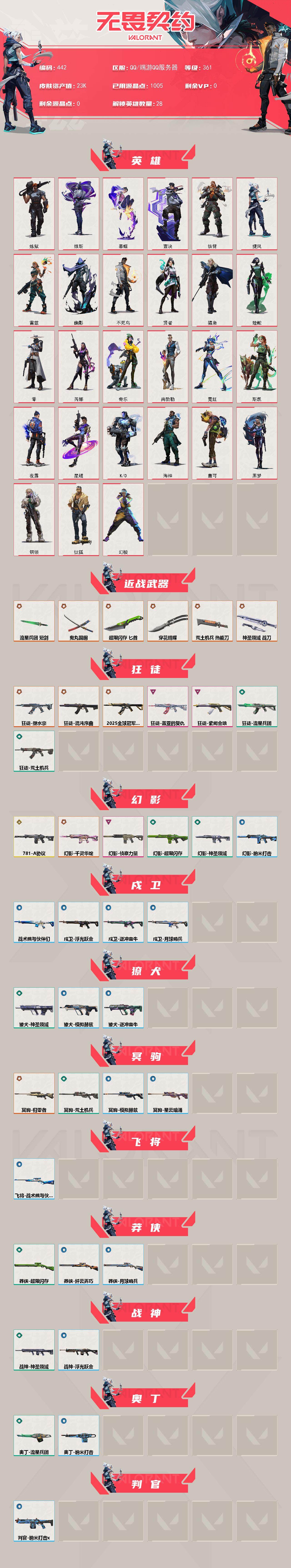 [14234873]【英雄】:幻棱,炼狱,维斯,暮蝶,钛狐,壹决,铁臂,捷风,雷兹,幽影,不死鸟,贤者,猎枭,蝰蛇,零,芮娜,奇乐,尚勃勒,霓虹,斯凯,夜露,星礈,k/o,海神,盖可,黑梦,钢锁 【近战 武器】:近战武器-穿花蝴蝶,近战武器-鬼丸国纲,近战武器-流星兵团 短剑,近战武器-超限闪存 匕首,近战武器-荒土机兵 热能刀,近战武器-神圣领域 战刀 【狂徒】:狂徒-2025全球冠军赛,狂徒-混沌序曲,狂徒-塑水宗,狂徒-盖亚的复仇,狂徒-紫阙金琅,狂徒-荒土机兵,狂徒-流星兵团 【幻影】:幻影-781-a协议,幻影-千灵华绽,幻影-侦察力量,幻影-超限闪存,幻影-神圣领域,幻影-纳米打击 【戍卫】:戍卫-浮光跃金,戍卫-逆冲蛮牛,戍卫-战术熊与伙伴们,戍卫-月球哨兵 【獠犬】:獠犬-神圣领域,獠犬-模拟赫兹,獠犬-逆冲蛮牛 【冥驹】:冥驹-归零者,冥驹-荒土机兵,冥驹-模拟赫兹,冥驹-星云暗涌 【飞将】:飞将-战术熊与伙伴们 【莽侠】:莽侠-超限闪存,莽侠-纤云弄巧,莽侠-月球哨兵 【战神】:战神-神圣领域,战神-浮光跃金 【奥丁】:奥丁-流星兵团,奥丁-纳米打击 【判官】:判官-纳米打击x 【雄鹿】:雄鹿-模拟赫兹,雄鹿-逆冲蛮牛,雄鹿-月球哨兵 【骇灵】:骇灵-荒土机兵,骇灵-流星兵团,骇灵-浮光跃金,骇灵-星云暗涌 【蜂刺】:蜂刺-超限闪存,蜂刺-纤云弄巧,蜂刺-星云暗涌 【标配】:标配-超能偶像,标配-荒土机兵,标配-浮光跃金,标配-艺高胆大,标配-战术熊与伙伴们 【正义】:正义-西部未来,正义-掠影,正义-超限闪存,正义-传奇制造,正义-纳米打击,正义-纤云弄巧,正义-游戏结束,正义-月球哨兵 【鬼魅】:鬼魅-流星兵团,鬼魅-诡秘蛇影,鬼魅-模拟赫兹,鬼魅-扑棱扑棱,鬼魅-星云暗涌 【狂怒】:狂怒-神圣领域,狂怒-逆冲蛮牛,狂怒-战术熊与伙伴们,狂怒-万花棱镜 【短炮】:短炮-好搭档,短炮-纤云弄巧 【卡面】:终章:激斗汉堡 卡面,进入射程 卡面,分崩离析 卡面,纳米打击 卡面,抑制技术 卡面,激斗汉堡 卡面,瓦娃脸雪糕 p2 卡面,从黄昏到黎明 卡面,荒土机兵 卡面,银弹猎手 卡面,逆冲蛮牛 卡面,《双城之战》拥抱 卡面,精灵大战 卡面,欢迎来到底城 卡面,南瓜盛典 卡面,唱片的故事 卡面,钢弓与箭弦 卡面,无畏契约:暮蝶 卡面,排除故障 卡面,战术桌游 卡面,悠享