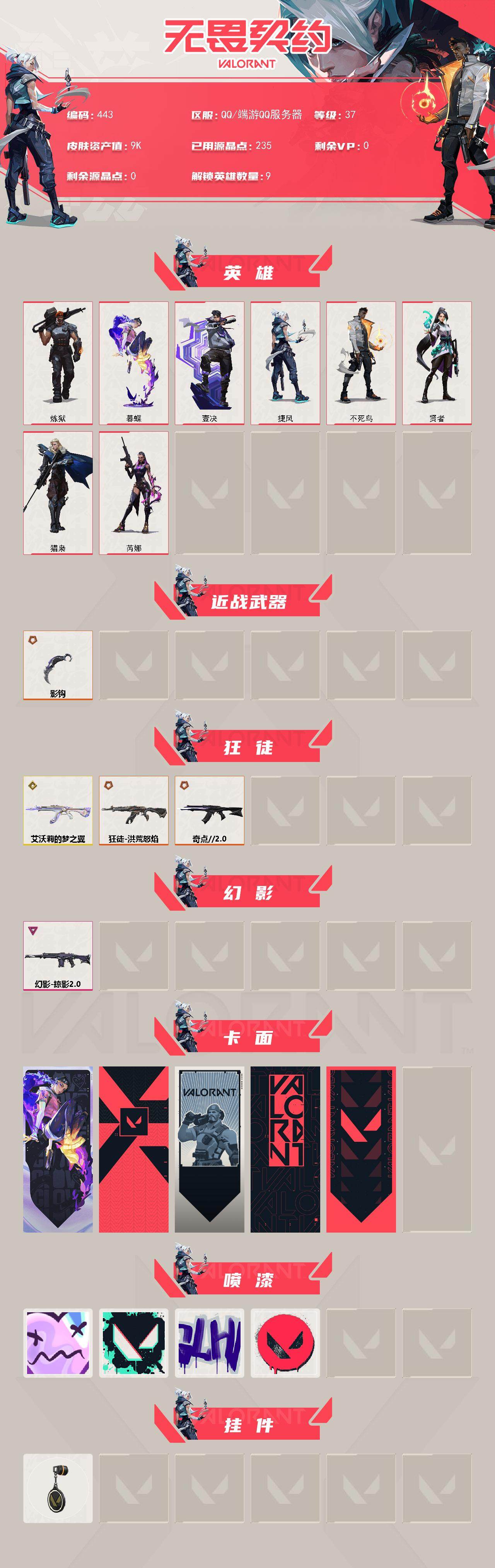 [14234908]【英雄】:炼狱,暮蝶,壹决,捷风,不死鸟,贤者,猎枭,芮娜 【近战 武器】:近战武器-影钩 【狂徒】:狂徒-艾沃莉的梦之翼,狂徒-洪荒怒焰,狂徒-奇点//2.0 【幻影】:幻影-掠影//2.0 【卡面】:无畏契约:暮蝶 卡面,代号红色 卡面,新兵报到 卡面,v契约 卡面,无畏契约 卡面 【喷漆】:伤心心 喷漆,胜利属于无畏契约 喷漆,glhf 喷漆,无畏契约 喷漆 【挂饰】:无畏契约 纪念币 挂饰