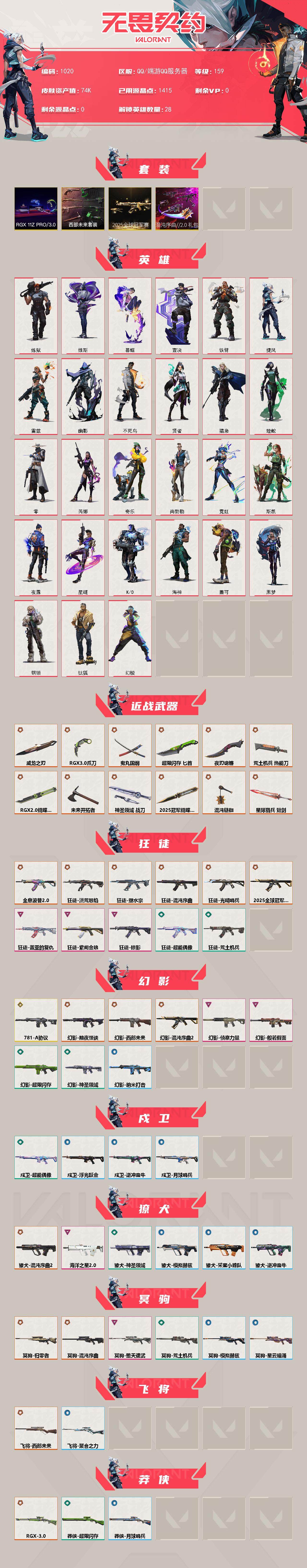【1020】xl20416 【套装】:2025全球冠军赛套装,混沌序曲//2.0套装,西部未来套装,rgx 11z pro//3.0套装 【英雄】:幻棱,炼狱,维斯,暮蝶,钛狐,壹决,铁臂,捷风,雷兹,幽影,不死鸟,贤者,猎枭,蝰蛇,零,芮娜,奇乐,尚勃勒,霓虹,斯凯,夜露,星礈,k/o,海神,盖可,黑梦,钢锁 【近战 武器】:近战武器-2025全球冠军赛 蝴蝶刀,近战武器-混沌链枷,近战武器-rgx 11z pro//2.0 蝴蝶刀,近战武器-rgx 11z pro//3.0 爪刀,近战武器-威龙之刃,近战武器-鬼丸国纲,近战武器-未来开拓者,近战武器-超限闪存 匕首,近战武器-荒土机兵 热能刀,近战武器-夜刃诡镰,近战武器-神圣领域 战刀,近战武器-星际猎兵 短剑 【狂徒】:狂徒-2025全球冠军赛,狂徒-光明哨兵,狂徒-洪荒怒焰,狂徒-混沌序曲,狂徒-全息波普//2.0,狂徒-塑水宗,狂徒-掠影,狂徒-盖亚的复仇,狂徒-紫阙金琅,狂徒-超能偶像,狂徒-荒土机兵 【幻影】:幻影-781-a协议,幻影-黯夜怪谈,幻影-西部未来,幻影-混沌序曲//2.0,幻影-般若假面,幻影-侦察力量,幻影-超限闪存,幻影-神圣领域,幻影-纳米打击,幻影-西部未来 【戍卫】:戍卫-超能偶像,戍卫-浮光跃金,戍卫-逆冲蛮牛,戍卫-月球哨兵 【獠犬】:獠犬-混沌序曲//2.0,獠犬-海洋之星//2.0,獠犬-神圣领域,獠犬-采蜜小蜂队,獠犬-模拟赫兹,獠犬-逆冲蛮牛 【冥驹】:冥驹-归零者,冥驹-混沌序曲,冥驹-堕天遗武,冥驹-荒土机兵,冥驹-模拟赫兹,冥驹-星云暗涌 【飞将】:飞将-西部未来,飞将-聚合之力 【莽侠】:莽侠-rgx 11z pro//3.0,莽侠-超限闪存,莽侠-月球哨兵 【战神】:战神-神圣领域,战神-采蜜小蜂队,战神-浮光跃金 【奥丁】:奥丁-西部未来,奥丁-纳米打击 【判官】:判官-超能偶像,判官-采蜜小蜂队,判官-纳米打击x 【雄鹿】:雄鹿-模拟赫兹,雄鹿-逆冲蛮牛,雄鹿-月球哨兵 【骇灵】:骇灵-混沌序曲//2.0,骇灵-荒土机兵,骇灵-无限竞技,骇灵-浮光跃金,骇灵-星云暗涌 【蜂刺】:蜂刺-超限闪存,蜂刺-聚合之力,蜂刺-星云暗涌 【标配】:标配-荒土机兵,标配-浮光跃金 【vct手呛】:标配-vct25 x lev 【正义】:正义-rgx 11z pro//3.0,正义-光明哨兵,正义-创·纪元,正义-西部未来,正义-混沌序曲//2.0,正义-超限闪存,正义-纳米打击,正义-月球哨兵 【鬼魅】:鬼魅-天界神兵,鬼魅-诡秘蛇影,鬼魅-采蜜小蜂队,鬼魅-模拟赫兹,鬼魅-星云暗涌 【狂怒】:狂怒-神圣领域,狂怒-聚合之力,狂怒-逆冲蛮牛 【卡面】:终章:激斗汉堡 卡面,进入射程 卡面,分崩离析 卡面,纳米打击 卡面,抑制技术 卡面,激斗汉堡 卡面,瓦娃脸雪糕 p2 卡面,从黄昏到黎明 卡面,荒土机兵 卡面,银弹猎手 卡面,逆冲蛮牛 卡面,《双城之战》拥抱 卡面,精灵大战 卡面,欢迎来到底城 卡面,南瓜盛典 卡面,vct cn首冠 卡面,唱片的故事 卡面,钢弓与箭弦 卡面,排除故障 卡面,战术桌游 卡面,悠享食光 卡面,修车达人 卡面,热舞环节 卡面,模拟赫兹 卡面,浮光跃金 卡面,超限闪存 卡面,维斯工牌 卡面,正义的化身 卡面,时间到 卡面,最高舞台 卡面,归乡 // 蝰蛇 卡面,超能偶像 卡面,生意人麦宝 卡面,声感陷阱设计图 卡面,霓帧牛蛙 卡面,钢锁工牌 卡面,战术小伙伴的夏日 卡面,采蜜小蜂队 卡面,聚合之力 卡面,梦幻奶茶 卡面,无畏契约go!第一卷:芮娜 卡面,无畏契约go!第一卷:零 卡面,《双城之战》金克丝 卡面,代号红色 卡面,冰淇淋店 卡面,新兵报到 卡面,友军火力 卡面,v契约 卡面,无畏契约 卡面 【喷漆】:小小心意 喷漆,战“素”兔 喷漆,宇宙的指引 喷漆,请求重启 喷漆,逆冲蛮牛 喷漆,纳米打击 喷漆,鼻尖上的蝴蝶 喷漆,简笔画黯兽 喷漆,独守蝰腹 喷漆,他们将落荒而逃 喷漆,通缉:战术企鹅 喷漆,荒土机兵 喷漆,别挡我吃球! 喷漆,嗨宝南瓜灯 喷漆,嘭! 喷漆,都算到了 喷漆,控场勿近 喷漆,皮蛋呼呼 喷漆,像素星礈 喷漆,图谋不轨的零 喷漆,小丑猫 喷漆,模拟赫兹 喷漆,高丽风情小熊 喷漆,蹲到一个 喷漆,全力集中 喷漆,超限闪存 喷漆,rua一下 喷漆,熊抱 喷漆,蛋糕还是爆能器? 喷漆,高丽风情小虎 喷漆,记在小本本 喷漆,防弹企鹅 喷漆,高丽风情小蛙 喷漆,超级粉丝 喷漆,捷风差距 喷漆,惊声尖叫 喷漆,五人成星 喷漆,超能偶像 喷漆,放我出去 喷漆,掩护我 喷漆,大佬发呛 喷漆,边缘试探 喷漆,拼一呛 喷漆,聚合之力 喷漆,采蜜小蜂队 喷漆,梦幻小队 喷漆,五个全都齐了 喷漆,买装还是存钱 喷漆,无畏契约go!第一卷:捷风 喷漆,暴走萝莉 喷漆,胜利属于无畏契约 喷漆,glhf 喷漆,无畏契约 喷漆 【挂饰】:终章:猫猫木乃伊 挂饰,荒土机兵 挂饰,悠闲鸡块 挂饰,猫猫木乃伊 挂饰,水壶 挂饰,纳米打击 挂饰,逆冲蛮牛 挂饰,可爱糖糖 挂饰,伞绳 挂饰,《双城之战》小蛋糕 挂饰,第九季//第三幕 纪念币 挂饰,拳击战术熊 挂饰,工具腰带 挂饰,暗藏猫腻 挂饰,高丽风情 挂饰,熔岩灯 挂饰,超限闪存 挂饰,瞬云履 挂饰,迷你k/o 挂饰,模拟赫兹 挂饰,第九季//第二幕 纪念币 挂饰,袖珍捷风 挂饰,冲上云霄 挂饰,超能偶像 挂饰,迷你浓缩 挂饰,这瓜保熟 挂饰,动力机箱 挂饰,采蜜小蜂队 挂饰,第九季//第一幕 纪念币 挂饰,聚合之力 挂饰,天外飞客 挂饰,无畏契约 纪念币 挂饰