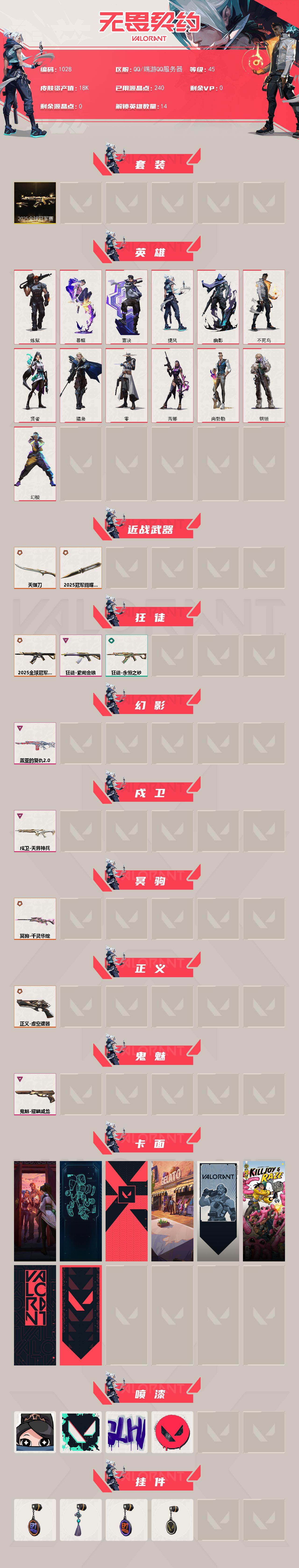 【1028】xl35374 【套装】:2025全球冠军赛套装 【英雄】:幻棱,炼狱,暮蝶,壹决,捷风,幽影,不死鸟,贤者,猎枭,零,芮娜,尚勃勒,钢锁 【近战 武器】:近战武器-2025全球冠军赛 蝴蝶刀,近战武器-天御刀 【狂徒】:狂徒-2025全球冠军赛,狂徒-紫阙金琅,狂徒-永恒之砂 【幻影】:幻影-盖亚的复仇//2.0 【戍卫】:戍卫-天界神兵 【冥驹】:冥驹-千灵华绽 【正义】:正义-虚空遗器 【鬼魅】:鬼魅-耀鳞威龙 【卡面】:热烈欢迎 卡面,铁臂设计图 卡面,代号红色 卡面,冰淇淋店 卡面,新兵报到 卡面,友军火力 卡面,v契约 卡面,无畏契约 卡面 【喷漆】:口袋贤者 喷漆,胜利属于无畏契约 喷漆,glhf 喷漆,无畏契约 喷漆 【挂饰】:第七季//第三幕 纪念币 挂饰,幸运中国结 挂饰,第七季//第二幕 纪念币 挂饰,无畏契约 纪念币 挂饰