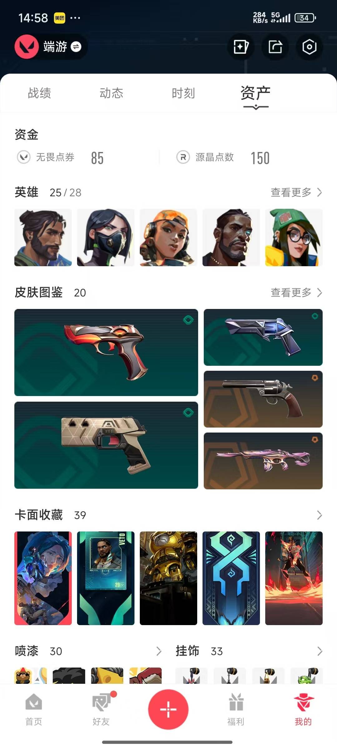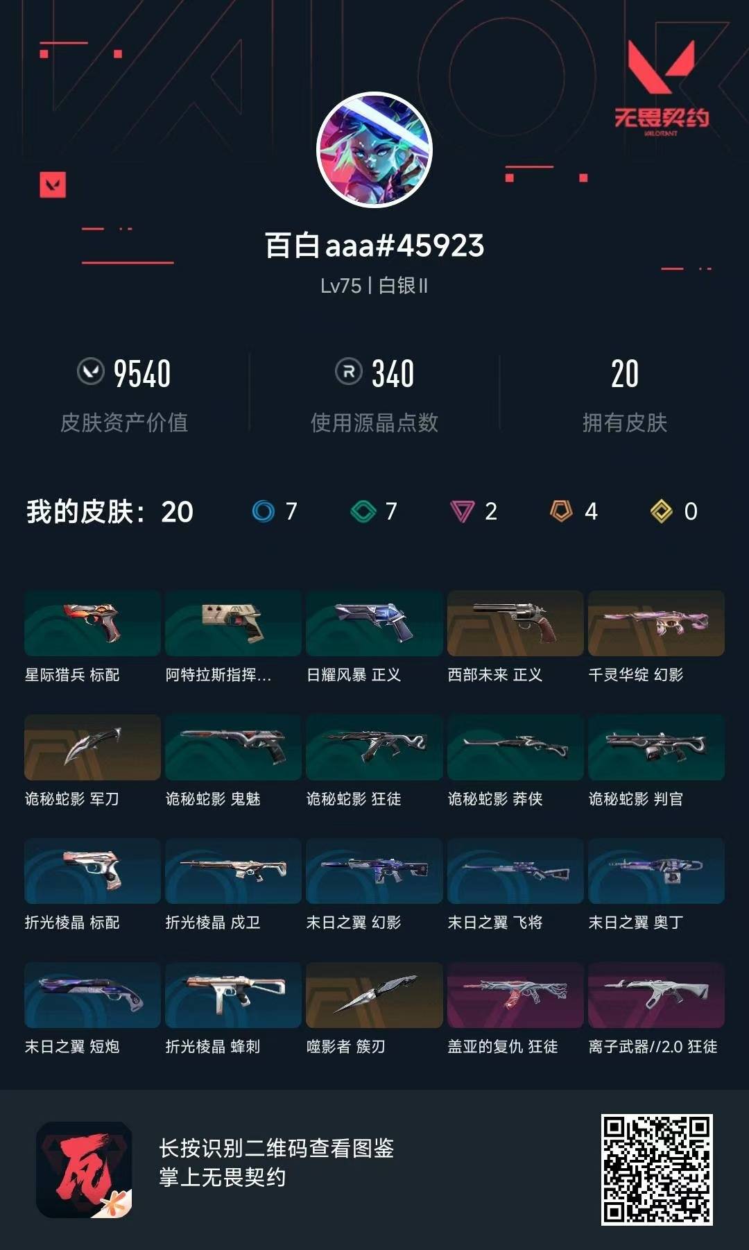 [14235913]4橙皮 2紫皮 20皮肤 25英雄 39卡面 340已用源晶 白银段位 【近战武器皮肤】:噬影者簇刃诡秘蛇影 【佩呛皮肤】:正义-西部未来 【步呛皮肤】:狂徒-离子武器2.0狂徒-盖亚的复仇幻影-千灵华绽 【挂饰】:神中神挂饰v25第三幕:黑铁 挂饰