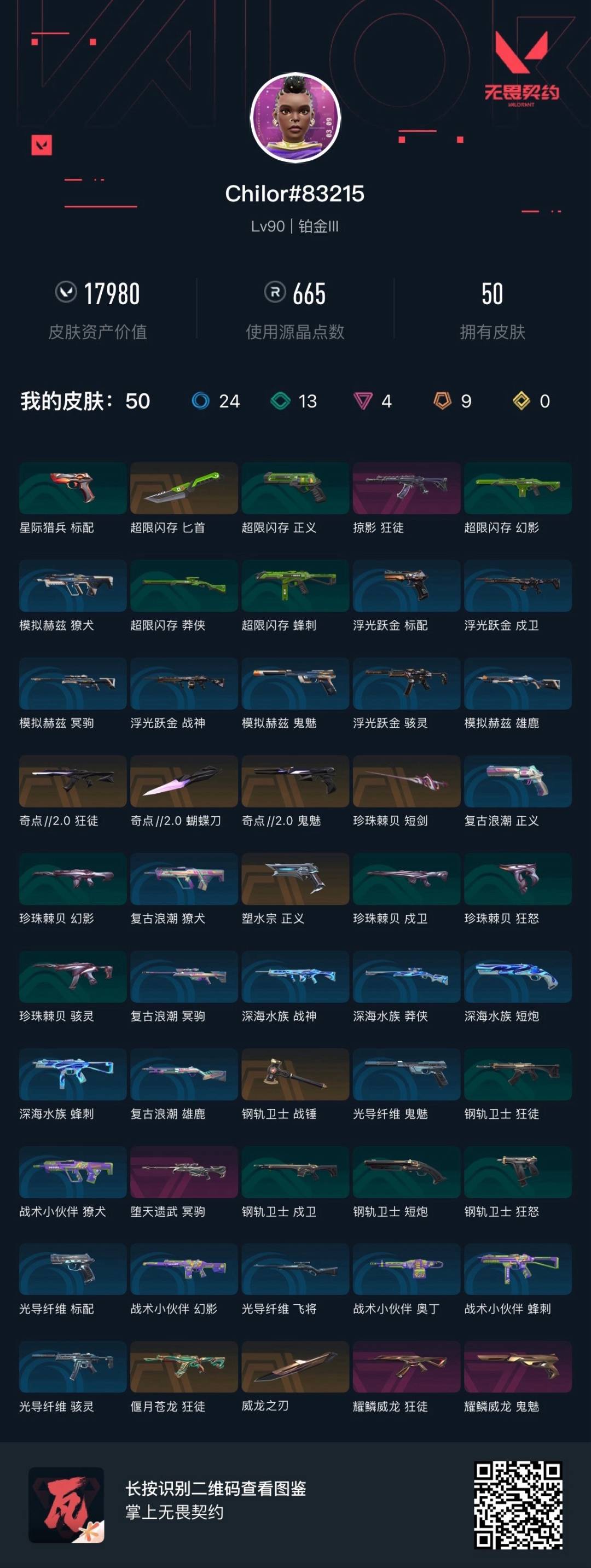 [14236403]9橙皮 4紫皮 50皮肤 25英雄 92卡面 665已用源晶 铂金段位 【套装】:奇点//2.0套装耀鳞威龙套装 【近战武器皮肤】:匕首-超限闪存战锤-钢轨卫士蝴蝶刀-奇点//2.0威龙之刃短剑-珍珠棘贝 【佩呛皮肤】:鬼魅-奇点//2.0正义-塑水宗鬼魅-耀鳞威龙 【步呛皮肤】:狂徒-奇点//2.0狂徒-掠影狂徒-耀鳞威龙狂徒-偃月苍龙 【狙击呛皮肤】:冥驹-堕天遗武 【挂饰】:袖珍捷风挂饰传世莲华挂饰双城之战小蛋糕挂饰神中神挂饰奇点2.0挂饰耀鳞威龙挂饰终章ko小金人挂饰