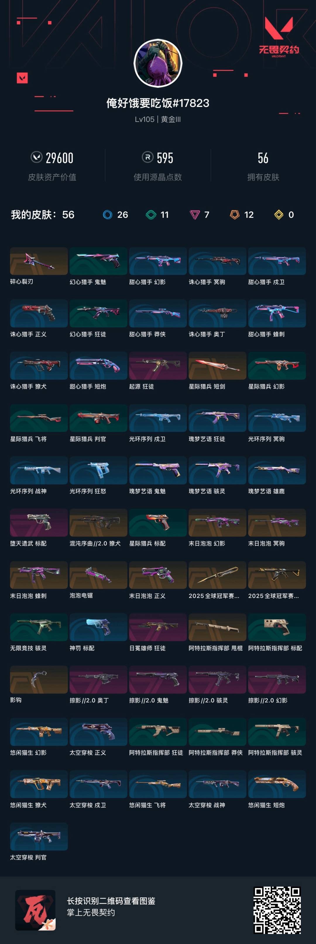 12橙皮 7紫皮 56皮肤 26英雄 75卡面 595已用源晶 黄金段位 【套装】:2025全球冠军赛掠影2.0套装 【近战武器皮肤】:阿特拉斯指挥部泡泡电锯碎心裂刃星际猎兵 短剑影钩2025全球冠军赛 蝴蝶刀 【佩呛皮肤】:鬼魅-掠影2.0正义-末日泡泡标配-堕天遗武 【冲锋呛皮