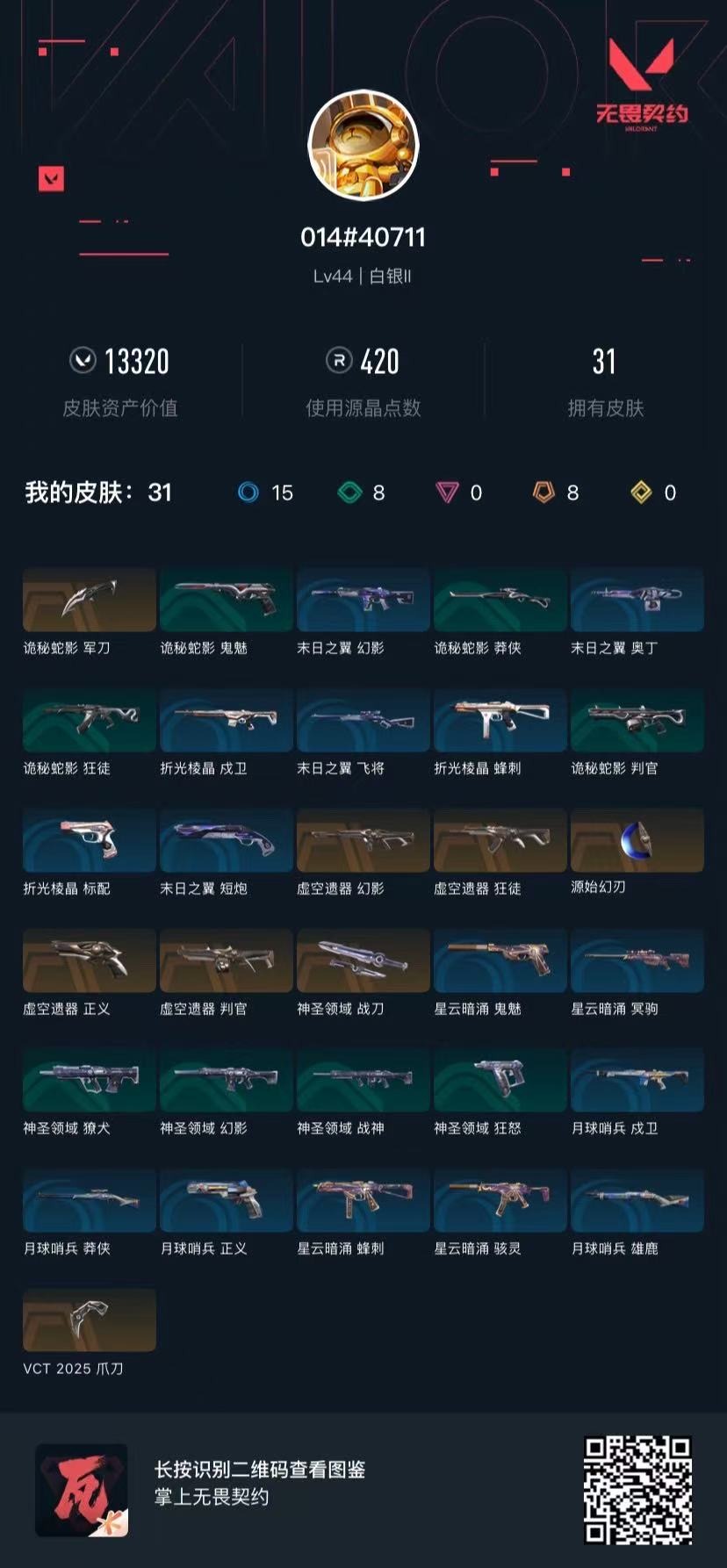 [14238185]8橙皮 31皮肤 16英雄 47卡面 420已用源晶 白银段位 【套装】:虚空遗器vct 2025赛季礼包vcn2025套装 【近战武器皮肤】:神圣领域 战刀源始幻刃vct 2025 爪刀诡秘蛇影 【佩呛皮肤】:正义-虚空遗器 【霰弹呛皮肤】:判官-虚空遗器 【步