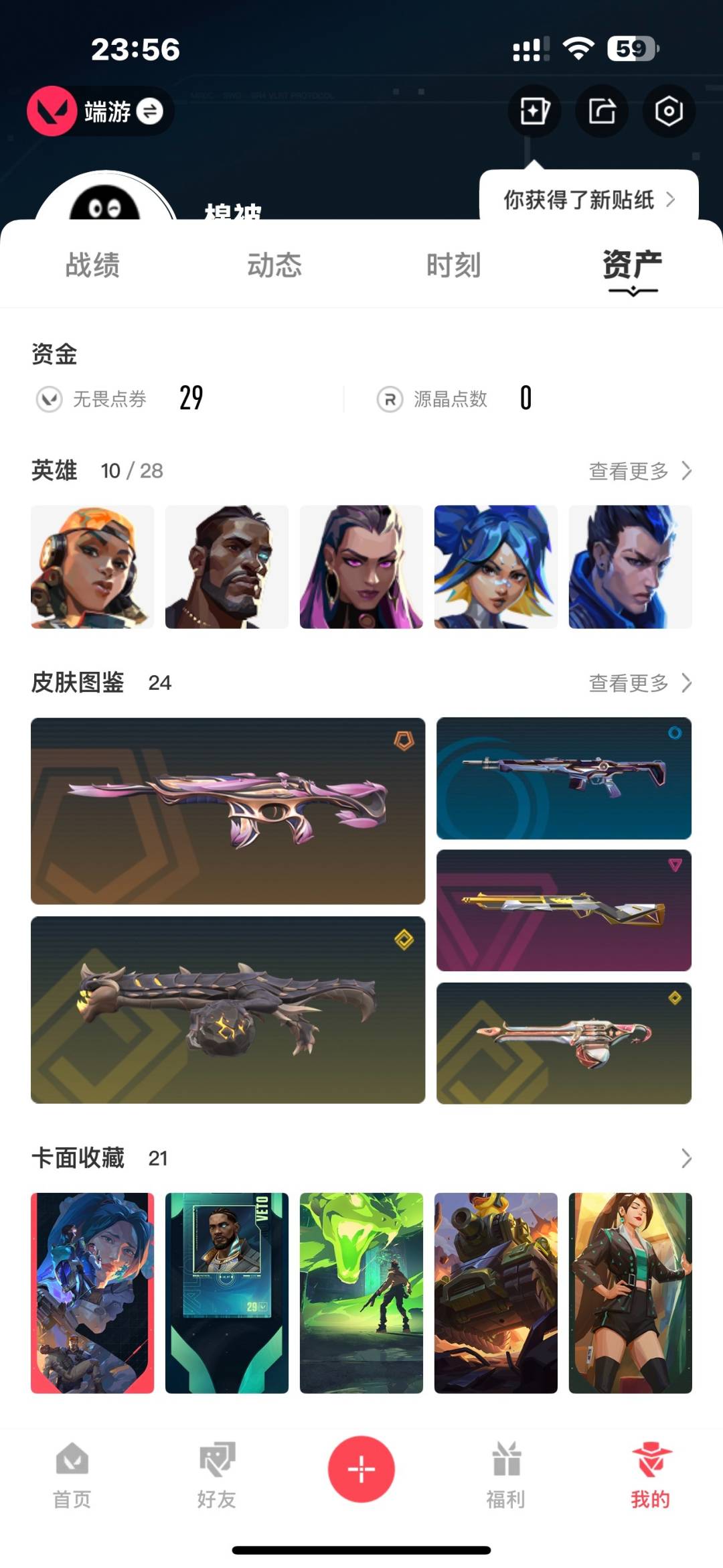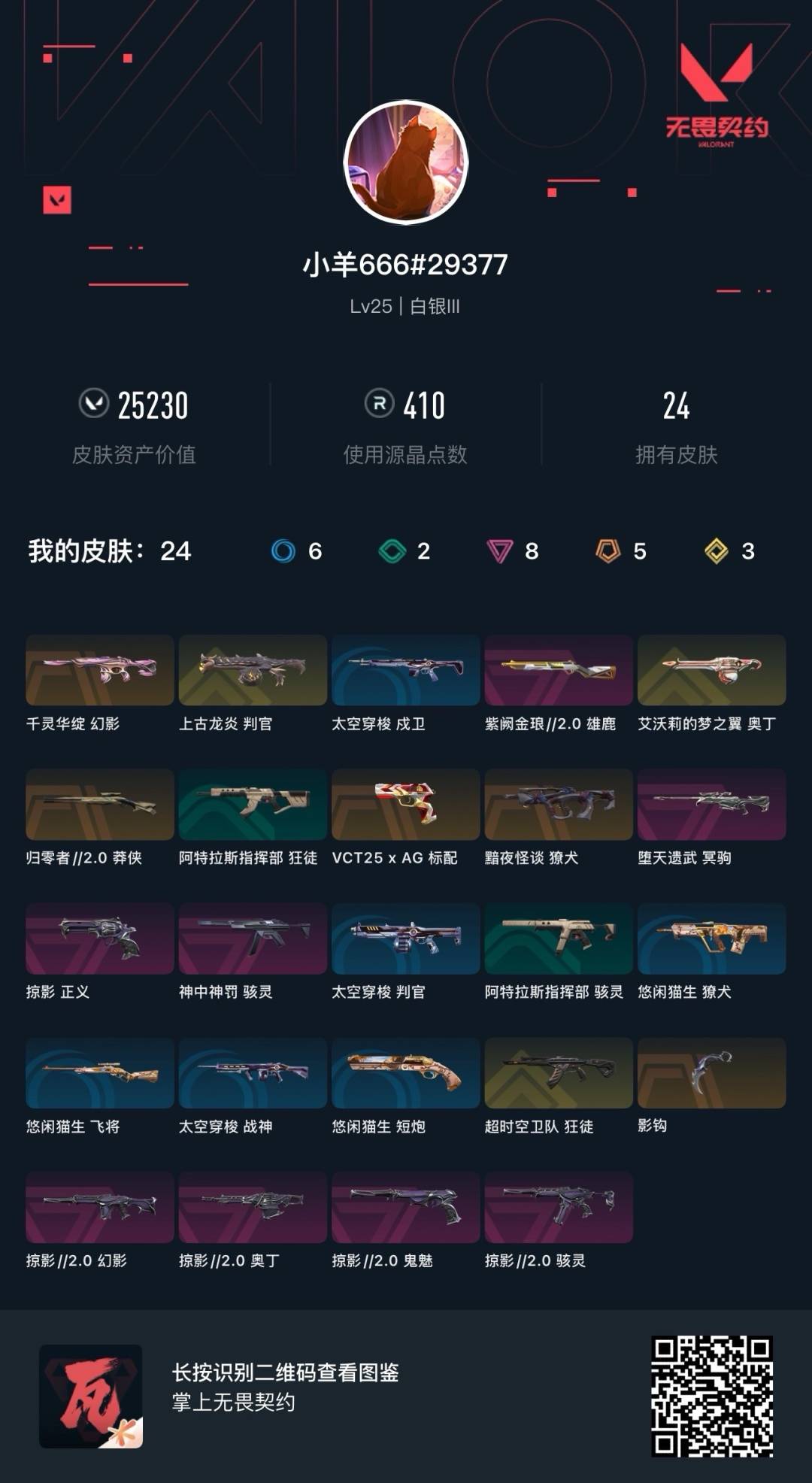 [14239050]5橙皮 3金皮 8紫皮 24皮肤 10英雄 21卡面 410已用源晶 白银段位 【套装】:掠影2.0套装 【近战武器皮肤】:影钩 【佩呛皮肤】:标配-vct25xag正义-掠影鬼魅-掠影2.0 【冲锋呛皮肤】:骇灵-掠影2.0骇灵-神中神罚 【霰弹呛皮肤】:判官-上古龙炎