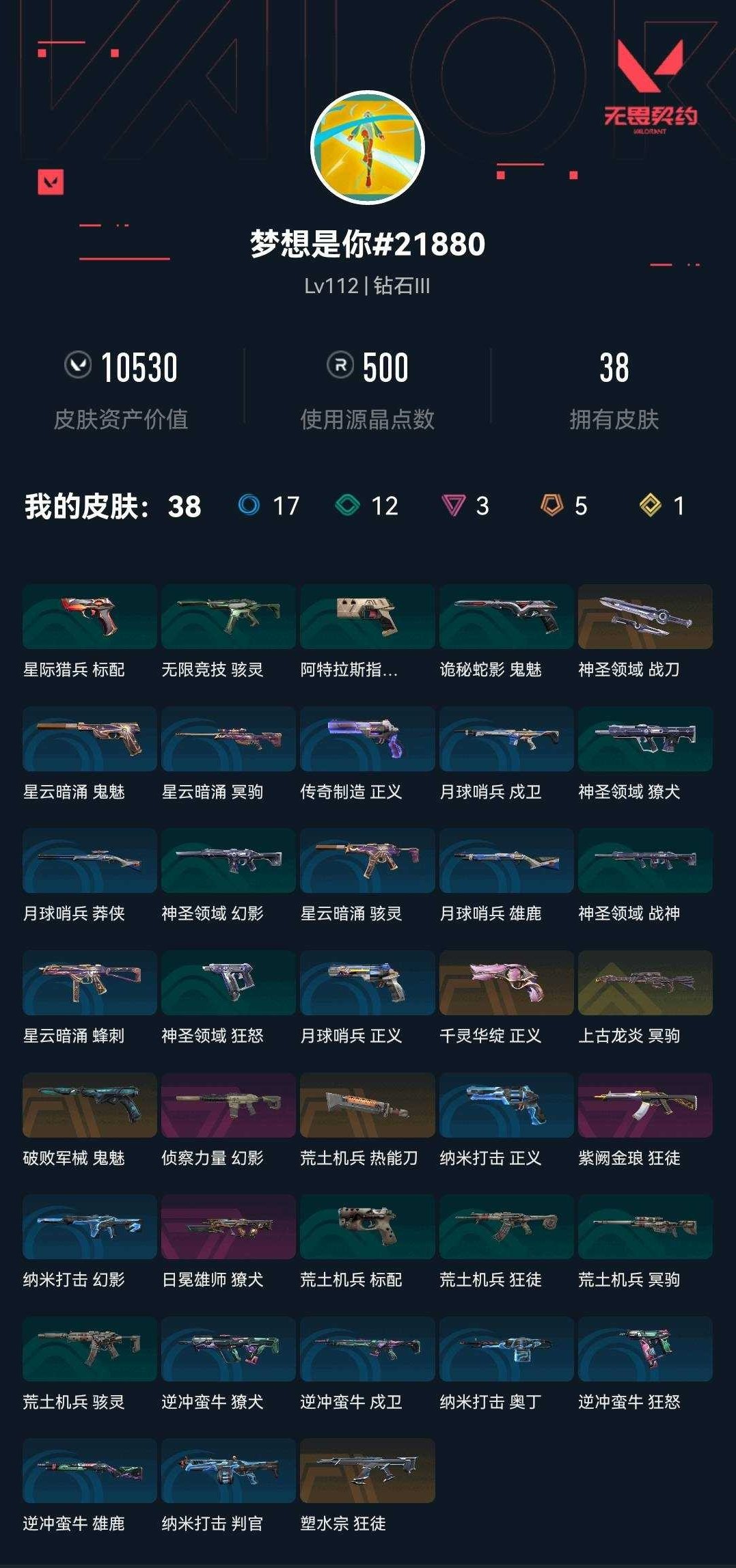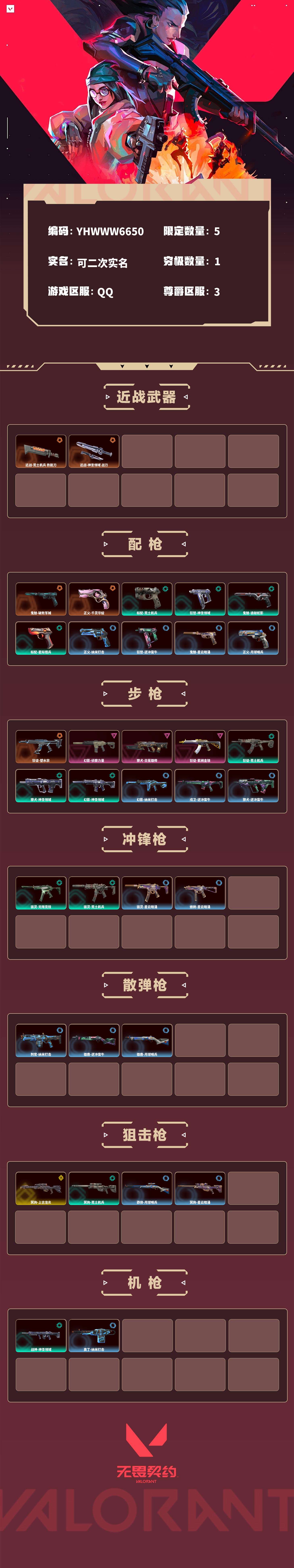 【无畏契约】【yhwww6650】等级:112,已用无畏点10530,已用源晶点500,橙皮:鬼魅-破败军械|狂徒-塑水宗|正义-千灵华绽|近战-荒土机兵 热能刀|近战-神圣领域 战刀__紫皮:幻影-侦察力量|獠犬-日冕雄师|狂徒-紫阙金琅__段位:钻石__绿皮:骇灵-无限竞技|狂徒-荒土机兵|标配-荒土机兵|骇灵-荒土机兵|冥驹-荒土机兵|獠犬-神圣领域|狂怒-神圣领域|战神-神圣领域|幻影-神圣领域|鬼魅-诡秘蛇影|标配-星际猎兵__蓝皮:判官-纳米打击|正义-纳米打击|奥丁-纳米打击|幻影-纳米打击|雄鹿-逆冲蛮牛|狂怒-逆冲蛮牛|戍卫-逆冲蛮牛|獠犬-逆冲蛮牛|鬼魅-星云暗涌|骇灵-星云暗涌|正义-月球哨兵|莽侠-月球哨兵|戍卫-月球哨兵|雄鹿-月球哨兵|正义-传奇制造|冥驹-星云暗涌|蜂刺-星云暗涌|标配-阿特拉斯指挥部__金皮:冥驹-上古龙炎__英雄:尚勃勒|维斯|暮蝶|壹决|星礈|k/o|幽影|奇乐|炼狱|铁臂|贤者|猎枭|钛狐|芮娜|零|捷风|蝰蛇|不死鸟|幻棱|禁灭
