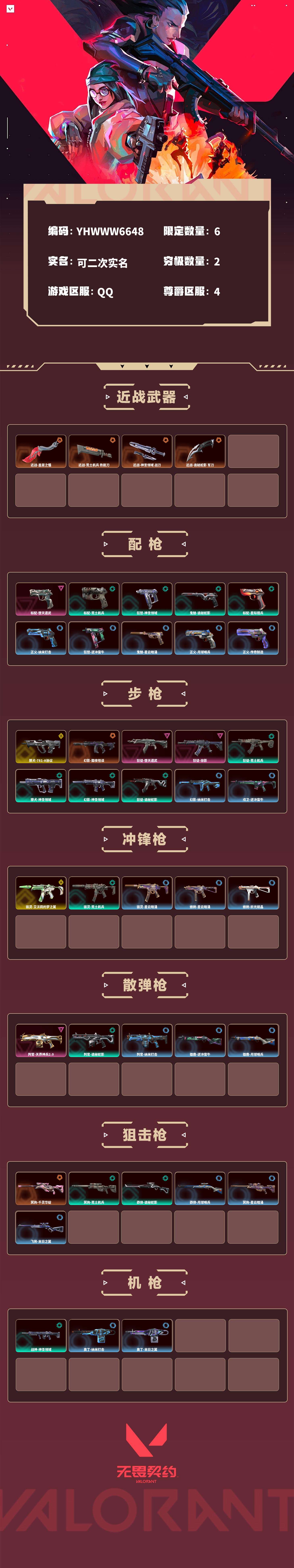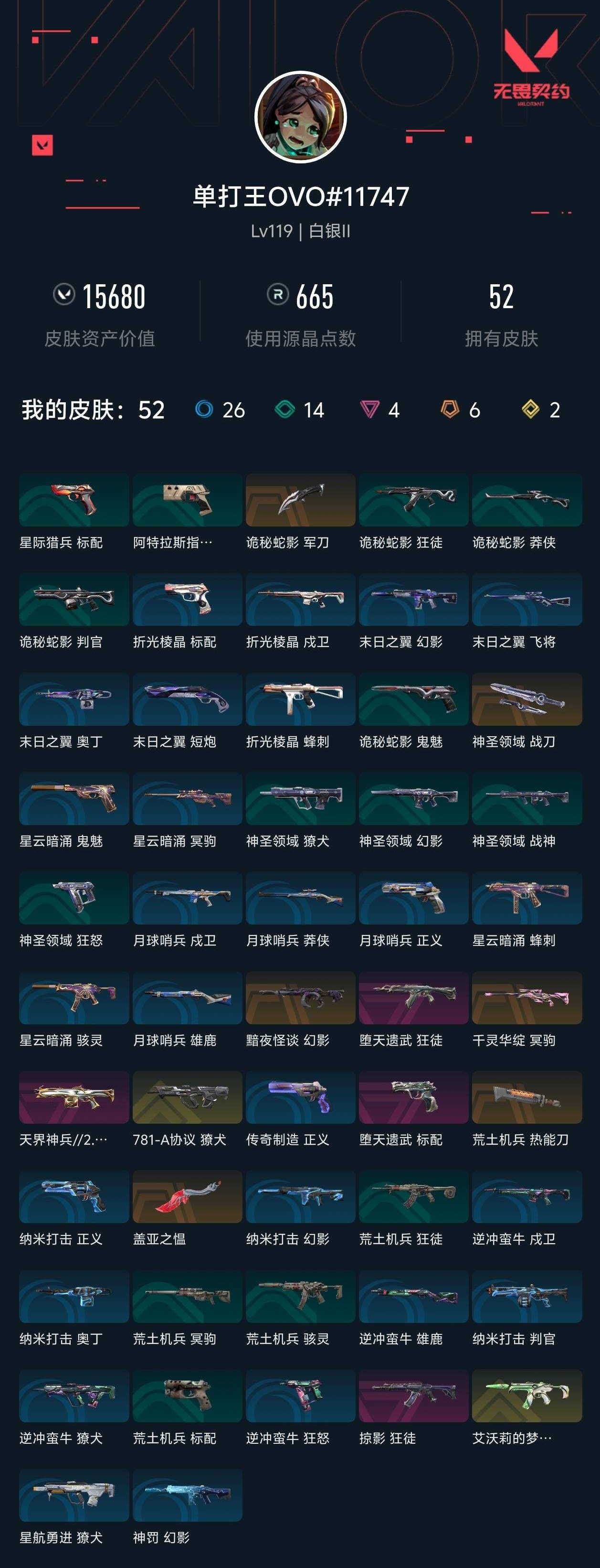 【无畏契约】【yhwww6648】等级:119,已用无畏点15680,已用源晶点665,金皮:獠犬-781-a协议|骇灵-艾沃莉的梦之翼__橙皮:幻影-黯夜怪谈|近战-盖亚之愠|冥驹-千灵华绽|近战-荒土机兵 热能刀|近战-神圣领域 战刀|近战-诡秘蛇影 军刀__紫皮:标配-堕天遗武|狂徒-堕天遗武|判官-天界神兵2.0|狂徒-掠影__段位:白银__蓝皮:判官-纳米打击|正义-纳米打击|奥丁-纳米打击|幻影-纳米打击|雄鹿-逆冲蛮牛|狂怒-逆冲蛮牛|戍卫-逆冲蛮牛|獠犬-逆冲蛮牛|鬼魅-星云暗涌|骇灵-星云暗涌|正义-月球哨兵|莽侠-月球哨兵|戍卫-月球哨兵|雄鹿-月球哨兵|獠犬-星航勇进|正义-传奇制造|幻影-神罚|冥驹-星云暗涌|蜂刺-星云暗涌|蜂刺-折光棱晶|戍卫-折光棱晶|标配-折光棱晶|飞将-末日之翼|幻影-末日之翼|短炮-末日之翼|奥丁-末日之翼|标配-阿特拉斯指挥部__绿皮:狂徒-荒土机兵|标配-荒土机兵|骇灵-荒土机兵|冥驹-荒土机兵|獠犬-神圣领域|狂怒-神圣领域|战神-神圣领域|幻影-神圣领域|判官-诡秘蛇影|鬼魅-诡秘蛇影|莽侠-诡秘蛇影|狂徒-诡秘蛇影|标配-星际猎兵__英雄:尚勃勒|维斯|黑梦|斯凯|暮蝶|壹决|幽影|夜露|钢锁|海神|奇乐|炼狱|铁臂|贤者|猎枭|钛狐|芮娜|捷风|不死鸟|幻棱|雷兹|禁灭
