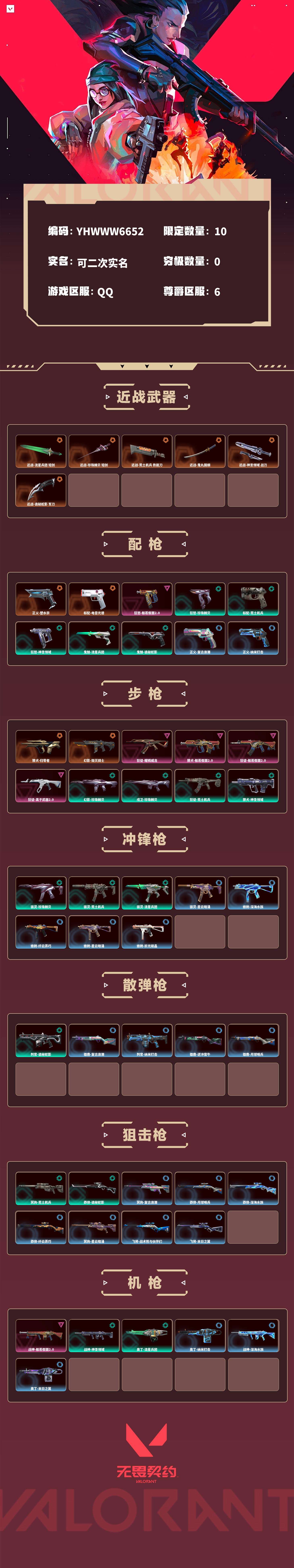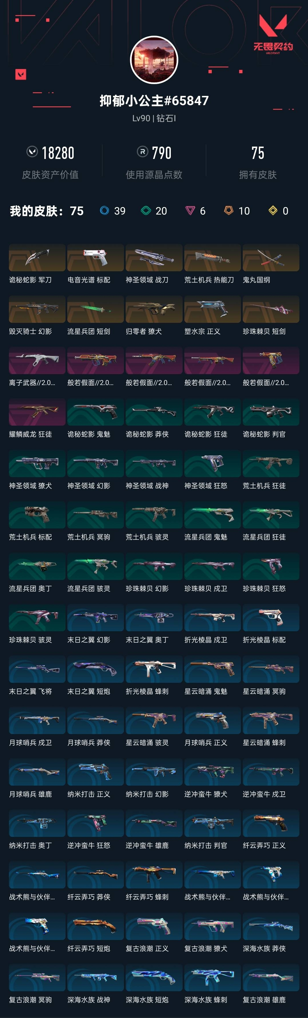 【无畏契约】【yhwww6652】等级:90,已用无畏点18280,已用源晶点790,橙皮:近战-流星兵团 短剑|近战-珍珠棘贝 短剑|獠犬-归零者|正义-塑水宗|近战-荒土机兵 热能刀|幻影-毁灭骑士|近战-鬼丸国纲|近战-神圣领域 战刀|近战-诡秘蛇影 军刀|标配-电音光谱__紫皮:狂徒-耀鳞威龙|战神-般若假面2.0|獠犬-般若假面2.0|狂徒-般若假面2.0|狂怒-般若假面2.0|狂徒-离子武器2.0__绿皮:骇灵-珍珠棘贝|幻影-珍珠棘贝|狂怒-珍珠棘贝|戍卫-珍珠棘贝|狂徒-荒土机兵|标配-荒土机兵|骇灵-荒土机兵|冥驹-荒土机兵|獠犬-神圣领域|狂怒-神圣领域|战神-神圣领域|幻影-神圣领域|骇灵-流星兵团|鬼魅-流星兵团|狂徒-流星兵团|奥丁-流星兵团|判官-诡秘蛇影|鬼魅-诡秘蛇影|莽侠-诡秘蛇影|狂徒-诡秘蛇影__蓝皮:獠犬-复古浪潮|冥驹-复古浪潮|雄鹿-复古浪潮|正义-复古浪潮|判官-纳米打击|正义-纳米打击|奥丁-纳米打击|幻影-纳米打击|雄鹿-逆冲蛮牛|狂怒-逆冲蛮牛|戍卫-逆冲蛮牛|獠犬-逆冲蛮牛|鬼魅-星云暗涌|骇灵-星云暗涌|正义-月球哨兵|莽侠-月球哨兵|戍卫-月球哨兵|雄鹿-月球哨兵|战神-深海水族|短炮-深海水族|蜂刺-深海水族|莽侠-深海水族|莽侠-纤云弄巧|正义-纤云弄巧|短炮-纤云弄巧|蜂刺-纤云弄巧|冥驹-星云暗涌|蜂刺-星云暗涌|飞将-战术熊与伙伴们|狂怒-战术熊与伙伴们|戍卫-战术熊与伙伴们|标配-战术熊与伙伴们|蜂刺-折光棱晶|戍卫-折光棱晶|标配-折光棱晶|飞将-末日之翼|幻影-末日之翼|短炮-末日之翼|奥丁-末日之翼__段位:钻石__英雄:尚勃勒|维斯|黑梦|斯凯|暮蝶|盖可|霓虹|壹决|星礈|幽影|夜露|钢锁|海神|奇乐|炼狱|铁臂|贤者|猎枭|钛狐|芮娜|零|捷风|蝰蛇|不死鸟|幻棱|雷兹